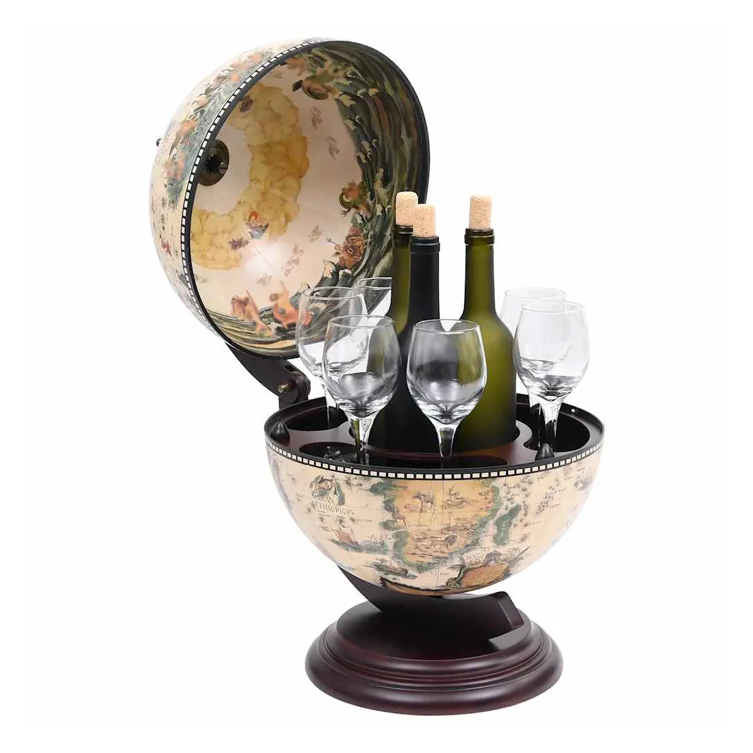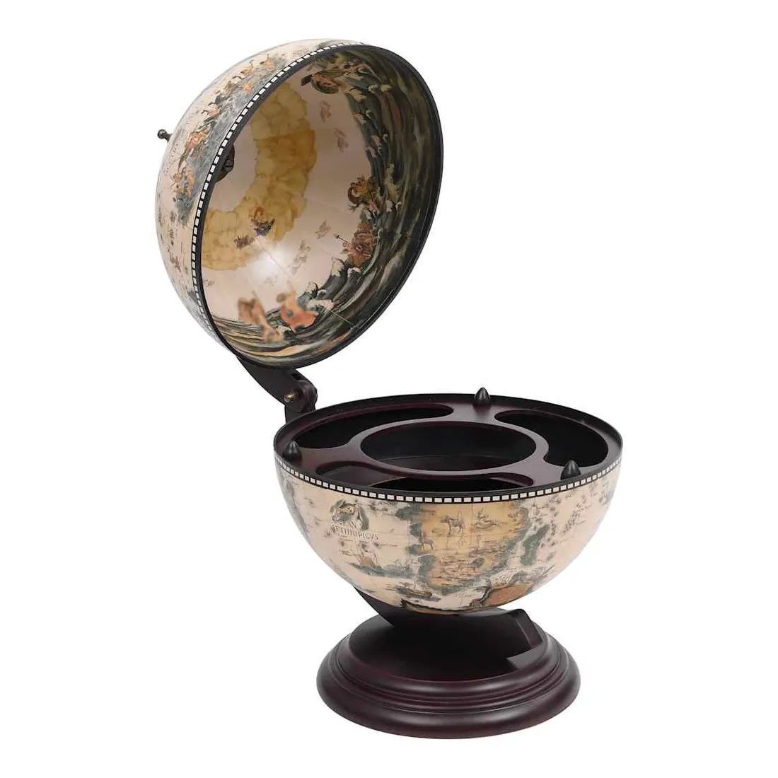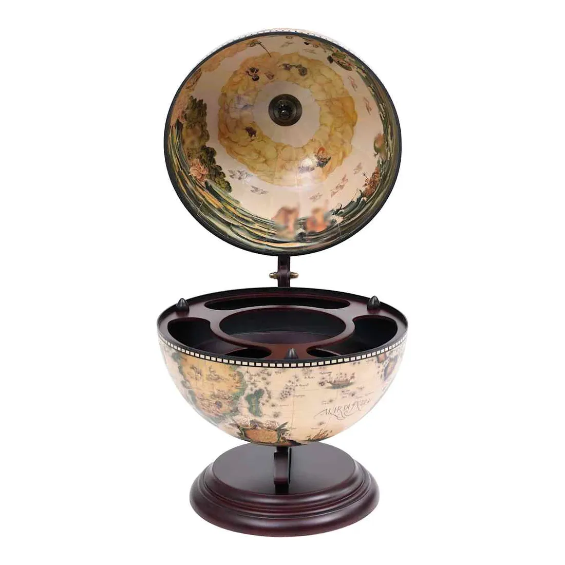 Le bar globe en bois s'ouvre pour révéler un grand bar tournant avec beaucoup d'espace pour le vin, les spiritueux, la boisson et les verres à pied, ainsi vous pouvez afficher votre vin et verres dans l'ordre dans l'espace caché tout en assurant l'accès facile. La surface extérieure du globe est recouverte de répliques de cartes nautiques du 16ème siècle, et les fresques de répliques antiques à l'intérieur, faisant du bar sous forme de globe une œuvre d'art et une jolie décoration pour la maison ou le bureau. Ce bar sous forme de globe est sans aucun doute une combinaison parfaite de fonctions de stockage et esthétiques.