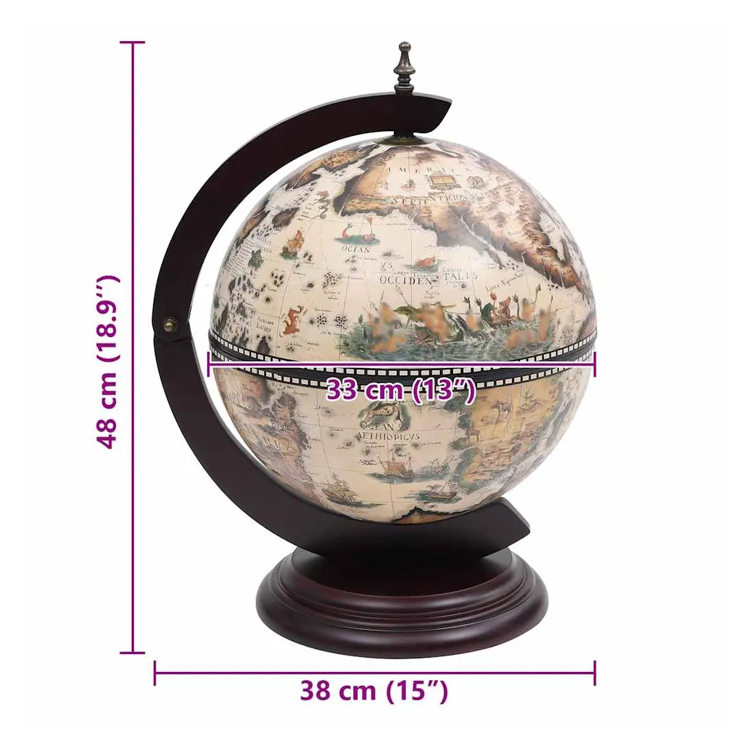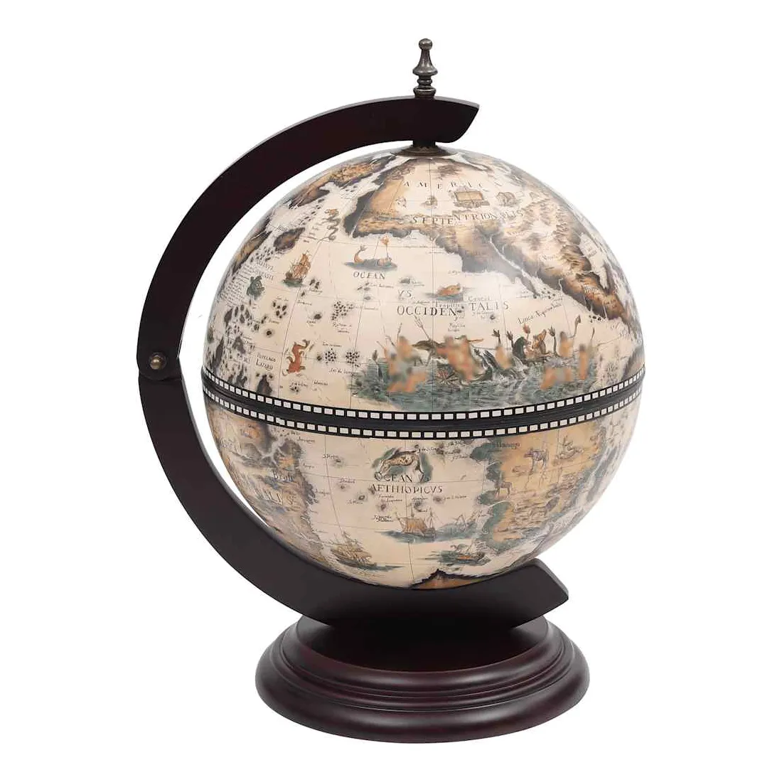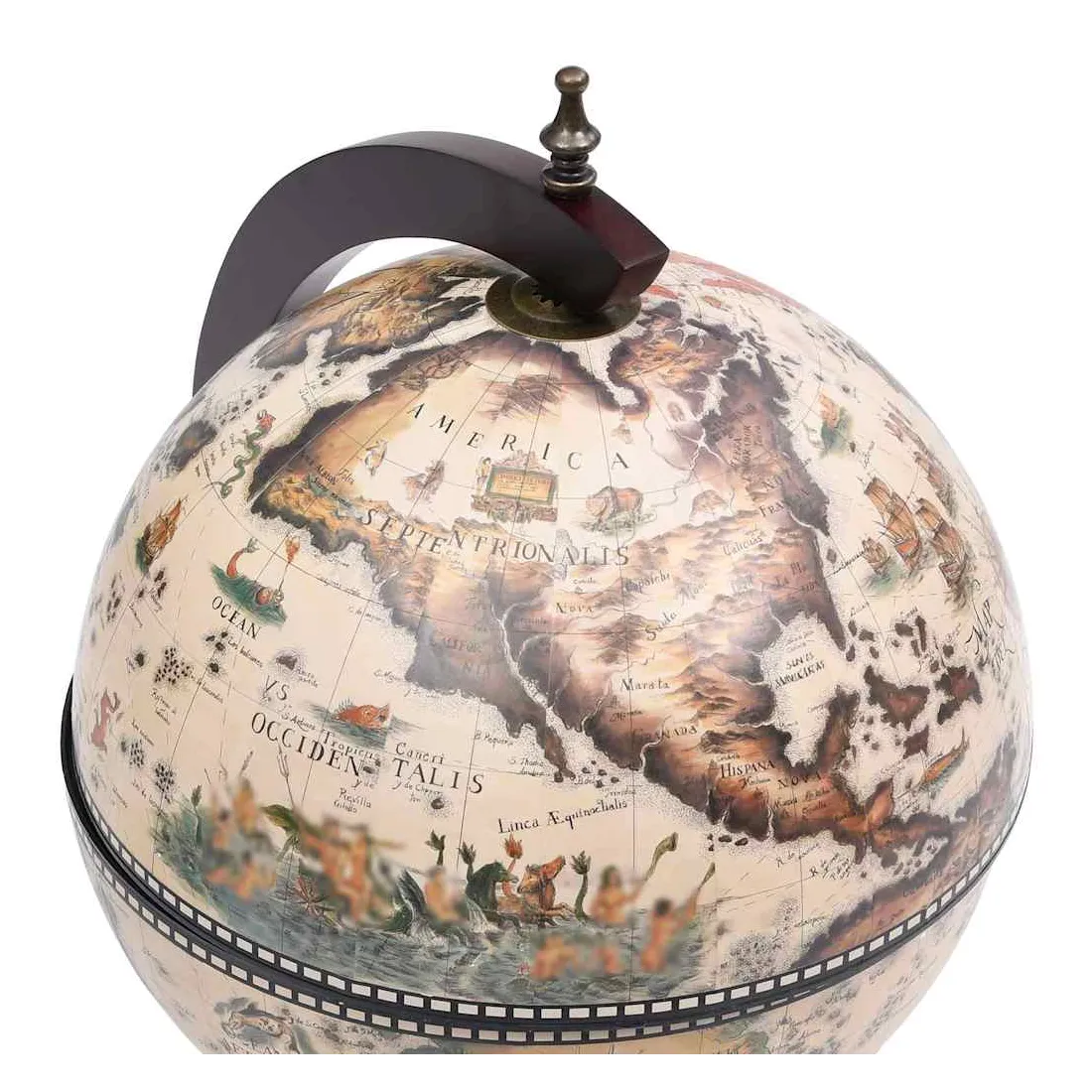 Le bar globe en bois s'ouvre pour révéler un grand bar tournant avec beaucoup d'espace pour le vin, les spiritueux, la boisson et les verres à pied, ainsi vous pouvez afficher votre vin et verres dans l'ordre dans l'espace caché tout en assurant l'accès facile. La surface extérieure du globe est recouverte de répliques de cartes nautiques du 16ème siècle, et les fresques de répliques antiques à l'intérieur, faisant du bar sous forme de globe une œuvre d'art et une jolie décoration pour la maison ou le bureau. Ce bar sous forme de globe est sans aucun doute une combinaison parfaite de fonctions de stockage et esthétiques.