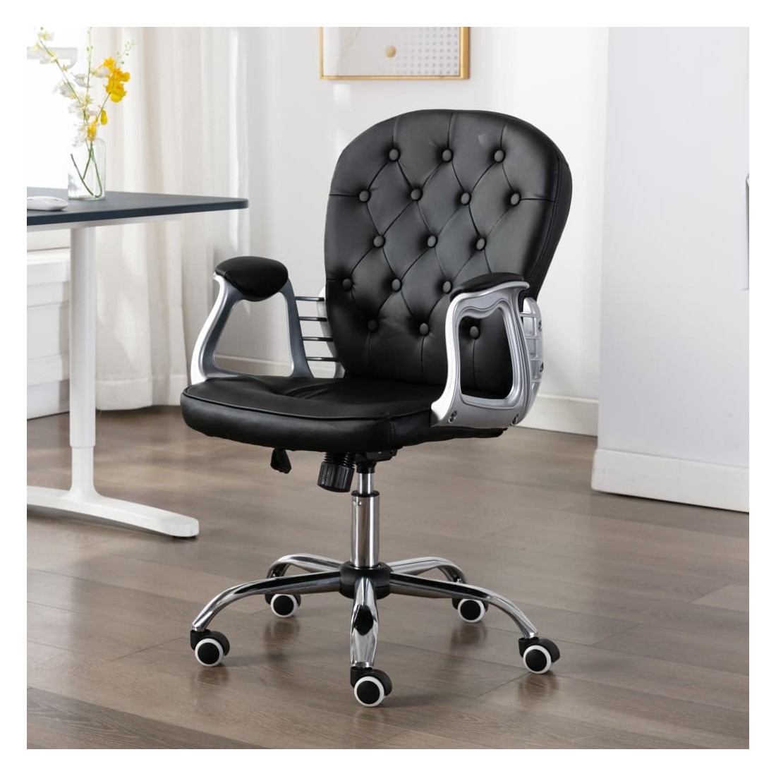 Notre chaise de bureau réglable, au design élégant et moderne, est un complément pratique au salon, à la chambre d'étude ou au bureau. Ce siège et ce dossier épais et rembourrés sont recouverts de similicuir doux au toucher, ce qui le rend facile à nettoyer et ajoute un confort ultime. Grâce au mécanisme de vérin à gaz, cette chaise peut être ajustée de 91 à 101 cm pour répondre à vos différents besoins. Elle peut être déplacée facilement grâce aux roues intégrées.
