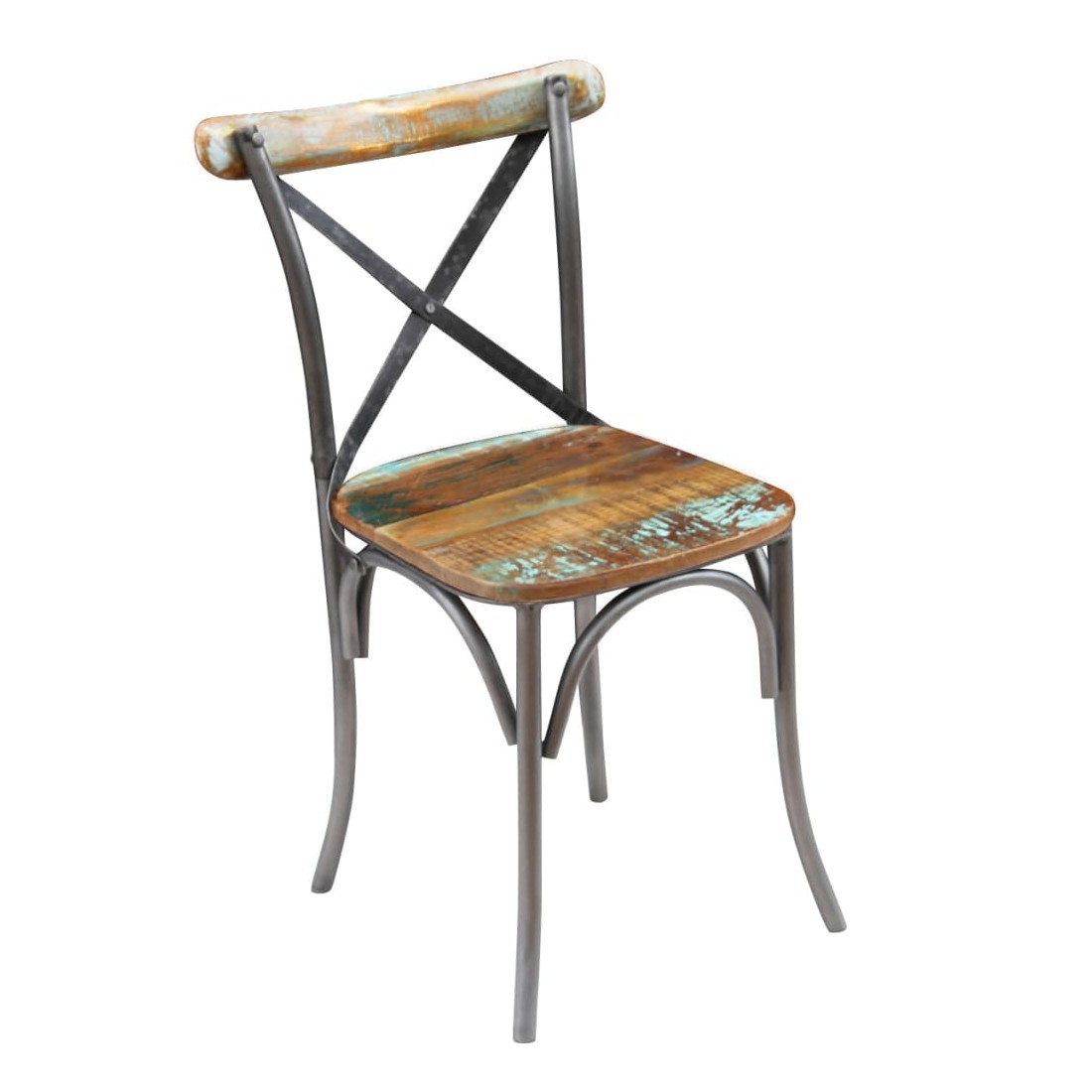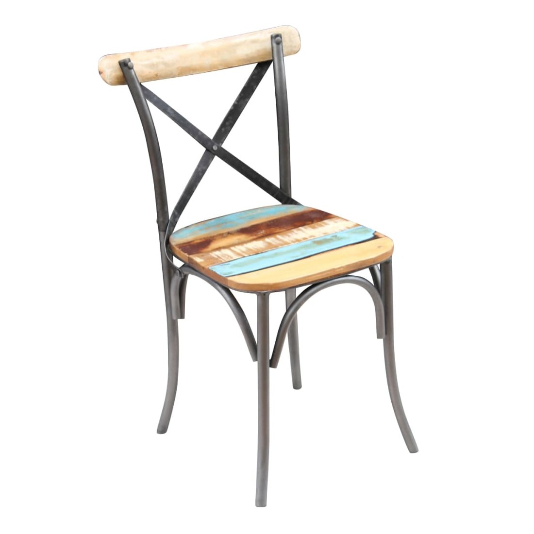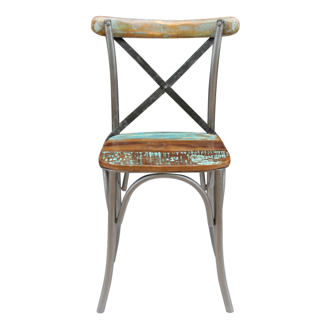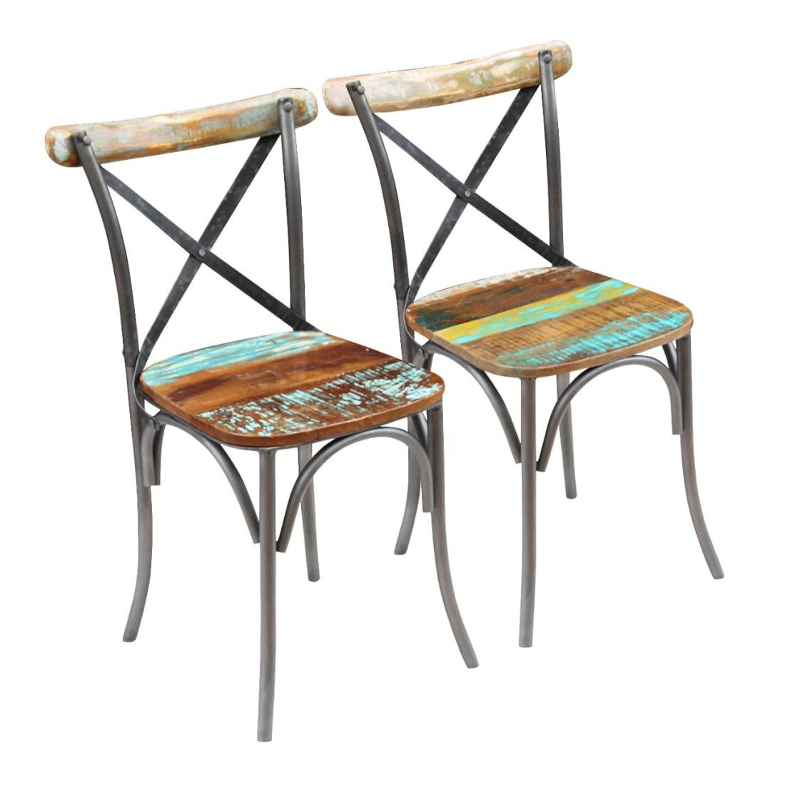 Cet ensemble de 2 chaises à manger, en bois de style antique, sera un supplément unique à votre salle à manger. Leur cadre en acier rend les chaises stables et robustes. Ces chaises de style antique sont fabriquées en bois de récupération massif, ce qui signifie que chaque meuble est unique et légèrement différent l'un d'un autre. Les meubles en bois de récupération ont les caractéristiques de différents bois comme le teck, le bois de manguier et l'acacia. Le bois de récupération est massif, stable, durable et magnifique. Des signes d'usure et une structure de grain visible donnent à chaque pièce sa propre histoire et un aspect unique. L'ensemble de chaises est entièrement fait à la main et chaque étape du processus est effectué avec le plus grand soin. La conception de dossier ouvert et la finition de peinture multicolore s'ajoutent à leur style rétro spectaculaire. Remarque importante : les couleurs varient d'une pièce à l'autre, rendant chacune de nos chaises à manger unique. La livraison est aléatoire. La livraison comprend 2 chaises de salle à manger.