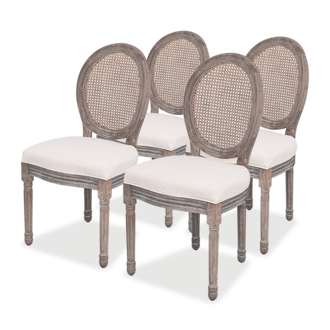 Ces chaises de salle à manger agréablement conçues en lin de haute qualité seront un ajout idéal à votre décor intérieur. Elles offrent une place d'assise confortable pour dîner avec votre famille dans la salle à manger ou lire et vous détendre dans le salon. Les sièges épaississement rembourrés en mousse sont capitonnés en tissu de lin. Ces chaises de salle à manger en lin disposent d'un dossier en rotin qui leur confère un charme rustique. Les cadres et les pieds en bois rendent les chaises très stables et durables. La livraison comprend 4 chaises.