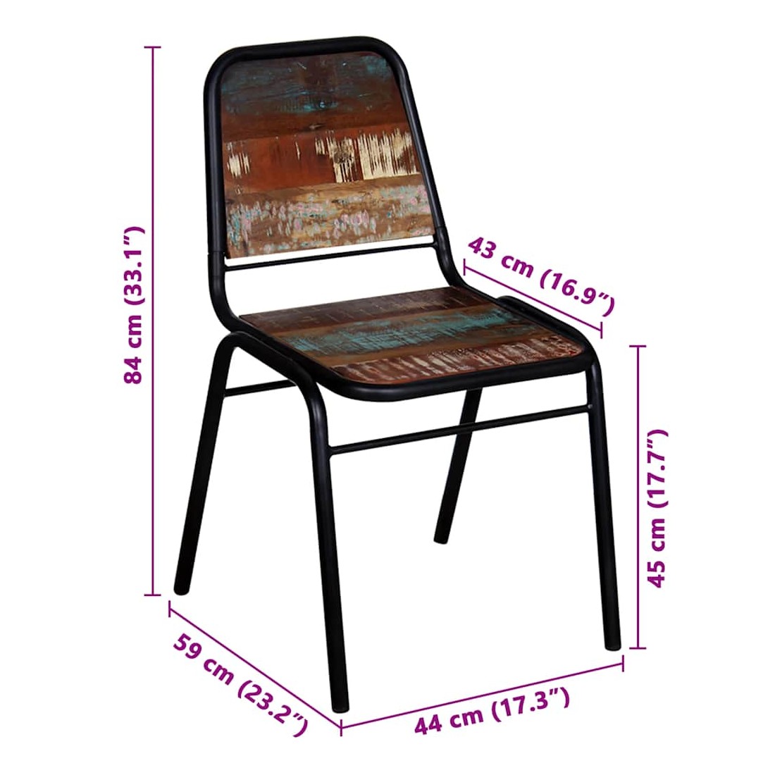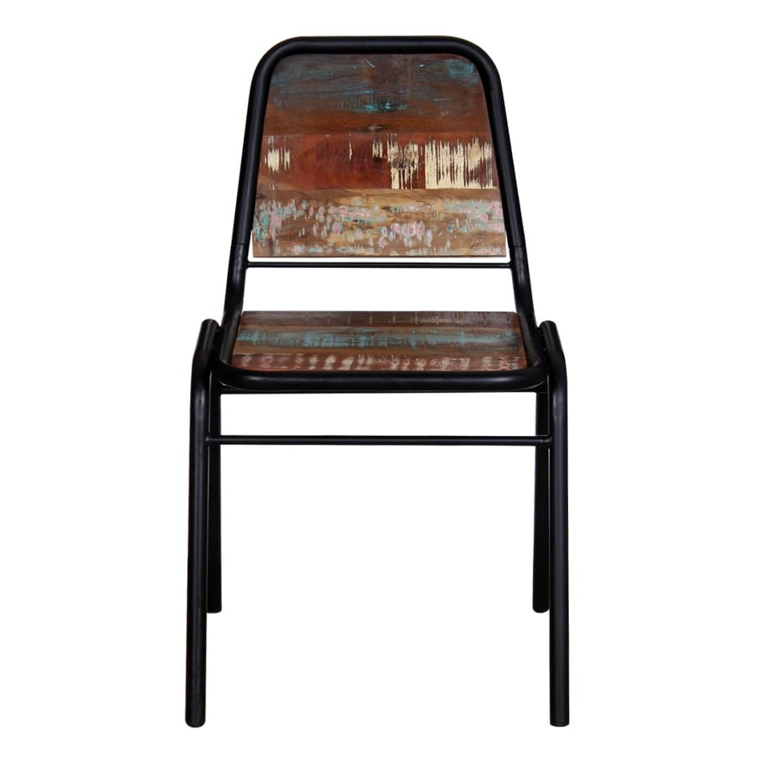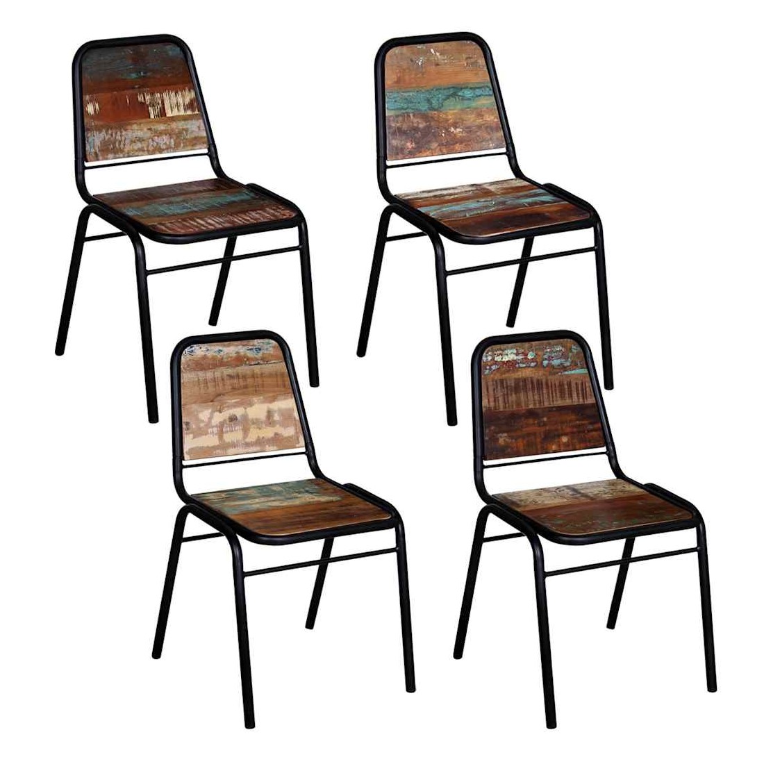 Cet ensemble de chaises de salle à manger en bois de style antique sera un supplément unique à votre cuisine ou salle à manger. Sa construction en acier enduit de poudre le rend stable et robuste. Ces chaises de style vintage sont fabriquées en bois de récupération massif, ce qui signifie que chaque meuble est unique et légèrement différent l'un de l'autre. Les meubles en bois de récupération ont les caractéristiques de différents bois comme le teck, le bois de manguier et l'acacia. Le bois de récupération est solide, stable, durable et beau. Des signes d'usure et une structure de grain visible rendent chaque meuble unique et légèrement différent l'un de l'autre. Cet ensemble de chaises est fait à la main et la qualité du travail d'artisanat contribue à son style rétro spectaculaire. Chaque étape du processus est effectuée avec le plus grand soin, qu'il s'agisse du polissage, de la peinture ou du cirage. La livraison comprend 4 chaises à manger. Remarque importante : les couleurs varient d'une pièce à l'autre, rendant chacune de nos chaises à manger unique. La livraison est aléatoire, ce qui garantit l'exclusivité et l'individualité de votre produit.