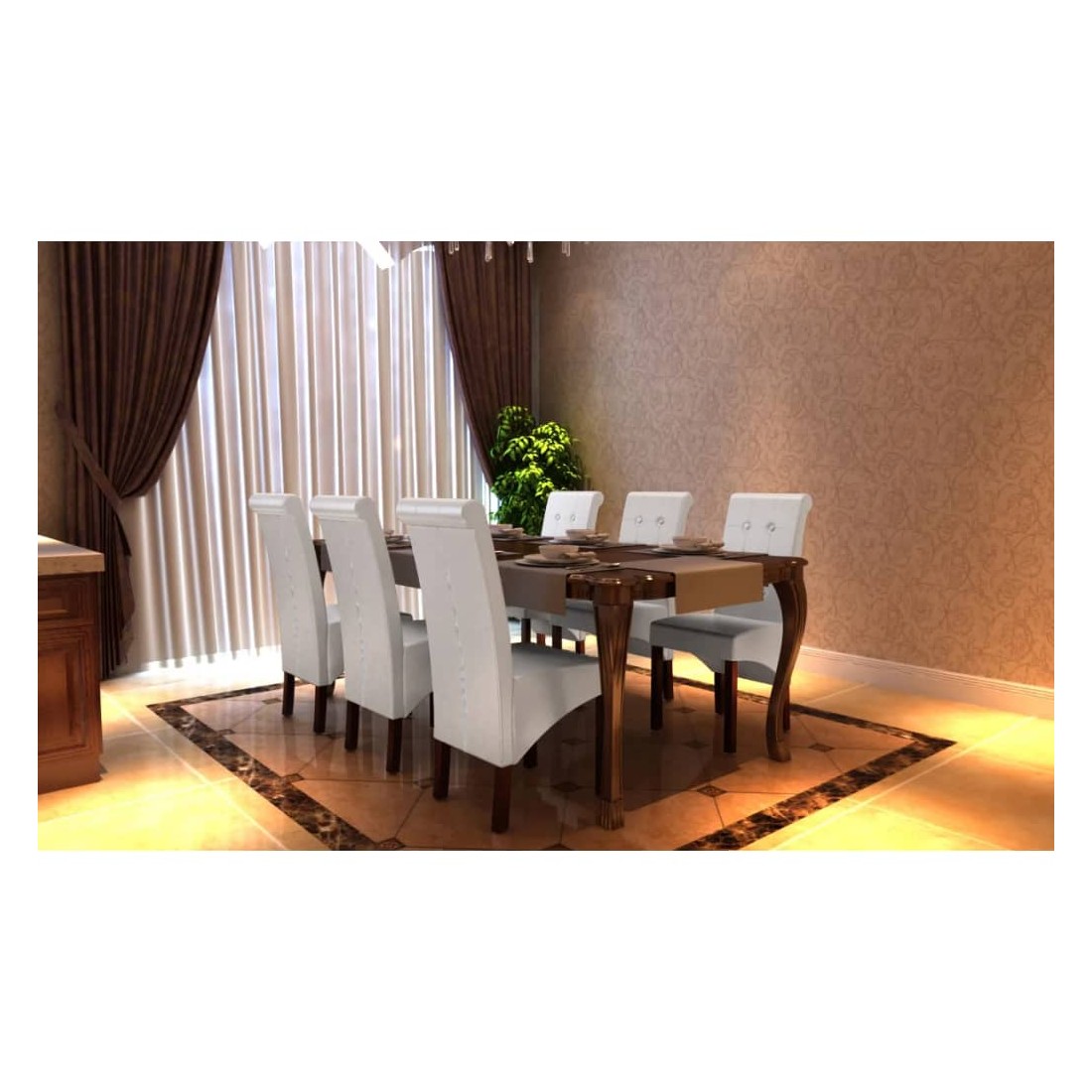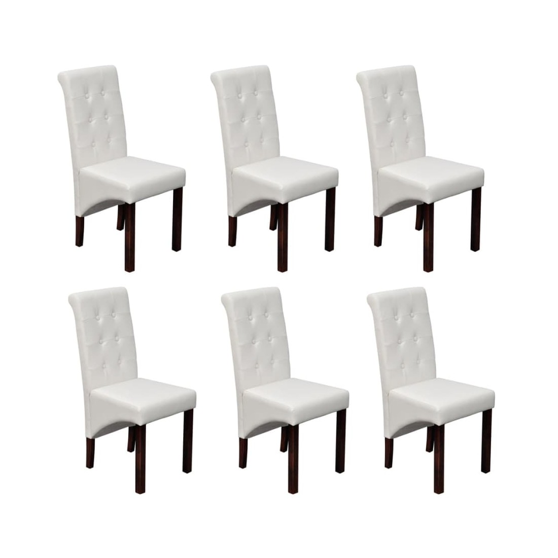 Cet ensemble de 6 chaises de salle à manger, confortables et grandes, a un design antique et les chaises ont des sièges et des dossiers ergonomiques. Les jambes sont faites de bois solide dans une couleur brun foncé vernie et les coins sont arrondis pour la sûreté. Les chaises peuvent être entretenues et nettoyées facilement. Les sièges et le dossier de ces chaises sont rembourrés de cuir synthétique durable.