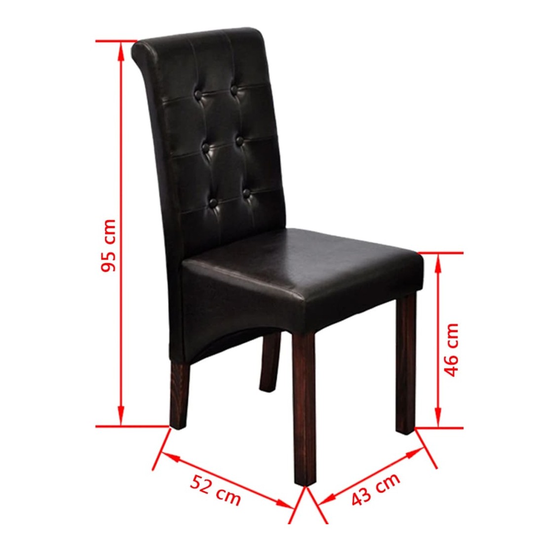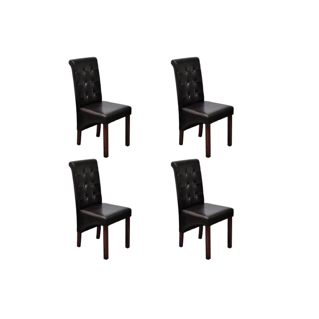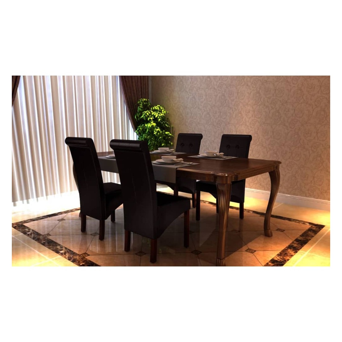 Cet ensemble de 4 chaises de salle à manger, confortables et grandes, a un design antique et les chaises ont des sièges et des dossiers ergonomiques. Les jambes sont faites de bois solide dans une couleur brun foncé vernie et les coins sont arrondis pour la sûreté. Les chaises peuvent être entretenues et nettoyées facilement. Les sièges et le dossier de ces chaises sont rembourrés de cuir synthétique durable.