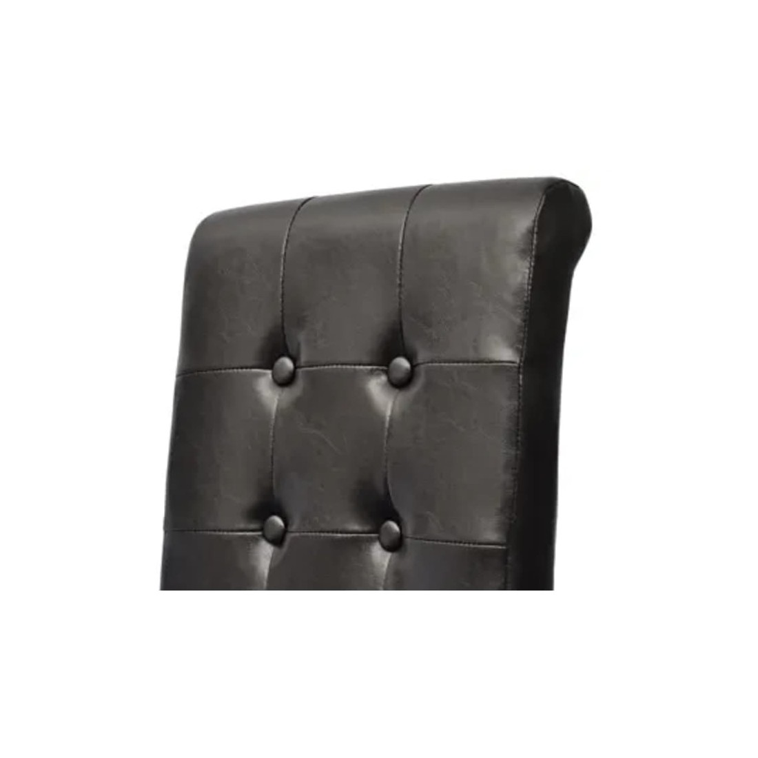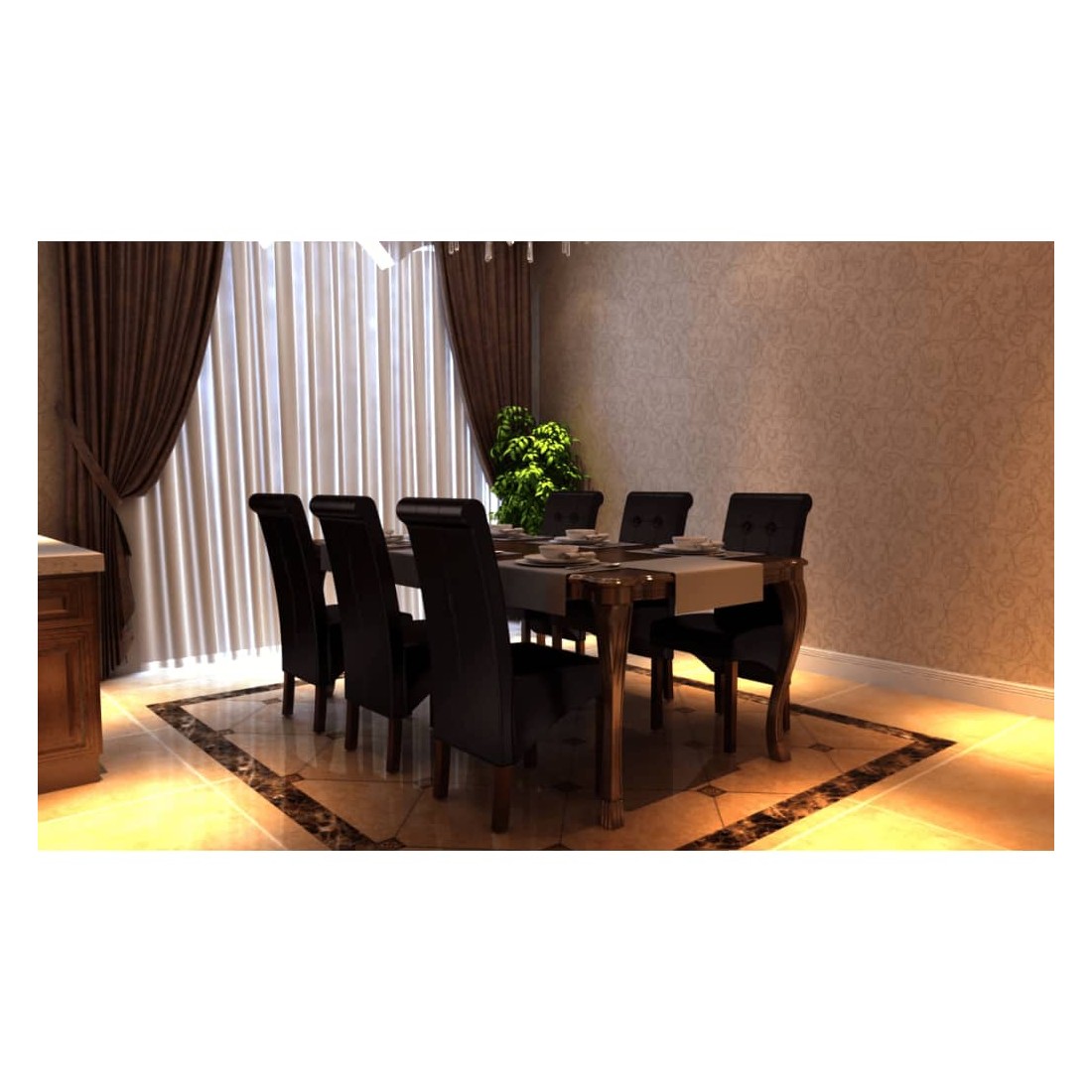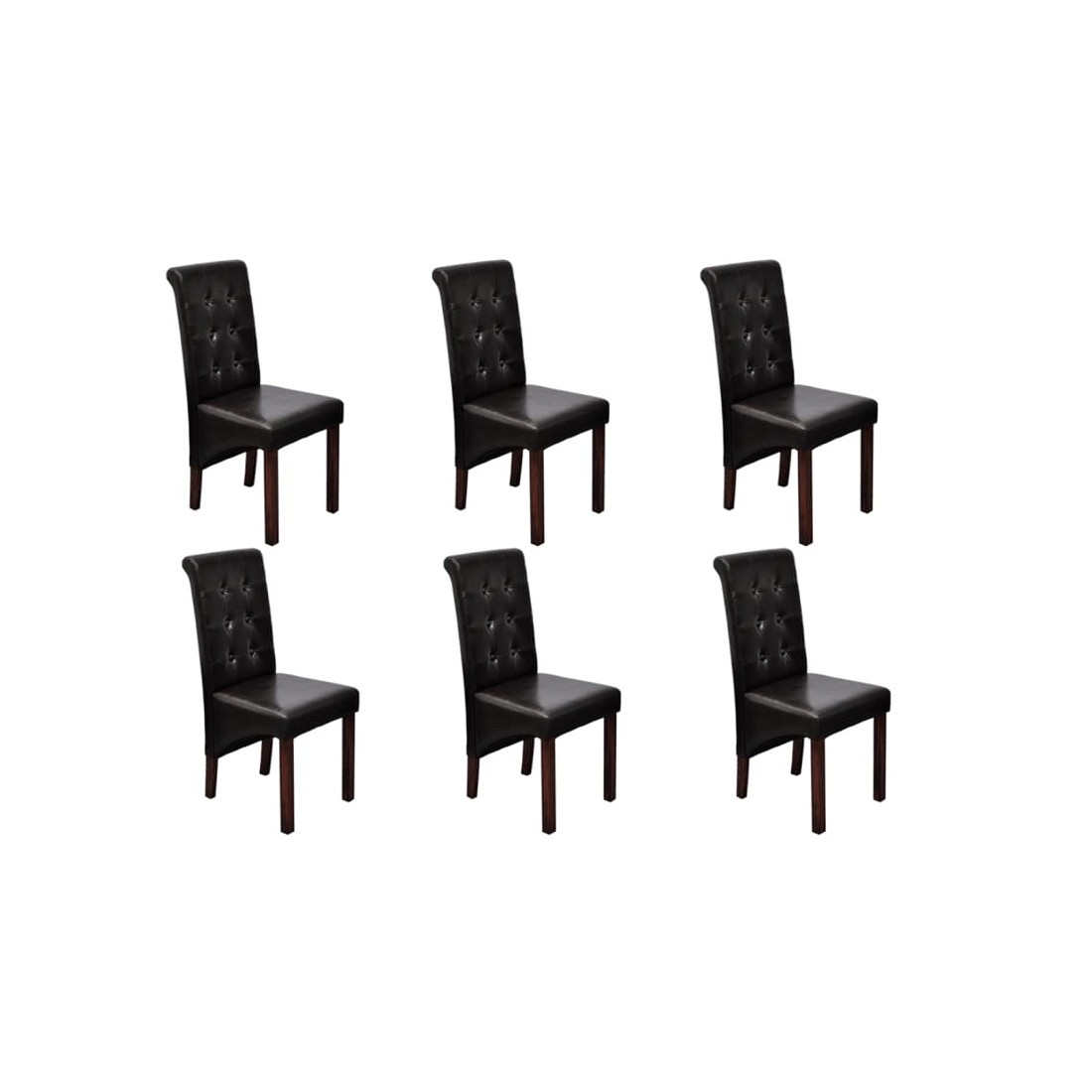 Cet ensemble de 6 chaises de salle à manger, confortables et grandes, a un design antique et les chaises ont des sièges et des dossiers ergonomiques. Les jambes sont faites de bois solide dans une couleur brun foncé vernie et les coins sont arrondis pour la sûreté. Les chaises peuvent être entretenues et nettoyées facilement. Les sièges et le dossier de ces chaises sont rembourrés de cuir synthétique durable.