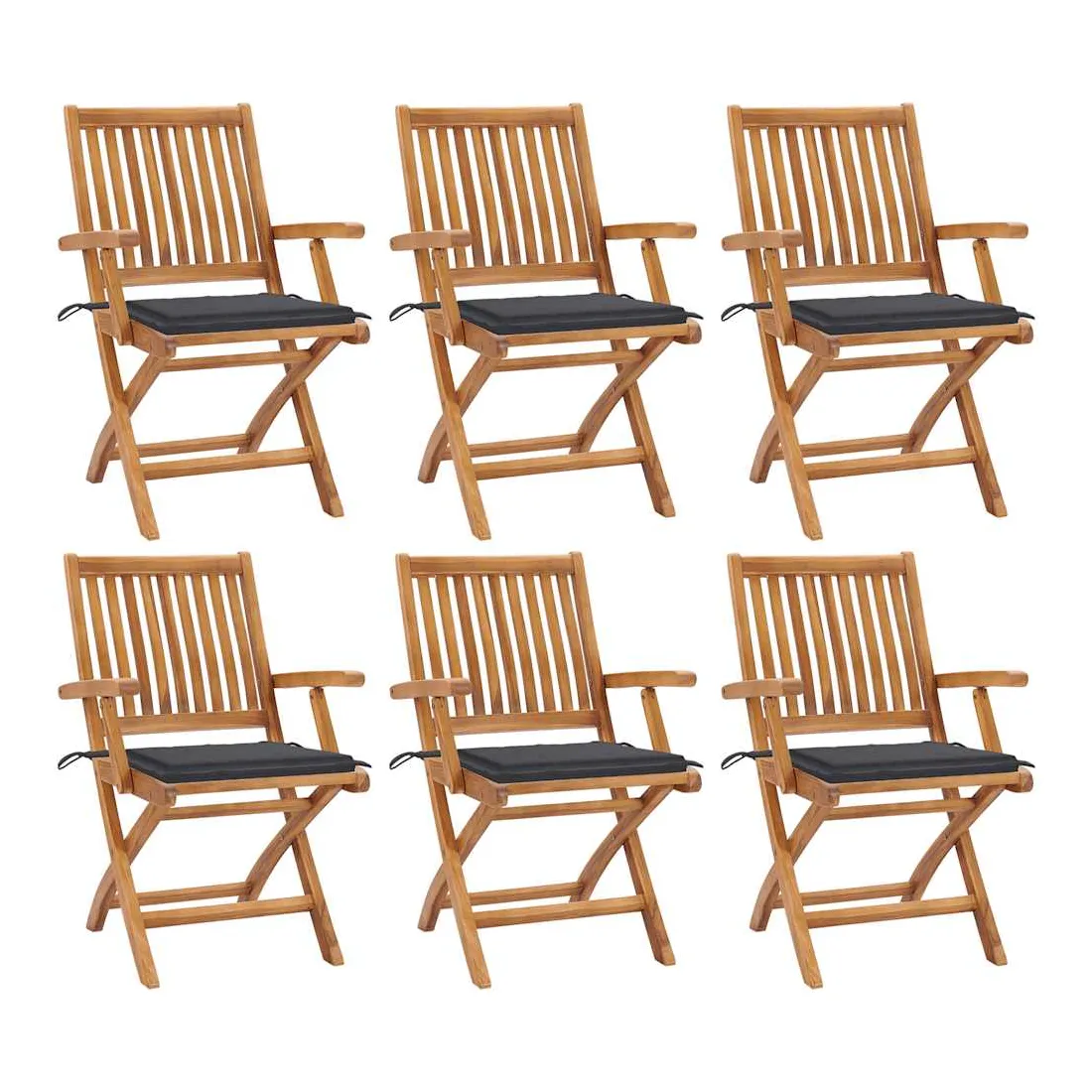 Cet ensemble de chaises de jardin en bois présente un design intemporel. Les chaises d’extérieur conviennent à tous les environnements, tels que les maisons, les bureaux, les bars et les cafés, grâce à leur design simple mais élégant. Fabriqué en bois dur de teck extrêmement durable, cet ensemble de meubles en teck a été chevronné, séché au four puis finement poncé pour lui donner un aspect très lisse. Le bois de teck est connu pour sa résistance exceptionnelle aux intempéries, ce qui le rend bien plus adapté aux meubles de jardin que tout autre type de bois. Le bois de teck est le choix idéal si vous souhaitez acheter un meuble de jardin durable. Grâce à la surface sablée, les chaises de salle à manger sont résistantes aux intempéries et faciles à nettoyer. Elles peuvent également être pliées pour économiser de l’espace de stockage lorsqu'elles ne sont pas utilisées. De plus, les coussins fournis offrent un confort supplémentaire. Chaque coussin dispose de 2 ensembles de cordes pour le fixer solidement sur la chaise. Remarque : afin de prolonger la durée de vie de vos meubles d'extérieur, nous vous recommandons de les nettoyer régulièrement et de ne pas les laisser à l'extérieur sans protection inutilement.Nettoyage : utiliser une solution savonneuse douceStockage : si possible, stockez dans un endroit frais et sec à l'intérieur. Si le produit est stocké à l'extérieur, protégez-le avec une housse imperméable. Essuyez et séchez l'excès d'eau ou de neige des surfaces planes après la pluie ou une chute de neige. Permettez une circulation d'air suffisante afin d'éviter les dommages liés à l'humidité.