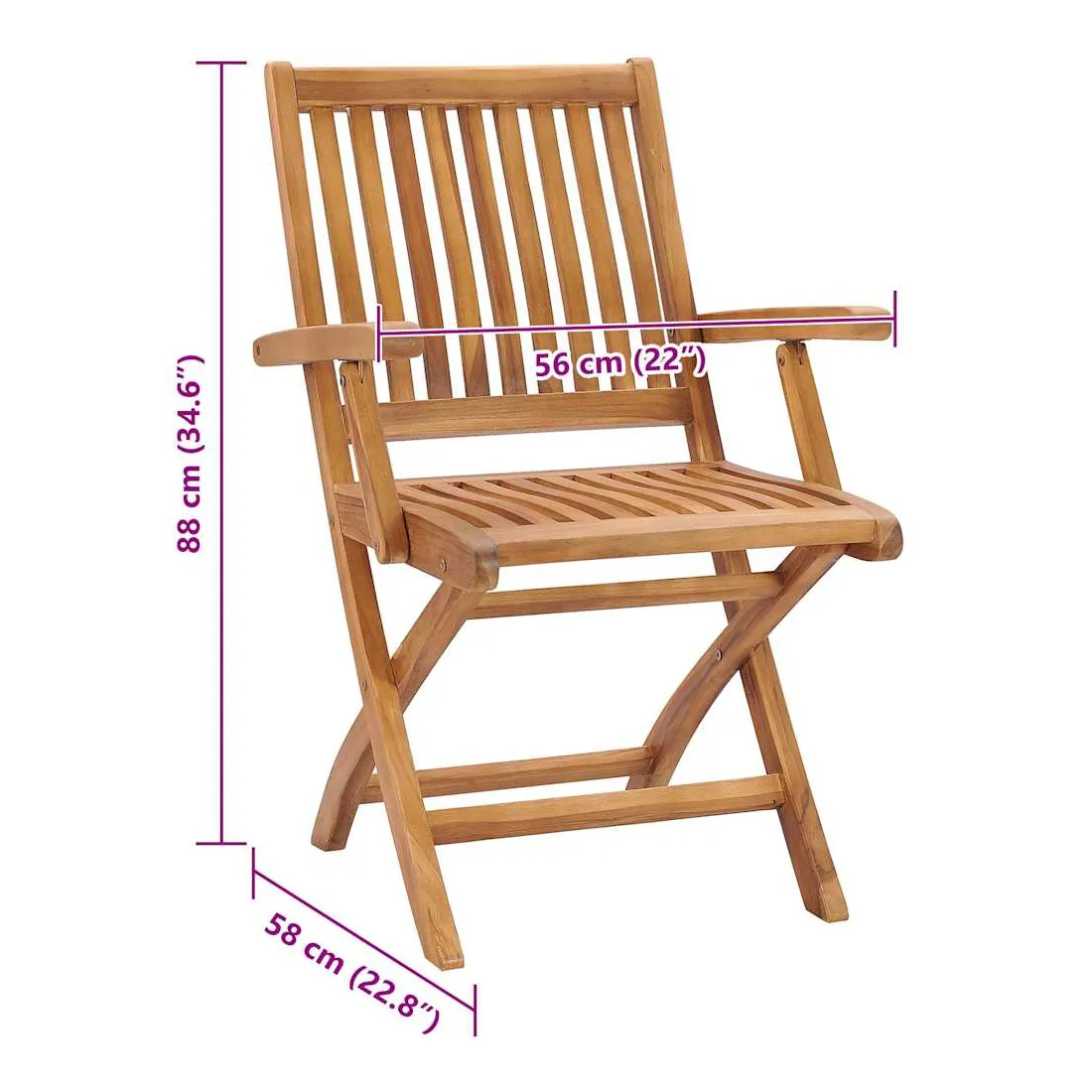 Cet ensemble de chaises de jardin en bois présente un design intemporel. Les chaises d’extérieur conviennent à tous les environnements, tels que les maisons, les bureaux, les bars et les cafés, grâce à leur design simple mais élégant. Fabriqué en bois dur de teck extrêmement durable, cet ensemble de meubles en teck a été chevronné, séché au four puis finement poncé pour lui donner un aspect très lisse. Le bois de teck est connu pour sa résistance exceptionnelle aux intempéries, ce qui le rend bien plus adapté aux meubles de jardin que tout autre type de bois. Le bois de teck est le choix idéal si vous souhaitez acheter un meuble de jardin durable. Grâce à la surface sablée, les chaises de salle à manger sont résistantes aux intempéries et faciles à nettoyer. Elles peuvent également être pliées pour économiser de l’espace de stockage lorsqu'elles ne sont pas utilisées. De plus, les coussins fournis offrent un confort supplémentaire. Chaque coussin dispose de 2 ensembles de cordes pour le fixer solidement sur la chaise. Remarque : afin de prolonger la durée de vie de vos meubles d'extérieur, nous vous recommandons de les nettoyer régulièrement et de ne pas les laisser à l'extérieur sans protection inutilement.Nettoyage : utiliser une solution savonneuse douceStockage : si possible, stockez dans un endroit frais et sec à l'intérieur. Si le produit est stocké à l'extérieur, protégez-le avec une housse imperméable. Essuyez et séchez l'excès d'eau ou de neige des surfaces planes après la pluie ou une chute de neige. Permettez une circulation d'air suffisante afin d'éviter les dommages liés à l'humidité.