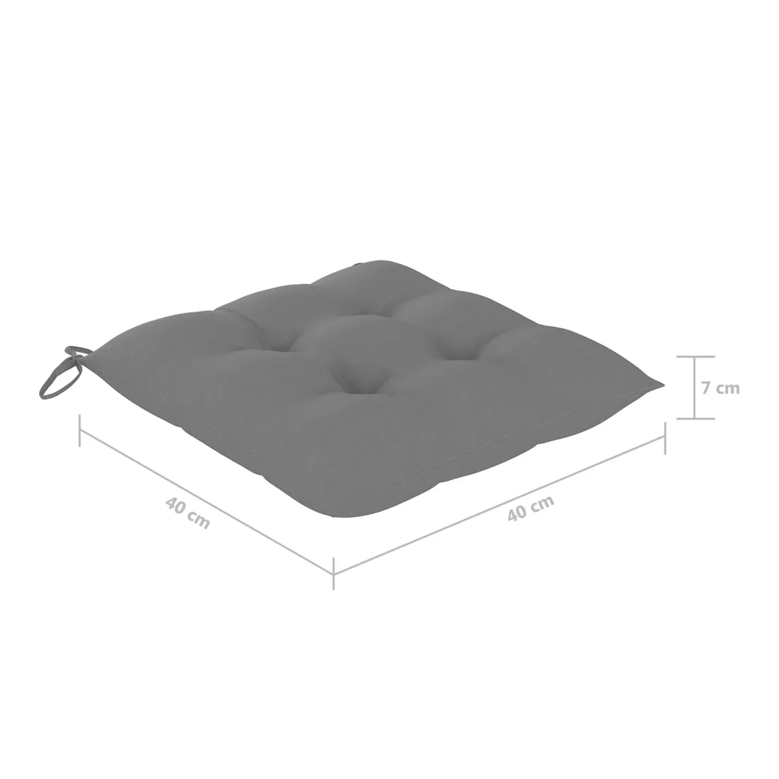 Cet ensemble de chaises de jardin en bois présente un design intemporel. Les chaises d’extérieur conviennent à tous les environnements, tels que les maisons, les bureaux, les bars et les cafés, grâce à leur design simple mais élégant. Fabriqué en bois dur de teck extrêmement durable, cet ensemble de meubles en teck a été chevronné, séché au four puis finement poncé pour lui donner un aspect très lisse. Le bois de teck est connu pour sa résistance exceptionnelle aux intempéries, ce qui le rend bien plus adapté aux meubles de jardin que tout autre type de bois. Le bois de teck est le choix idéal si vous souhaitez acheter un meuble de jardin durable. Grâce à la surface sablée, les chaises de salle à manger sont résistantes aux intempéries et faciles à nettoyer. Elles peuvent également être pliées pour économiser de l’espace de stockage lorsqu'elles ne sont pas utilisées. De plus, les coussins fournis offrent un confort supplémentaire. Chaque coussin dispose de 2 ensembles de cordes pour le fixer solidement sur la chaise. Remarque : afin de prolonger la durée de vie de vos meubles d'extérieur, nous vous recommandons de les nettoyer régulièrement et de ne pas les laisser à l'extérieur sans protection inutilement.Nettoyage : utiliser une solution savonneuse douceStockage : si possible, stockez dans un endroit frais et sec à l'intérieur. Si le produit est stocké à l'extérieur, protégez-le avec une housse imperméable. Essuyez et séchez l'excès d'eau ou de neige des surfaces planes après la pluie ou une chute de neige. Permettez une circulation d'air suffisante afin d'éviter les dommages liés à l'humidité.