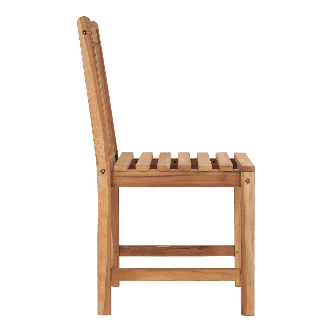 Cet ensemble de chaises de jardin en bois robuste sera un endroit idéal pour vous détendre et profiter du soleil dans votre jardin ou patio. Fabriquée en bois dur de teck extrêmement durable, cette pièce de meuble en teck a été chevronnée, séchée au four puis finement poncée pour lui donner un aspect très lisse. Le bois de teck est connu pour sa résistance exceptionnelle aux intempéries, ce qui le rend bien plus adapté aux meubles de jardin que tout autre type de bois. Le bois de teck est le choix idéal si vous souhaitez acheter un meuble de jardin durable. Une belle finition à base d’eau est appliquée pour donner au bois une couleur chaude. Les chaises d’extérieur stables disposent d’un aspect raffiné qui peut instantanément se fondre dans n’importe quel espace de vie. Le coussin inclus est pratique et a une fonction décorative. Remarque : Afin de prolonger la durée de vie de vos meubles d'extérieur, nous vous recommandons de les nettoyer régulièrement et de ne pas les laisser à l'extérieur sans protection inutilement.Nettoyage : Utiliser une solution savonneuse douceStockage : Si possible, stockez dans un endroit frais et sec à l'intérieur. Si le produit est stocké à l'extérieur, protégez-le avec une housse imperméable. Essuyez et séchez l'excès d'eau ou de neige des surfaces planes après la pluie ou une chute de neige. Permettez une circulation d'air suffisante afin d'éviter les dommages liés à l'humidité.