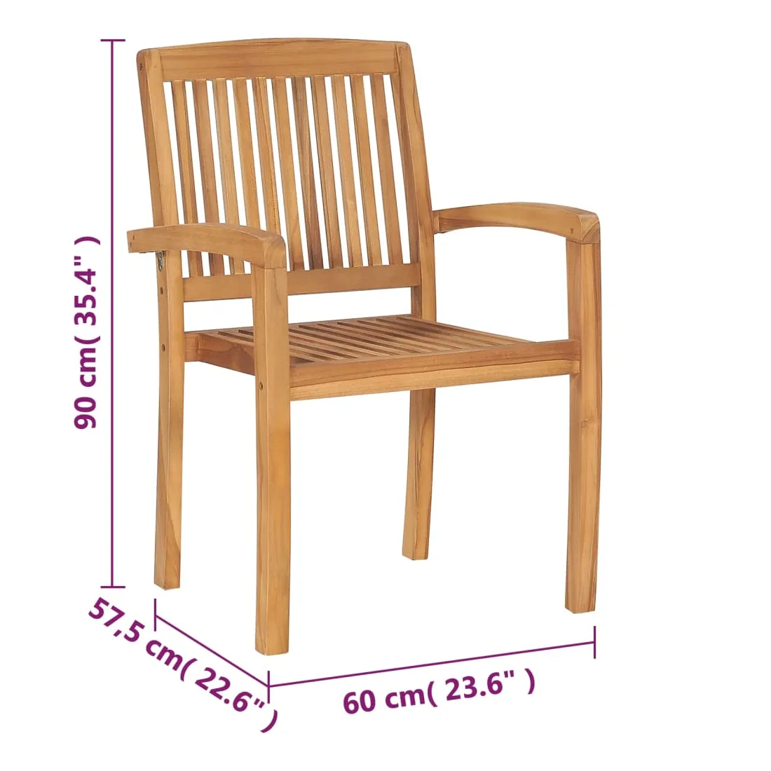 Ajoutez une touche de charme rustique à votre salle à manger, jardin ou terrasse avec ces chaises empilables de jardin intelligemment conçues ! Robuste et stable : le bois de teck massif est un matériau naturel magnifique. Il a été chevronné, séché au four, puis sablé finement pour lui donner une apparence très lisse. Le bois de teck est connu pour sa résistance exceptionnelle et sa résistance aux intempéries.Facile à entretenir : grâce à sa surface lisse, le banc en bois se nettoie facilement à l'aide d'un chiffon humide et nécessite peu d'entretien.Conception pratique : ces chaises de salle à manger peuvent être facilement pliées lorsqu'elles ne sont pas utilisées et ne prendront pas trop de place. Bon à savoir :Pour que vos meubles d'extérieur restent beaux, nous vous recommandons de les protéger avec une housse imperméable.