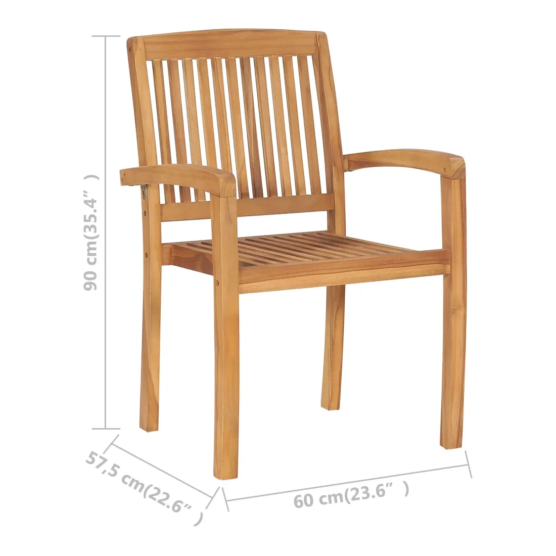Ajoutez une touche de charme rustique à votre salle à manger, jardin ou terrasse avec cet ensemble de chaises de jardin empilables avec ensemble de coussins ! La chaise de salle à manger élève votre espace de vie intérieur ou extérieur à un niveau supérieur avec un design à lattes et élégant. Cet ensemble de meubles en teck est fabriqué à partir de bois dur de teck extrêmement durable et est chevronné, séché au four et poncé finement pour lui donner un aspect très lisse. Le bois de teck est connu pour sa solidité et sa résistance aux intempéries exceptionnelles, ce qui le rend bien plus adapté aux meubles de jardin que tout autre type de bois. Le bois de teck est le choix parfait si vous souhaitez acheter un meuble de jardin durable. Il est facile à entretenir et à nettoyer avec un chiffon humide. De plus, la chaise de salle à manger peut être empilée pour économiser de l'espace de stockage lorsqu'elle n'est pas utilisée. De plus, les coussins inclus offrent un confort supplémentaire. Chaque coussin a 2 jeux de cordes pour le fixer fermement sur la chaise. Remarque : afin de prolonger la durée de vie de vos meubles d'extérieur, nous vous recommandons de les nettoyer régulièrement et de ne pas les laisser à l'extérieur sans protection inutilement.Nettoyage : utiliser une solution savonneuse douceStockage : si possible, stockez dans un endroit frais et sec à l'intérieur. Si le produit est stocké à l'extérieur, protégez-le avec une housse imperméable. Essuyez et séchez l'excès d'eau ou de neige des surfaces planes après la pluie ou une chute de neige. Permettez une circulation d'air suffisante afin d'éviter les dommages liés à l'humidité.