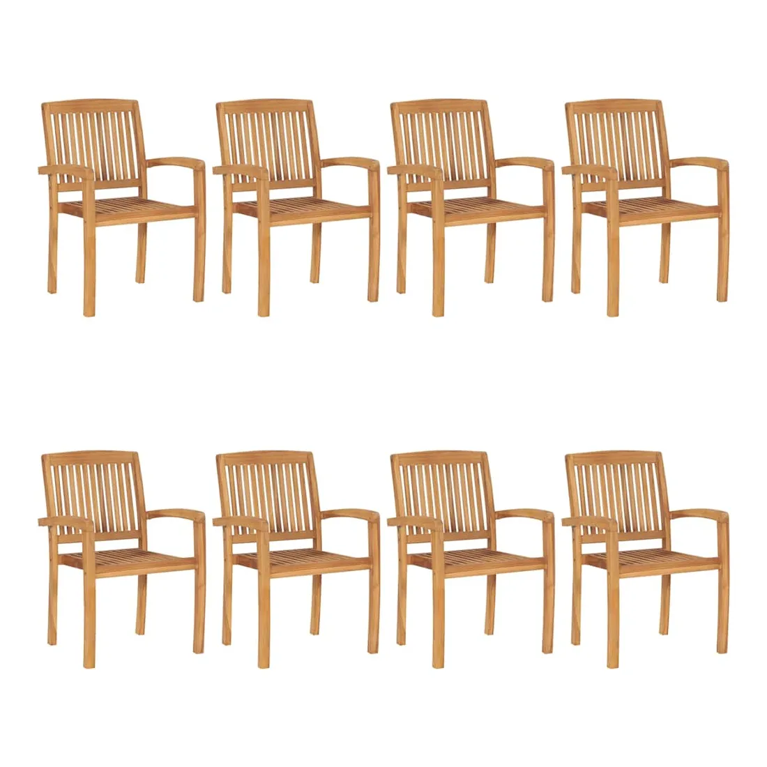 Ajoutez une touche de charme rustique à votre salle à manger, jardin ou terrasse avec cet ensemble de chaises de jardin empilables avec ensemble de coussins ! La chaise de salle à manger élève votre espace de vie intérieur ou extérieur à un niveau supérieur avec un design à lattes et élégant. Cet ensemble de meubles en teck est fabriqué à partir de bois dur de teck extrêmement durable et est chevronné, séché au four et poncé finement pour lui donner un aspect très lisse. Le bois de teck est connu pour sa solidité et sa résistance aux intempéries exceptionnelles, ce qui le rend bien plus adapté aux meubles de jardin que tout autre type de bois. Le bois de teck est le choix parfait si vous souhaitez acheter un meuble de jardin durable. Il est facile à entretenir et à nettoyer avec un chiffon humide. De plus, la chaise de salle à manger peut être empilée pour économiser de l'espace de stockage lorsqu'elle n'est pas utilisée. De plus, les coussins inclus offrent un confort supplémentaire. Chaque coussin a 2 jeux de cordes pour le fixer fermement sur la chaise. Remarque : afin de prolonger la durée de vie de vos meubles d'extérieur, nous vous recommandons de les nettoyer régulièrement et de ne pas les laisser à l'extérieur sans protection inutilement.Nettoyage : utiliser une solution savonneuse douceStockage : si possible, stockez dans un endroit frais et sec à l'intérieur. Si le produit est stocké à l'extérieur, protégez-le avec une housse imperméable. Essuyez et séchez l'excès d'eau ou de neige des surfaces planes après la pluie ou une chute de neige. Permettez une circulation d'air suffisante afin d'éviter les dommages liés à l'humidité.