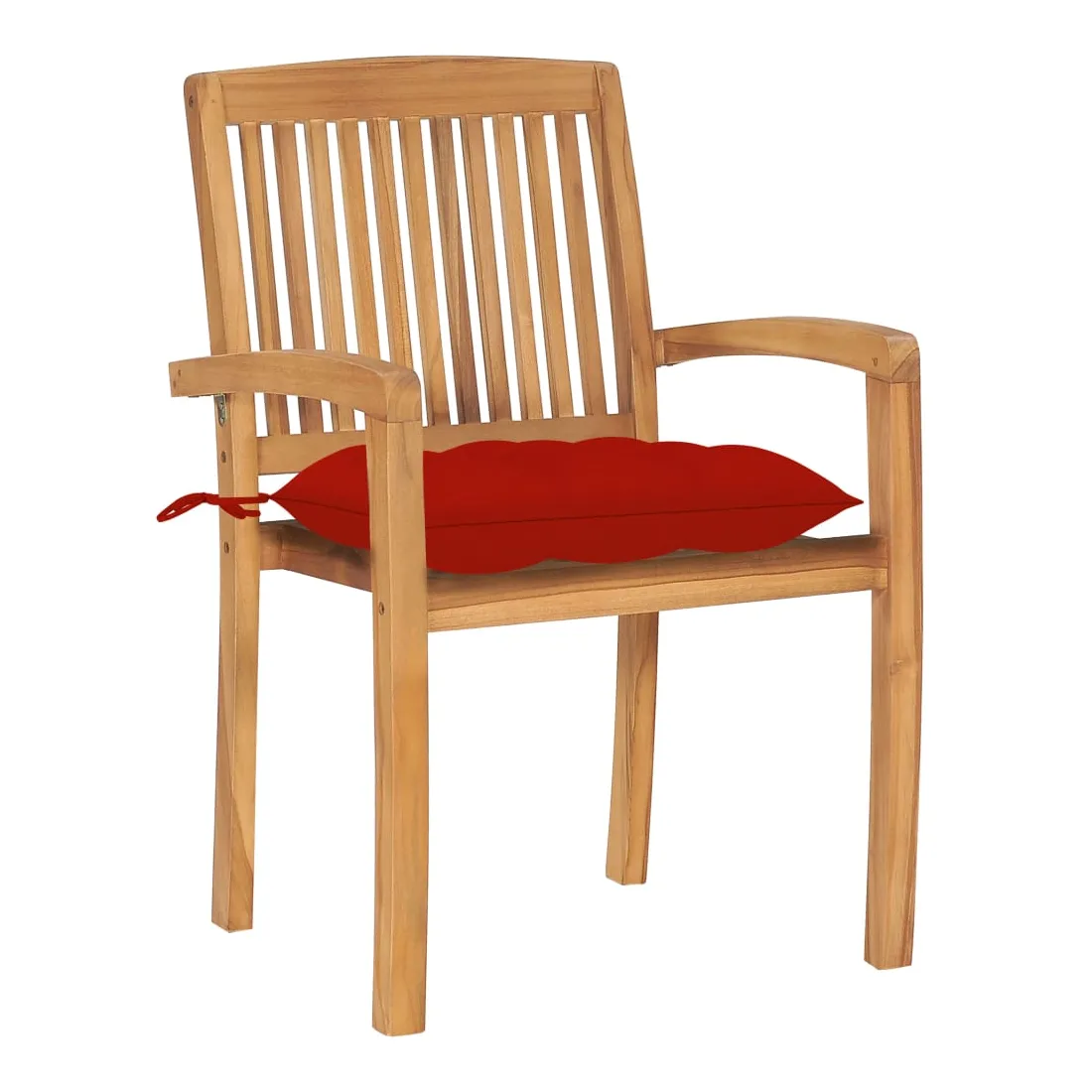 Ajoutez une touche de charme rustique à votre salle à manger, jardin ou terrasse avec cet ensemble de chaises de jardin empilables avec ensemble de coussins ! La chaise de salle à manger élève votre espace de vie intérieur ou extérieur à un niveau supérieur avec un design à lattes et élégant. Cet ensemble de meubles en teck est fabriqué à partir de bois dur de teck extrêmement durable et est chevronné, séché au four et poncé finement pour lui donner un aspect très lisse. Le bois de teck est connu pour sa solidité et sa résistance aux intempéries exceptionnelles, ce qui le rend bien plus adapté aux meubles de jardin que tout autre type de bois. Le bois de teck est le choix parfait si vous souhaitez acheter un meuble de jardin durable. Il est facile à entretenir et à nettoyer avec un chiffon humide. De plus, la chaise de salle à manger peut être empilée pour économiser de l'espace de stockage lorsqu'elle n'est pas utilisée. De plus, les coussins inclus offrent un confort supplémentaire. Chaque coussin a 2 jeux de cordes pour le fixer fermement sur la chaise. Remarque : afin de prolonger la durée de vie de vos meubles d'extérieur, nous vous recommandons de les nettoyer régulièrement et de ne pas les laisser à l'extérieur sans protection inutilement.Nettoyage : utiliser une solution savonneuse douceStockage : si possible, stockez dans un endroit frais et sec à l'intérieur. Si le produit est stocké à l'extérieur, protégez-le avec une housse imperméable. Essuyez et séchez l'excès d'eau ou de neige des surfaces planes après la pluie ou une chute de neige. Permettez une circulation d'air suffisante afin d'éviter les dommages liés à l'humidité.