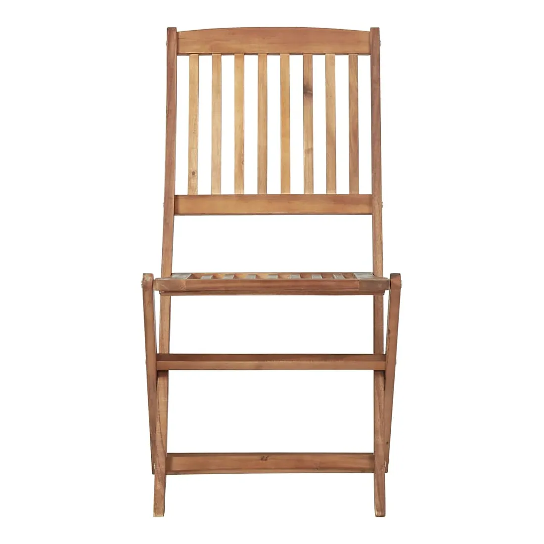Ces chaises pliables en bois d’acacia massif avec coussins sont un endroit idéal pour vous détendre et profiter du soleil dans le jardin ou sur le patio. Ces chaises de jardin sont fabriquées en bois d’acacia massif, ce qui les rend solides et stables. Le bois d’acacia massif a la force de soutenir le poids et résiste à l’usure du temps. Ainsi, ces chaises d’extérieur offrent des années de détente. De plus, les chaises peuvent être pliées pour économiser de l’espace lorsqu'elles ne sont pas utilisées. Les coussins inclus ajoutent un confort supplémentaire. Chaque coussin comporte deux ensembles de cordes pour le fixer solidement sur la chaise. Remarque : Afin de prolonger la durée de vie de vos meubles d'extérieur, nous vous recommandons de les nettoyer régulièrement et de ne pas les laisser à l'extérieur sans protection inutilement.Nettoyage : Utiliser une solution savonneuse douceStockage : Si possible, stockez dans un endroit frais et sec à l'intérieur. Si le produit est stocké à l'extérieur, protégez-le avec une housse imperméable. Essuyez et séchez l'excès d'eau ou de neige des surfaces planes après la pluie ou une chute de neige. Permettez une circulation d'air suffisante afin d'éviter les dommages liés à l'humidité.