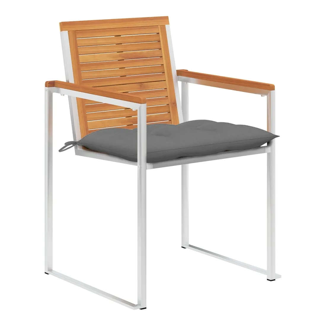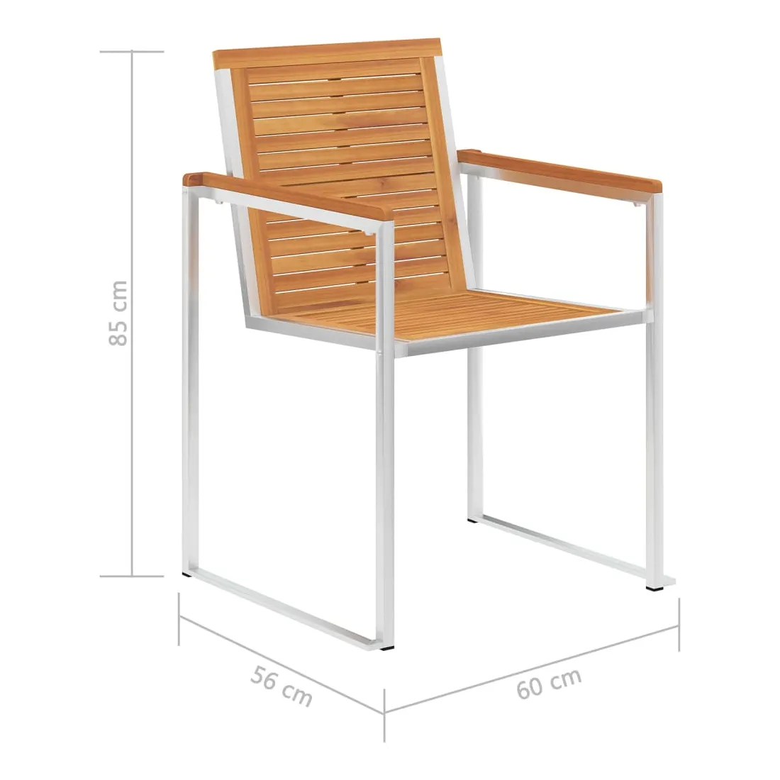 Ces chaises de jardin en bois sont conçues pour devenir le point de mire de votre jardin ou de votre patio. Les chaises de salle à manger sont fabriquées en bois d'acacia massif et en acier inoxydable de haute qualité, ce qui les rend très durables, résistantes à la rouille, robustes et faciles à nettoyer avec un chiffon humide. Le coussin inclus est plus qu'un supplément pratique, il a également une fonction décorative. Asseyez-vous pour un délicieux dîner en plein air ou détendez-vous et profitez du beau temps avec cet ensemble classique de chaises de jardin. Remarque : afin de prolonger la durée de vie de vos meubles d'extérieur, nous vous recommandons de les nettoyer régulièrement et de ne pas les laisser à l'extérieur sans protection inutilement.Nettoyage : Utiliser une solution savonneuse douce.Stockage : si possible, stockez dans un endroit frais et sec à l'intérieur. Si le produit est stocké à l'extérieur, protégez-le avec une housse imperméable. Essuyez et séchez l'excès d'eau ou de neige des surfaces planes après la pluie ou une chute de neige. Permettez une circulation d'air suffisante afin d'éviter les dommages liés à l'humidité.
