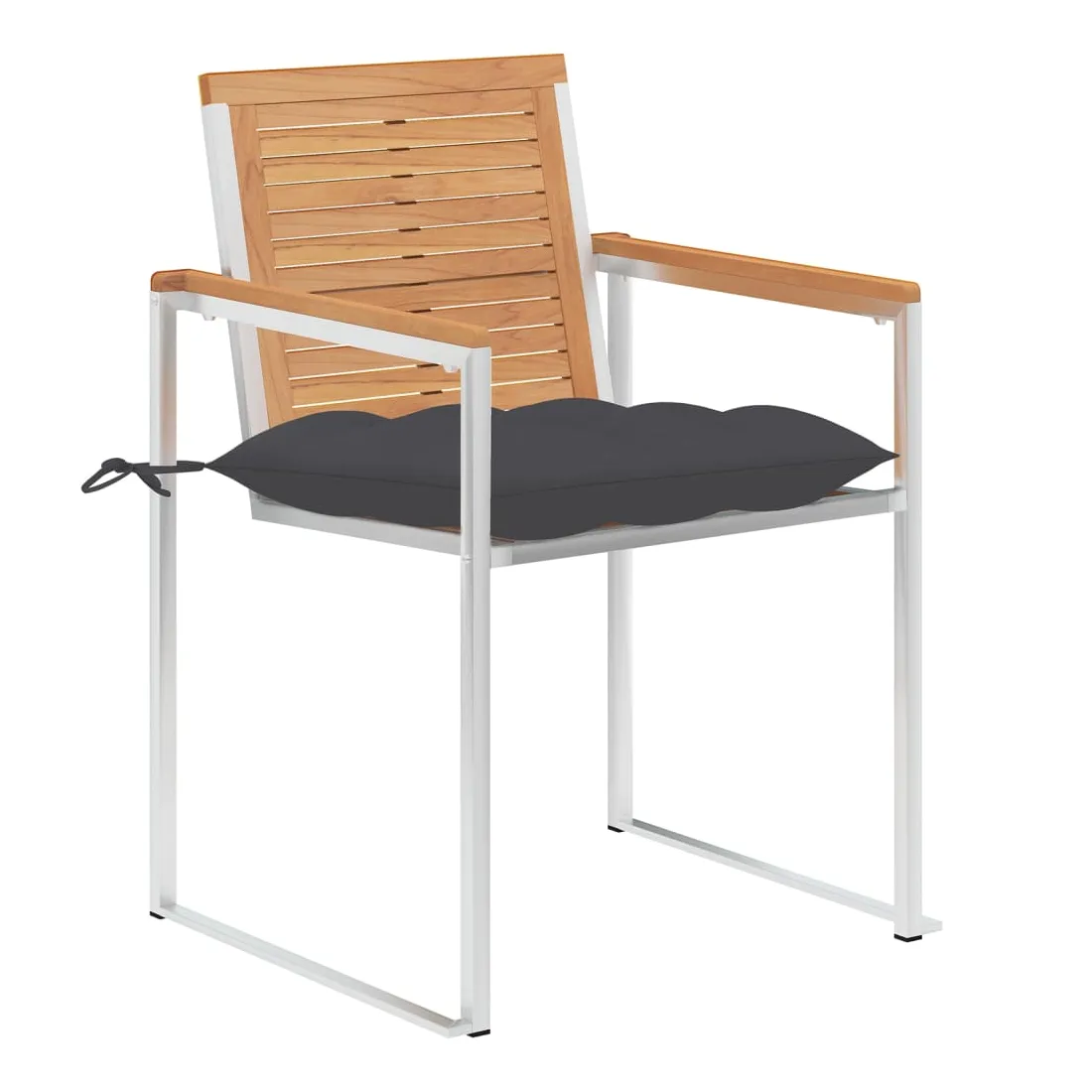Ces chaises de jardin en bois sont conçues pour devenir le point de mire de votre jardin ou de votre patio. Construite à partir de bois dur de teck extrêmement durable, cette pièce de mobilier en boit de teck a été chevronnée, séchée au four puis poncée finement pour donner un aspect très lisse. Le bois de teck est connu pour sa solidité et sa résistance aux intempéries exceptionnelles, ce qui le rend bien plus adapté aux meubles de jardin que tout autre type de bois. Le bois de teck est le choix parfait si vous souhaitez acheter un meuble de jardin durable. Le cadre en acier inoxydable de haute qualité les rend également très durables, résistantes à la rouille et robustes. Le coussin inclus est plus qu'un supplément pratique ; il a une fonction décorative aussi. Asseyez-vous pour un délicieux dîner en plein air ou détendez-vous simplement et profitez du beau temps sur cet ensemble de chaises de jardin classique. Remarque : afin de prolonger la durée de vie de vos meubles d'extérieur, nous vous recommandons de les nettoyer régulièrement et de ne pas les laisser à l'extérieur sans protection inutilement.Nettoyage : Utiliser une solution savonneuse douce.Stockage : si possible, stockez dans un endroit frais et sec à l'intérieur. Si le produit est stocké à l'extérieur, protégez-le avec une housse imperméable. Essuyez et séchez l'excès d'eau ou de neige des surfaces planes après la pluie ou une chute de neige. Permettez une circulation d'air suffisante afin d'éviter les dommages liés à l'humidité.