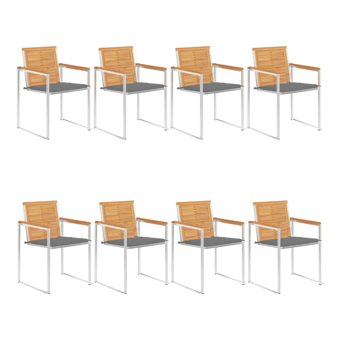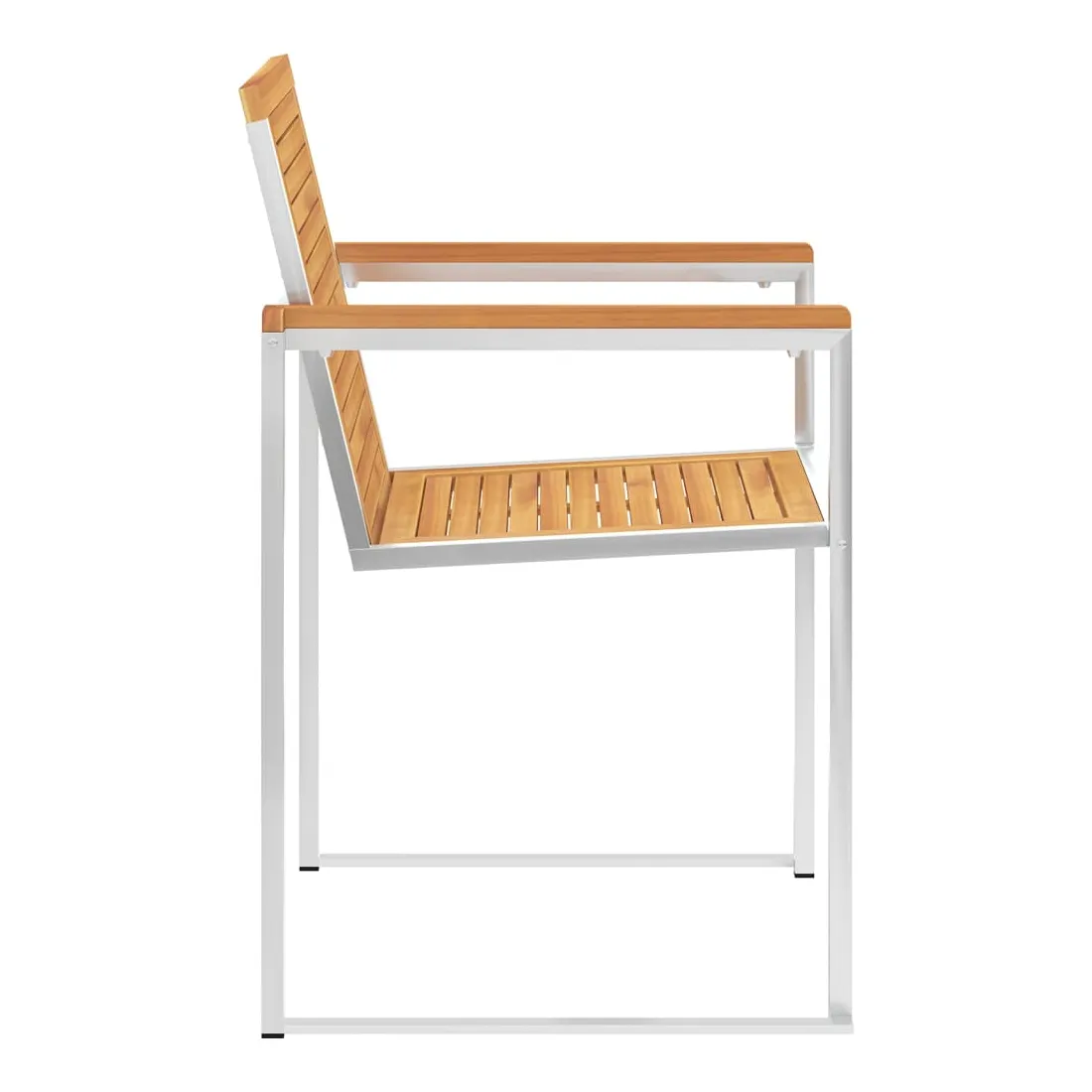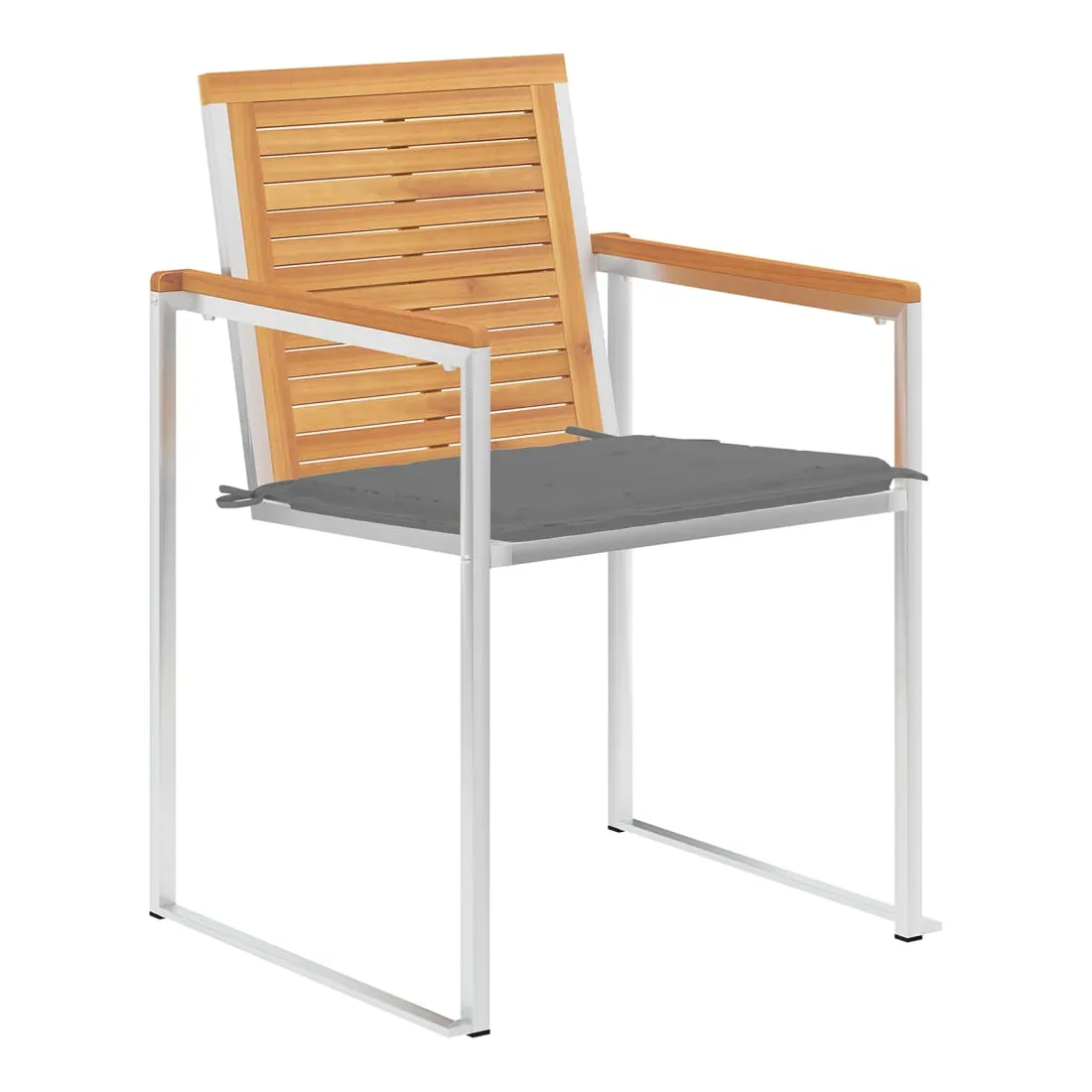 Ces chaises de jardin en bois sont conçues pour devenir le point de mire de votre jardin ou de votre patio. Construite à partir de bois dur de teck extrêmement durable, cette pièce de mobilier en boit de teck a été chevronnée, séchée au four puis poncée finement pour donner un aspect très lisse. Le bois de teck est connu pour sa solidité et sa résistance aux intempéries exceptionnelles, ce qui le rend bien plus adapté aux meubles de jardin que tout autre type de bois. Le bois de teck est le choix parfait si vous souhaitez acheter un meuble de jardin durable. Le cadre en acier inoxydable de haute qualité les rend également très durables, résistantes à la rouille et robustes. Le coussin inclus est plus qu'un supplément pratique ; il a une fonction décorative aussi. Asseyez-vous pour un délicieux dîner en plein air ou détendez-vous simplement et profitez du beau temps sur cet ensemble de chaises de jardin classique. Remarque : afin de prolonger la durée de vie de vos meubles d'extérieur, nous vous recommandons de les nettoyer régulièrement et de ne pas les laisser à l'extérieur sans protection inutilement.Nettoyage : Utiliser une solution savonneuse douce.Stockage : si possible, stockez dans un endroit frais et sec à l'intérieur. Si le produit est stocké à l'extérieur, protégez-le avec une housse imperméable. Essuyez et séchez l'excès d'eau ou de neige des surfaces planes après la pluie ou une chute de neige. Permettez une circulation d'air suffisante afin d'éviter les dommages liés à l'humidité.