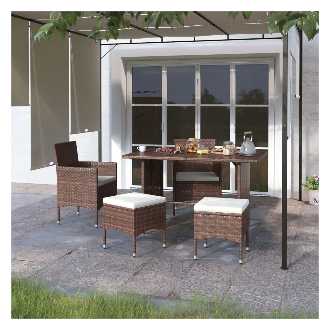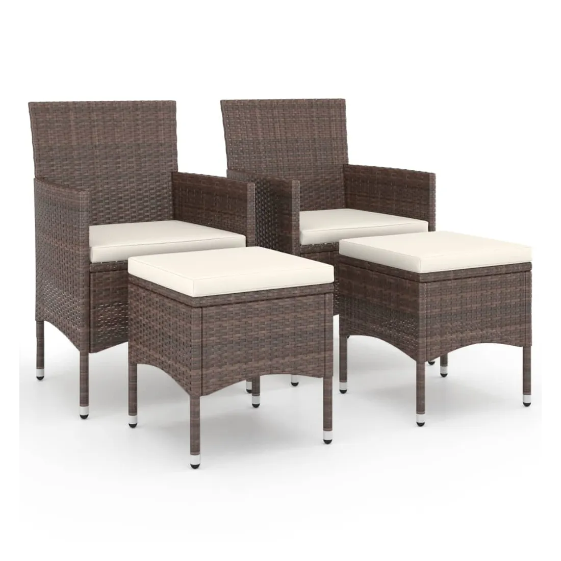 Cet ensemble de 4 chaises et tabourets de jardin complète parfaitement votre jardin, terrasse et espace de vie extérieur. Les meubles de jardin sont fabriqués à partir d’un solide cadre en acier enduit de poudre, ce qui la rend robuste et stable pour des années de détente. L'ensemble de chaises et de tabourets d'extérieur recouvert de résine tressée est facile à nettoyer avec un chiffon humide et convient à une utilisation quotidienne à l’extérieur. De plus, le coussin d'assise bien rembourré ajoute un confort supplémentaire à la chaise. Remarque : afin de prolonger la durée de vie de vos meubles d'extérieur, nous vous recommandons de les nettoyer régulièrement et de ne pas les laisser à l'extérieur sans protection inutilement.Nettoyage : Utiliser une solution savonneuse douce.Stockage : si possible, stockez dans un endroit frais et sec à l'intérieur. Si le produit est stocké à l'extérieur, protégez-le avec une housse imperméable. Essuyez et séchez l'excès d'eau ou de neige des surfaces planes après la pluie ou une chute de neige. Permettez une circulation d'air suffisante afin d'éviter les dommages liés à l'humidité.