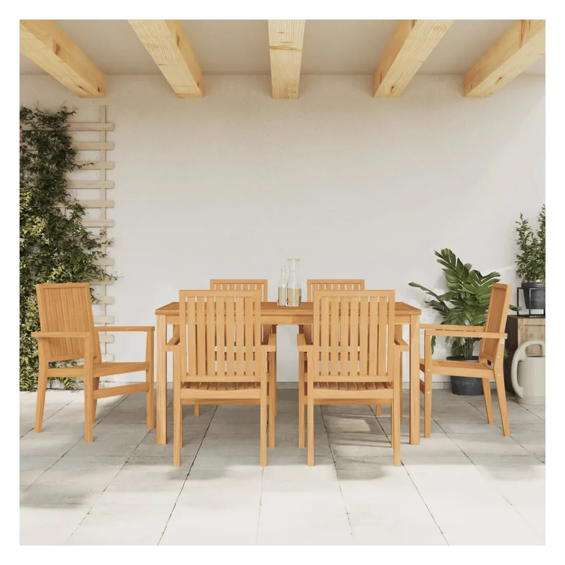 Ces chaises de jardin empilables en bois présentent un design classique et seront un excellent supplément à votre jardin, patio ou terrasse. Bois de teck massif : le bois de teck massif est un matériau naturel magnifique. Il a été chevronné, séché au four, puis sablé finement pour lui donner une apparence très lisse. Le bois de teck est connu pour sa résistance exceptionnelle et sa résistance aux intempéries.Expérience d'assise confortable : dotée d'accoudoirs et d'un dossier, la chaise de jardin vous offre le plus grand confort.Conception empilable : la chaise de jardin est empilable pour économiser de l'espace de stockage lorsqu'elle n'est pas utilisée. Bon à savoir :Pour que vos meubles d'extérieur restent beaux, nous vous recommandons de les protéger avec une housse imperméable.
