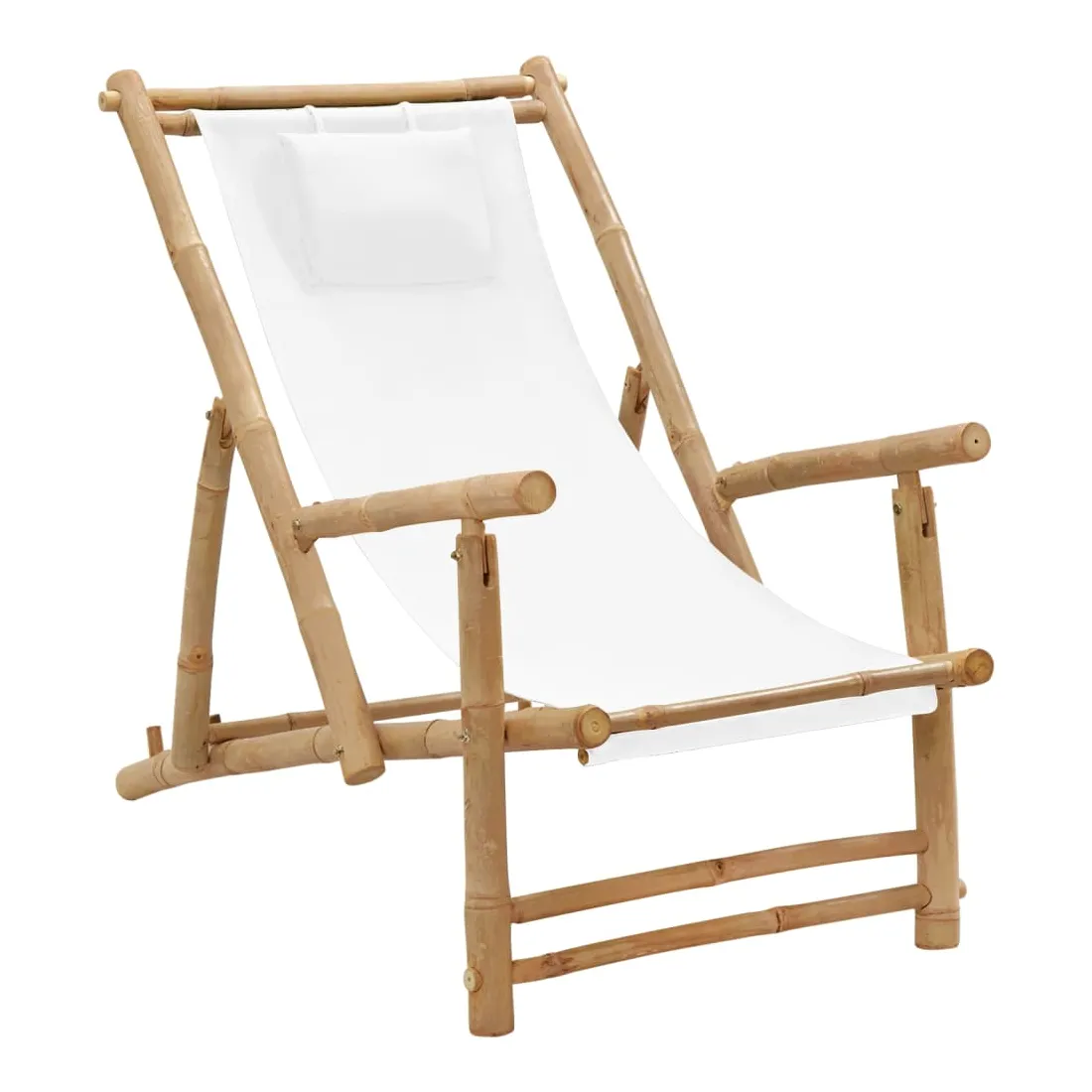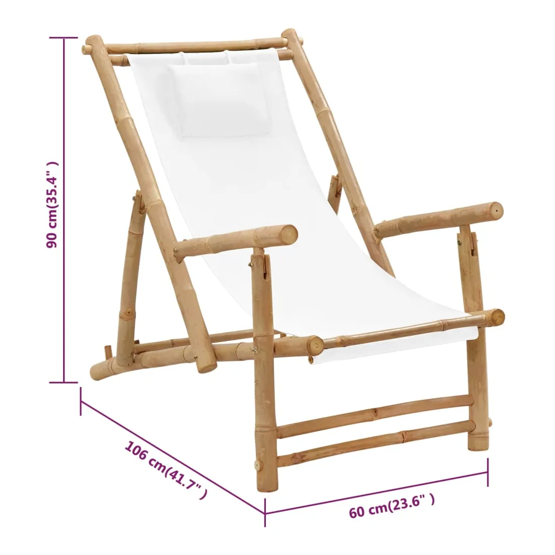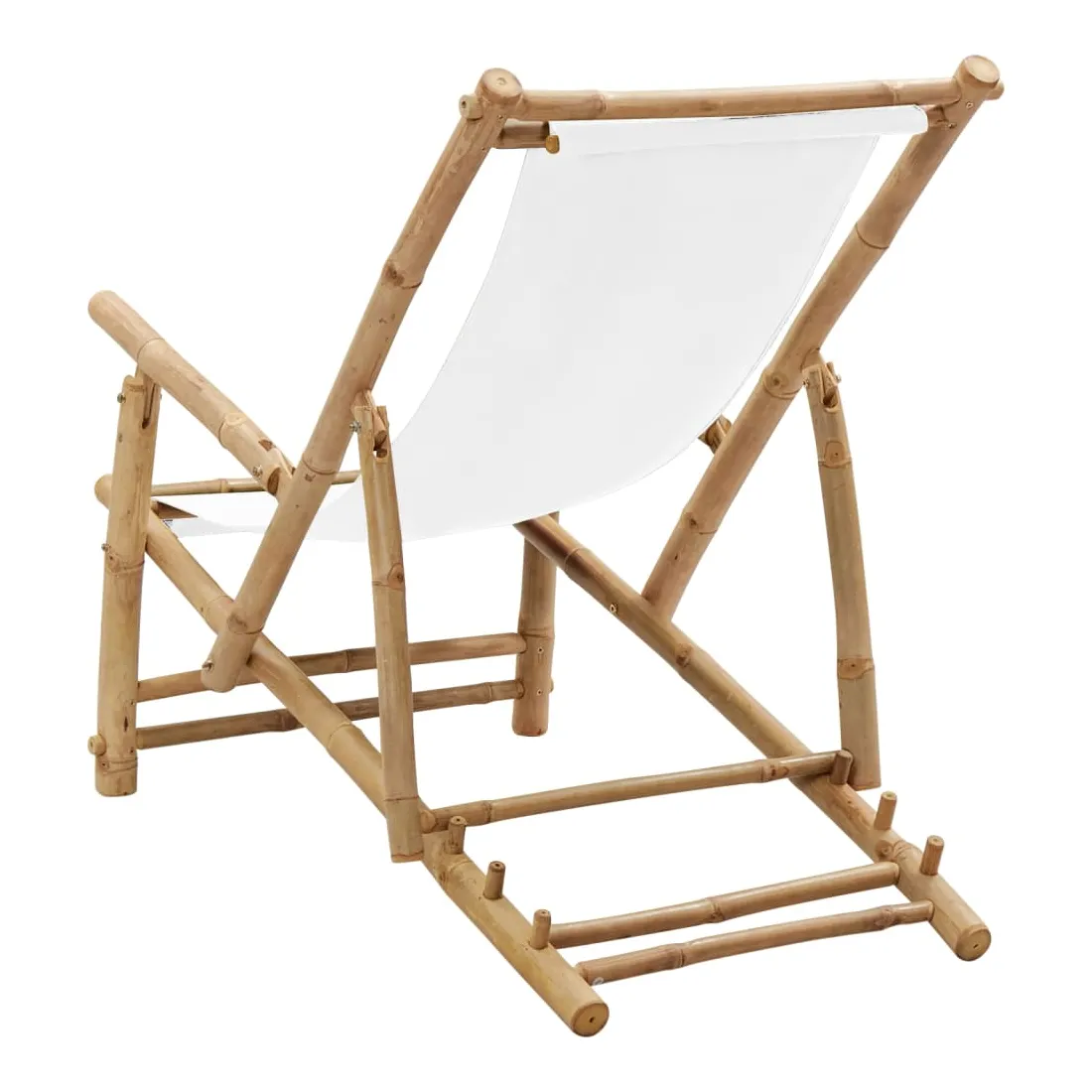 Cette chaise de terrasse en bambou réglable en hauteur avec accoudoirs est conçue pour être un supplément fabuleux à votre jardin, patio ou terrasse. Matériau de première qualité : la toile est un tissu uni largement utilisé, connu pour sa robustesse, sa résistance à l'eau, sa légèreté et son utilisation intensive. De plus, il a un tissage plus serré que la plupart des tissus tissés, ce qui le rend plus rigide et durable.Cadre stable : le cadre de la chaise est fabriqué en bambou , qui est extrêmement durable. Le matériau ne change pas de couleur pendant longtemps et empêche la chaise de plage de se fissurer et de se déformer.Design pliable : la chaise longue peut être pliée pour économiser de l'espace lorsqu'elle n'est pas utilisée.Dossier réglable : grâce au dossier réglable, la chaise de jardin en bambou peut être ajustée en 3 positions. Par conséquent, vous pouvez profiter d'un confort maximal. Remarque :Afin de prolonger la durée de vie de votre mobilier d'extérieur, nous vous recommandons de le protéger avec une housse imperméable.