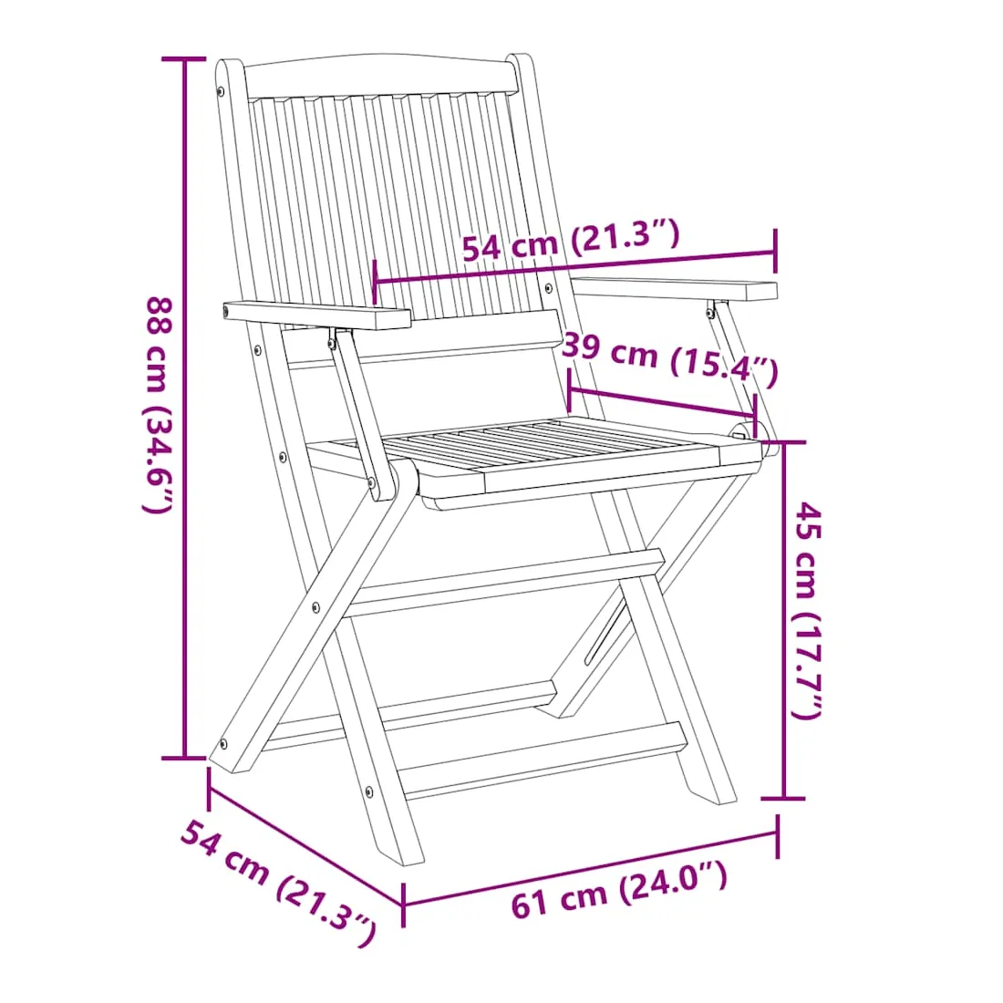 Ces chaises de jardin en bois complèteront à merveille votre jardin, patio ou terrasse, vous permettant de passer des moments agréables avec votre famille ou vos amis. Bois d'acacia massif : le siège de jardin est fabriqué en bois d'acacia massif pour plus de robustesse et de stabilité. Le bois d'acacia massif est un beau matériau naturel. Le bois d'acacia a un grain droit et les nœuds donnent au matériau son aspect caractéristique et rustique.Une expérience d'assise confortable : dotée d'accoudoirs et d'un dossier, la chaise d'extérieur vous offre un confort optimal.Design à lattes : le design à lattes de la chaise de jardin en bois empêche l'accumulation de l'eau, ce qui permet de garder le siège au sec et d'éviter un pourrissement inutile.Design pliable : la chaise de patio peut être facilement pliée lorsqu'elle n'est pas utilisée, pour un rangement et un transport faciles. Bon à savoir :Pour que vos meubles d'extérieur restent beaux, nous vous recommandons de les protéger avec une housse imperméable.
