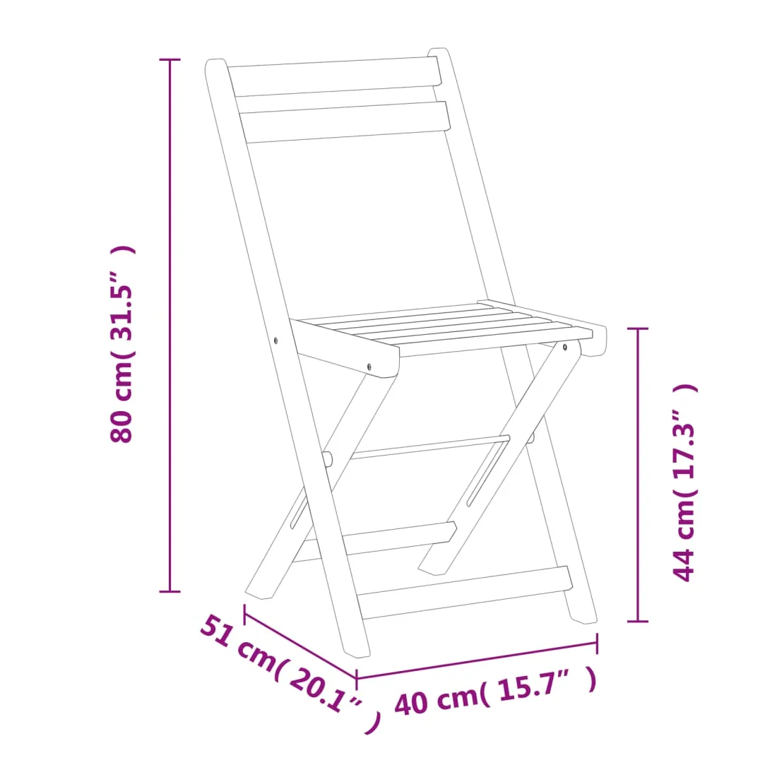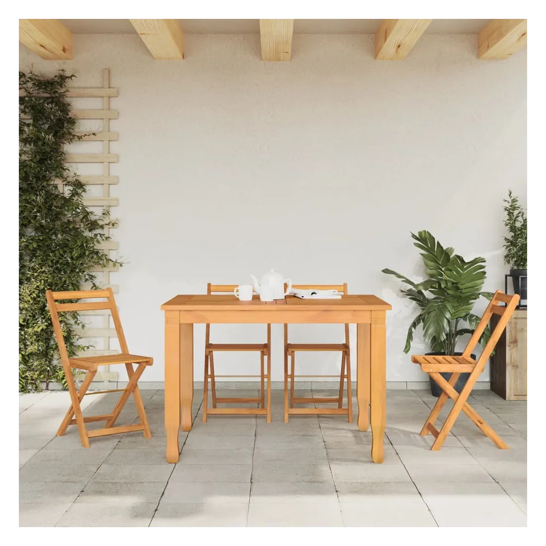 Ces chaises de bistrot pliantes sont un complément parfait à votre jardin et à votre terrasse, créant une impression durable ! Matériau durable : le bois d'acacia massif est un matériau naturel magnifique. Le bois d'acacia un bois dur tropical, qui est dense, robuste et durable.Design pliable : les chaises peuvent être facilement repliées lorsqu'elles ne sont pas utilisées pour faciliter le rangement et le transport.Surface facile à nettoyer : grâce à la finition à l'huile, les chaises pliantes sont faciles à nettoyer avec un chiffon humide. Bon à savoir :Pour que vos meubles d'extérieur restent beaux, nous vous recommandons de les protéger avec une housse imperméable.
