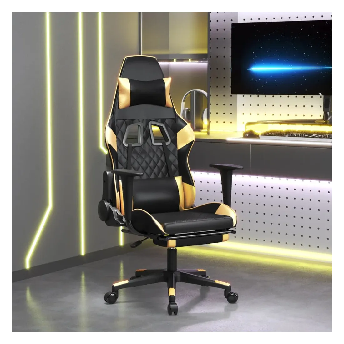 vidaXLProfitez de cette chaise de jeu unique et améliorez votre expérience de jeu avec confort ! Similicuir durable : le similicuir de qualité supérieure est un matériau très durable. Il est résistant aux taches, ce qui le rend facile à nettoyer avec un chiffon humide. La surface lisse donne également un aspect luxueux et la beauté du cuir véritable.Dossier et hauteur réglables : il est spécialement conçu avec une fonction d'inclinaison afin que vous puissiez régler le dossier et le repose-pied selon votre confort. Utilisez le levier pour régler la hauteur de votre siège à votre convenance.Design pratique : le design pivotant à 360 degrés permet une plus grande amplitude de mouvement. De plus, il est pratique de le déplacer avec des roulettes.Cadre robuste et stable : les cadres en métal et en contreplaqué assurent robustesse et stabilité. Remarque :Chaque produit est livré avec un manuel de montage dans la boîte pour un montage facile.