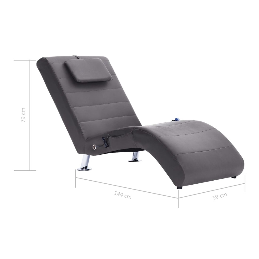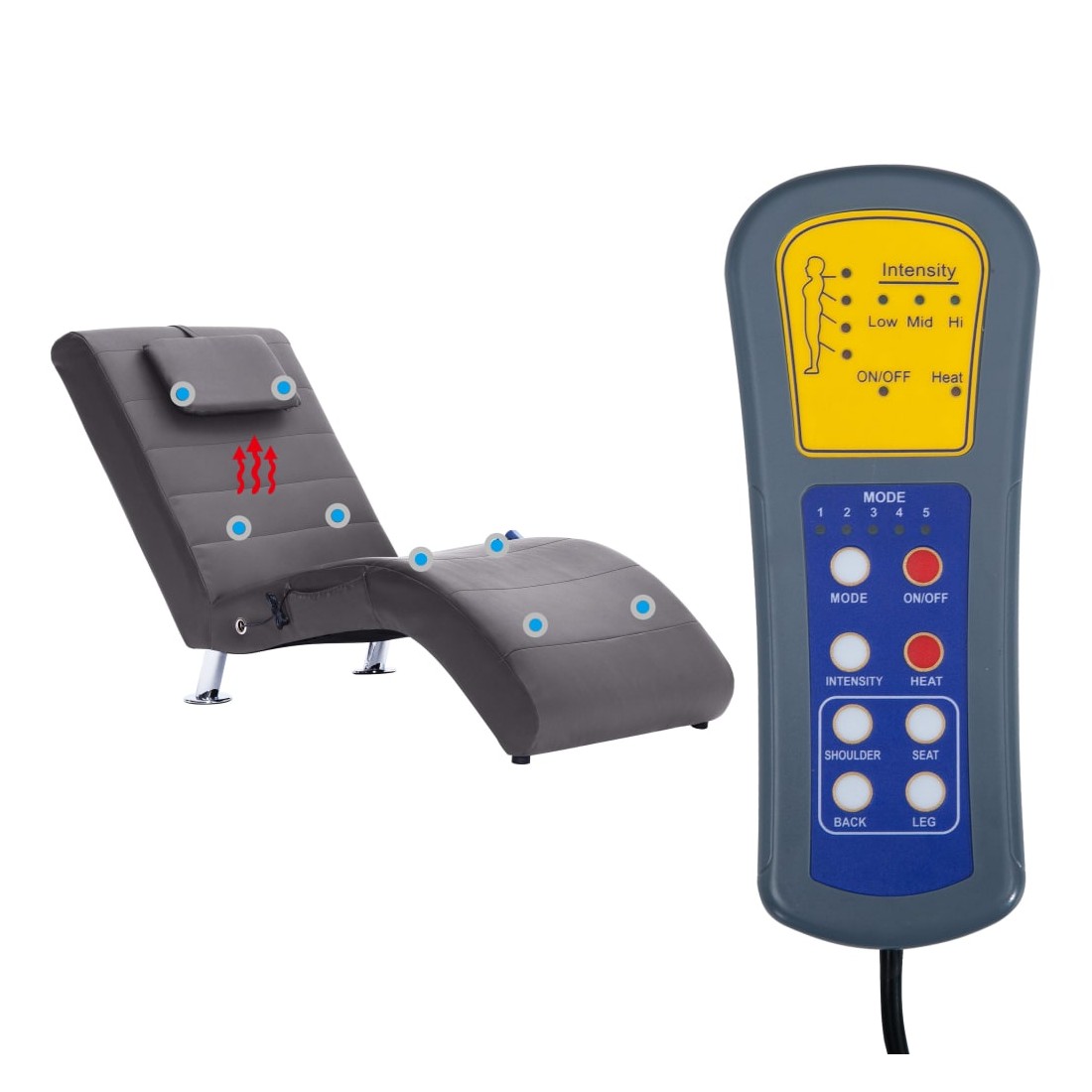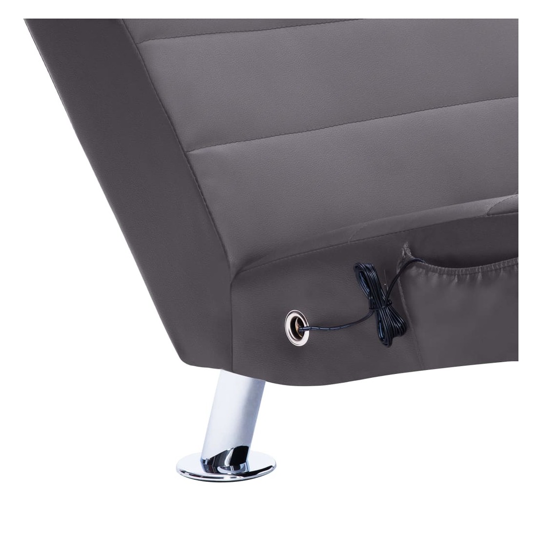 Notre chaise longue confortable au look élégant et épuré sera un supplément intemporel et pratique à toute pièce. Grâce à son design ergonomique et à son rembourrage épais, la chaise longue est considérablement confortable à nicher. De plus, ses pieds en acier galvanisé et son revêtement en cuir artificiel le rendent extrêmement robuste et durable. De plus, la chaise longue se distingue par des fonctions de massage et de chauffage. Avec différents points, zones et intensités de massage et télécommande incluse, la chaise longue vous apportera le plus grand confort. Remarque : ce produit est doté d'un connecteur USB, mais la source d'alimentation certifiée de USB 5V n'est pas incluse.