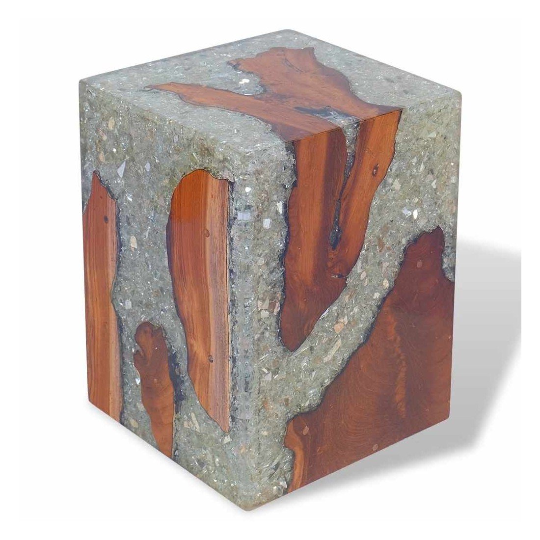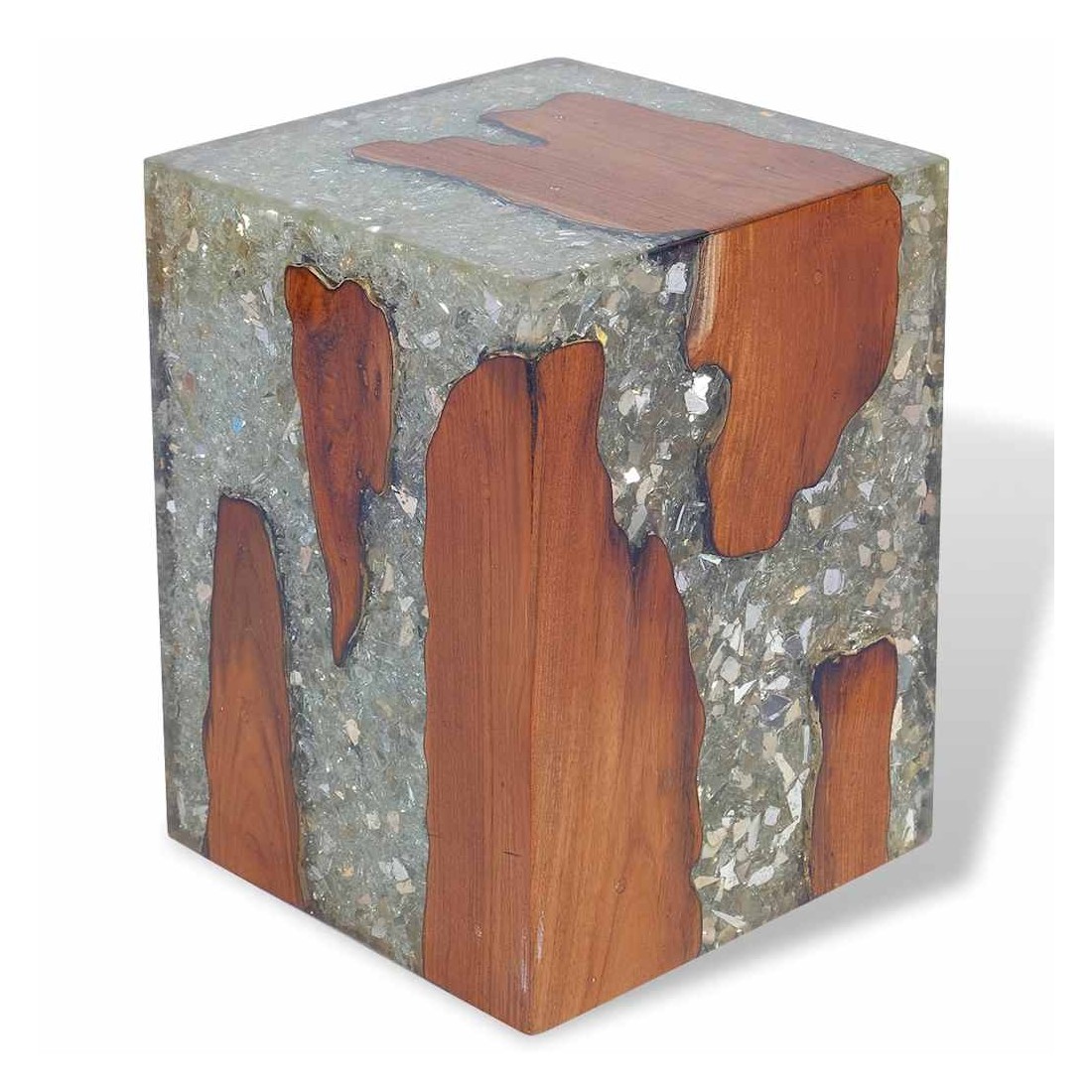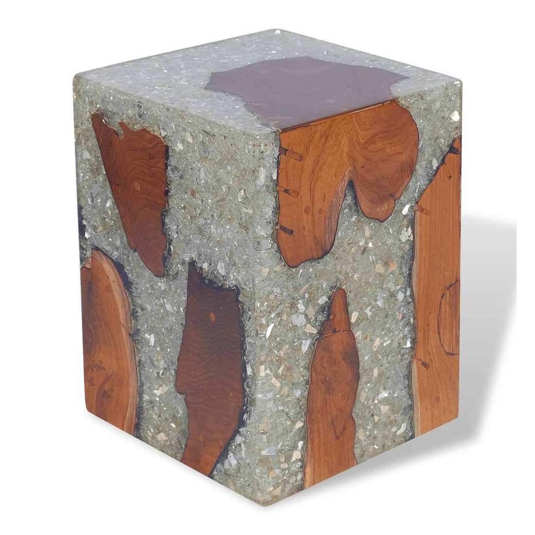 - Matériau : teck massif avec finition laquée transparente, résine transparente avec verre concassé, contreplaqué