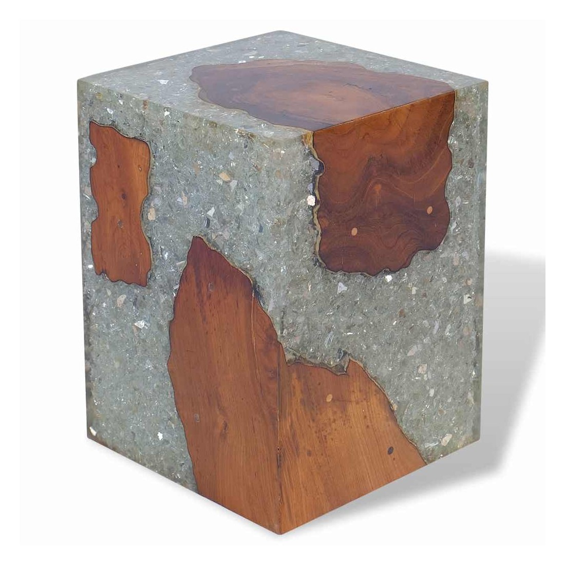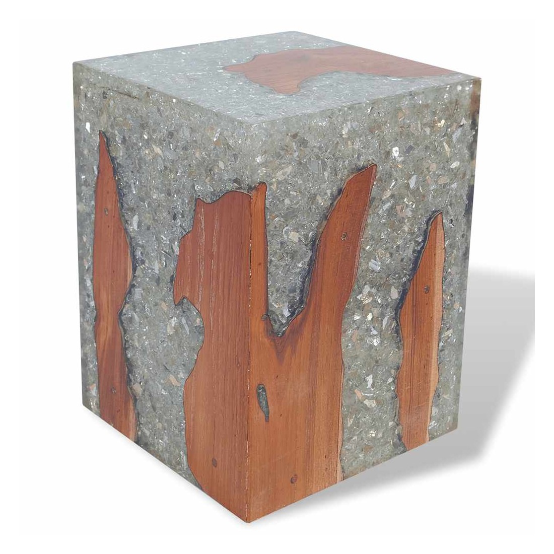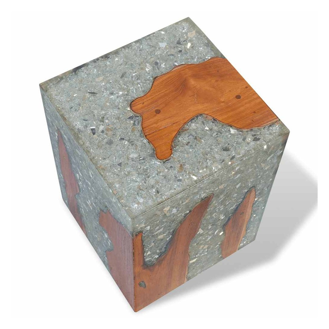 - Matériau : teck massif avec finition laquée transparente, résine transparente avec verre concassé, contreplaqué