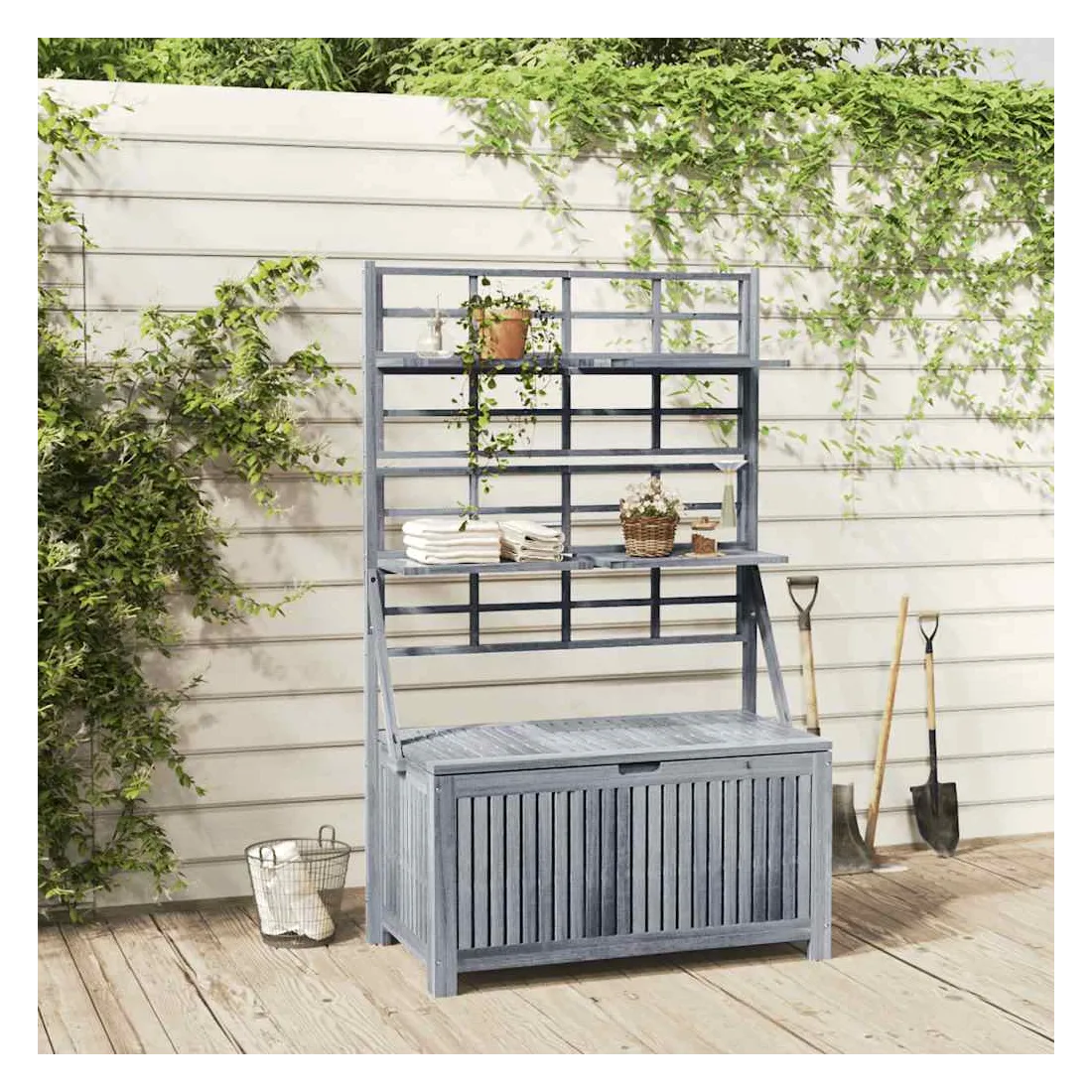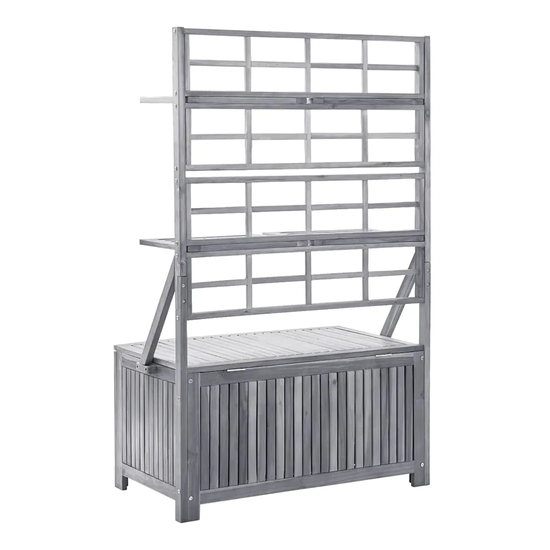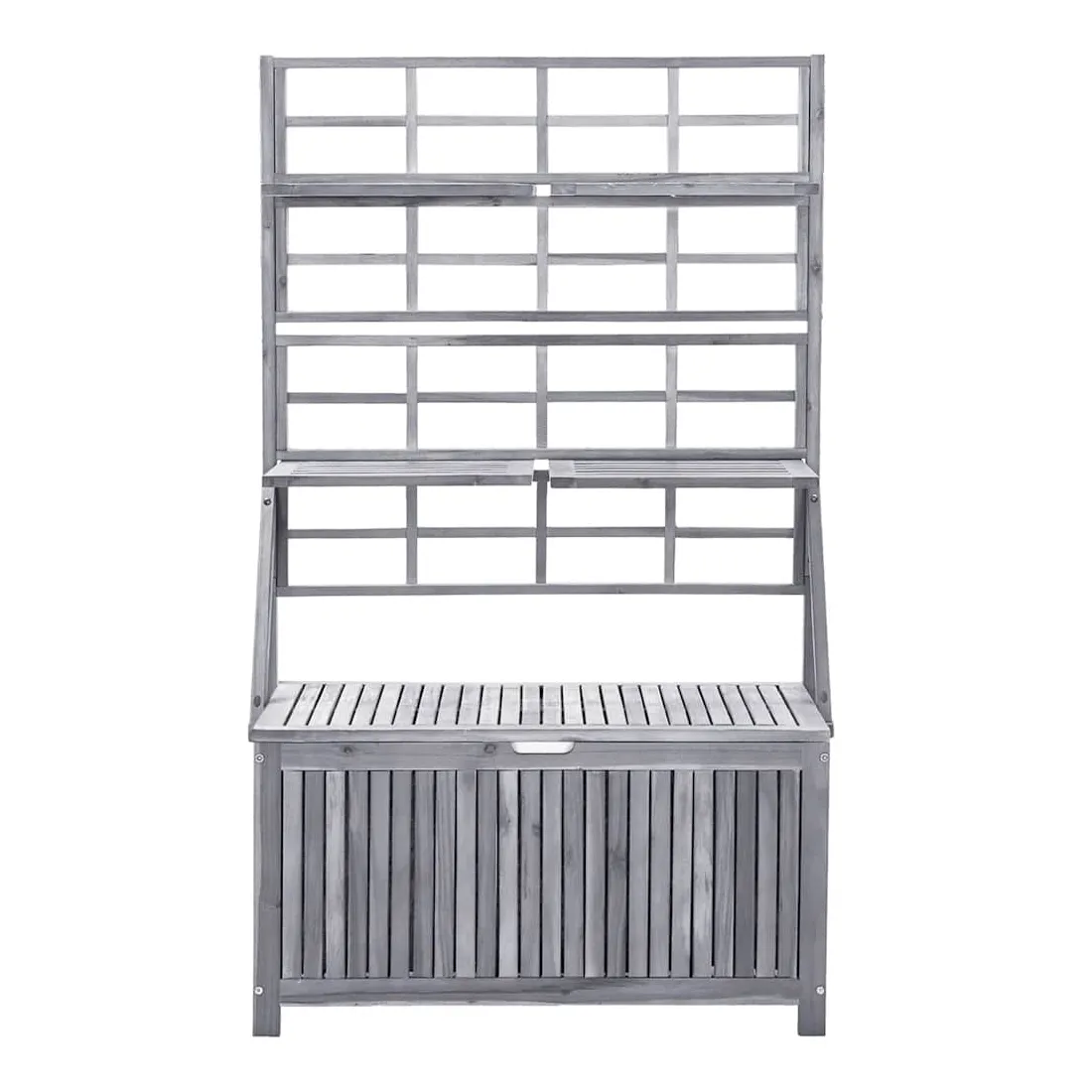 Cette boîte de rangement polyvalente offre un espace de rangement et de la place pour vos plantes et fleurs. Cette boîte à coussins est faite de bois d'acacia massif, un bois franc avec des grains denses. Cette boîte magnifiquement conçue est stable, durable et accrocheuse. L'artisanat exquis et les beaux grains de bois rendent chaque pièce distinctive et légèrement différente l'une de l'autre. Le treillis intégré offre un excellent soutien pour les plantes grimpantes. Vous pouvez également placer un pot de fleurs sur les étagères. Les 4 étagères incluses peuvent être ajustées en position. Remarque : afin de prolonger la durée de vie des meubles d'extérieur, nous vous recommandons de les protéger avec une housse imperméable.