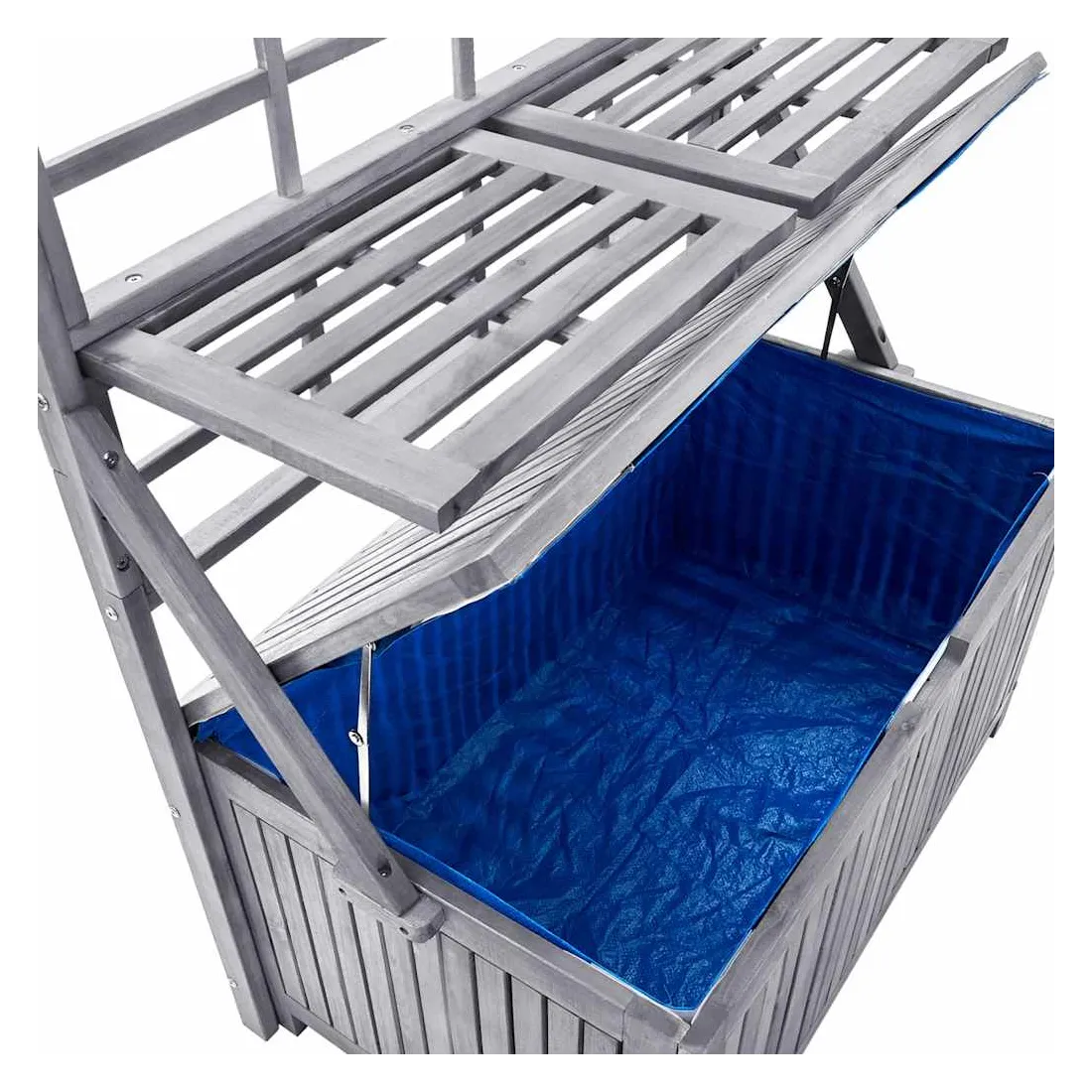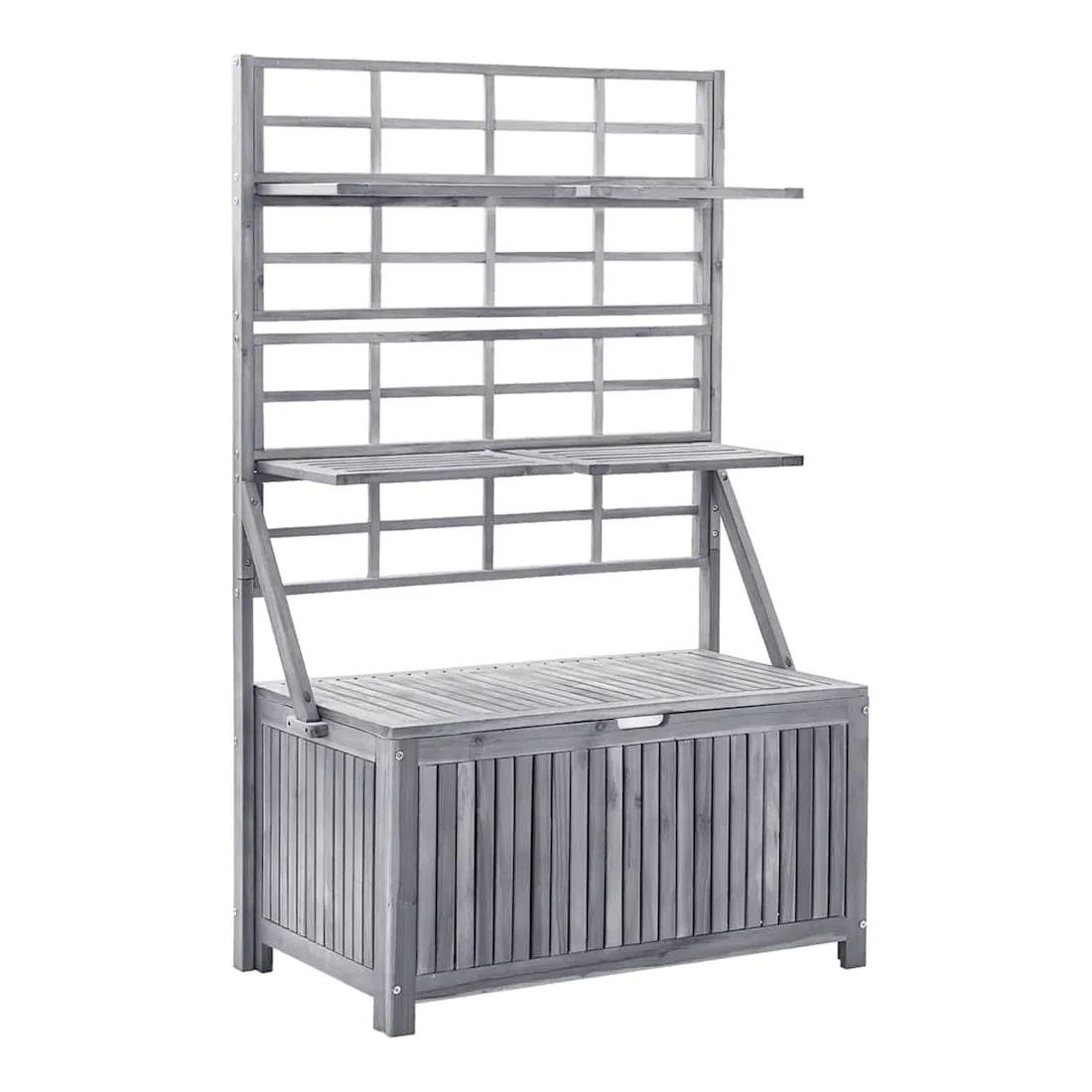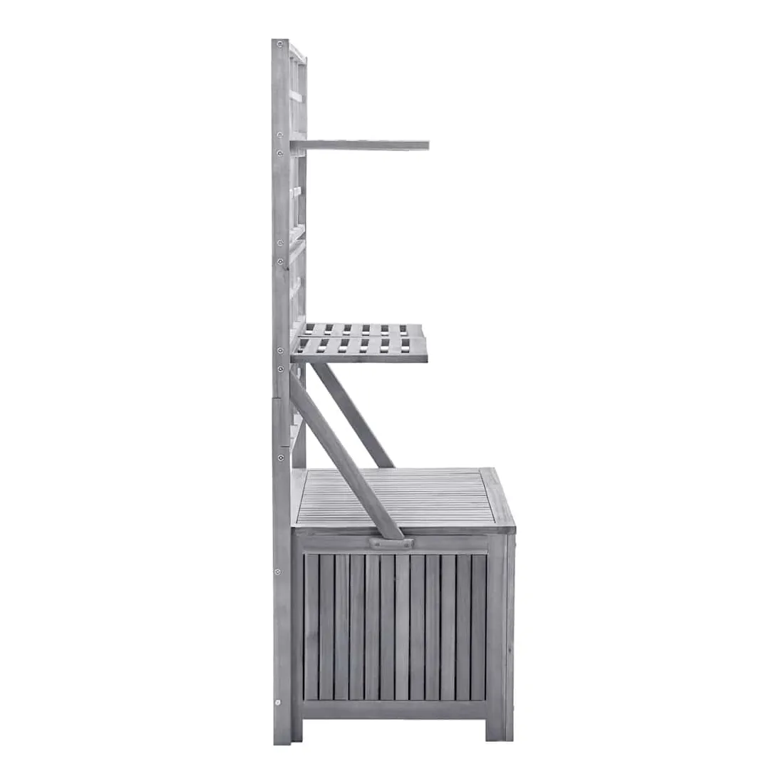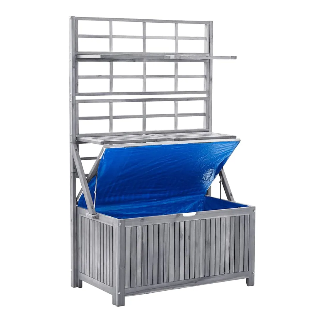Cette boîte de rangement polyvalente offre un espace de rangement et de la place pour vos plantes et fleurs. Cette boîte à coussins est faite de bois d'acacia massif, un bois franc avec des grains denses. Cette boîte magnifiquement conçue est stable, durable et accrocheuse. L'artisanat exquis et les beaux grains de bois rendent chaque pièce distinctive et légèrement différente l'une de l'autre. Le treillis intégré offre un excellent soutien pour les plantes grimpantes. Vous pouvez également placer un pot de fleurs sur les étagères. Les 4 étagères incluses peuvent être ajustées en position. Remarque : afin de prolonger la durée de vie des meubles d'extérieur, nous vous recommandons de les protéger avec une housse imperméable.