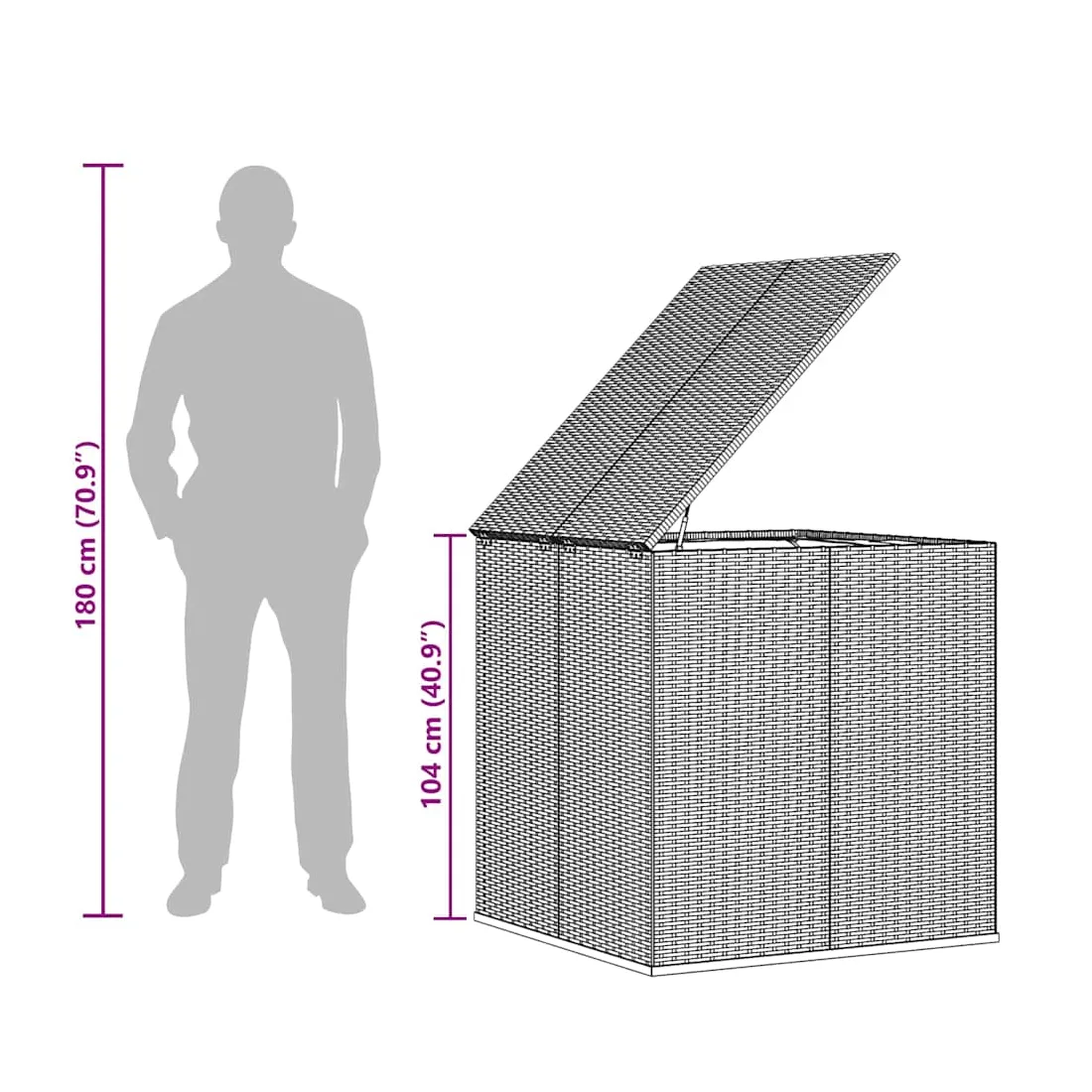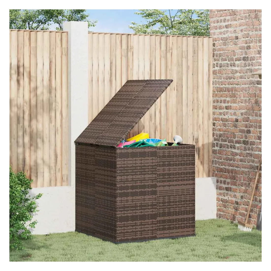 Cette boîte à coussins de jardin en résine tressée est un choix idéal pour ranger des coussins, des oreillers, des couvertures supplémentaires, des serviettes, des bibelots et bien plus encore. Cette boîte de rangement de jardin a un cadre robuste en acier enduit de poudre, qui est très durable. Grâce à la résine tressée résistante aux intempéries, le coffre de rangement est facile à nettoyer, résistant à l'usure et adapté à une utilisation à l'extérieur ainsi qu'à l'intérieur. De plus, le sac d'intérieur imperméable en PE avec housse et fermeture éclair protège vos articles de l'humidité. De plus, la boîte à coussins est dotée d'un mécanisme de levage à gaz qui facilite son ouverture et sa fermeture, protégeant ainsi les doigts et les mains d'une fermeture accidentelle. Remarque : afin de prolonger la durée de vie des meubles d'extérieur, nous vous recommandons de les protéger avec une housse imperméable.