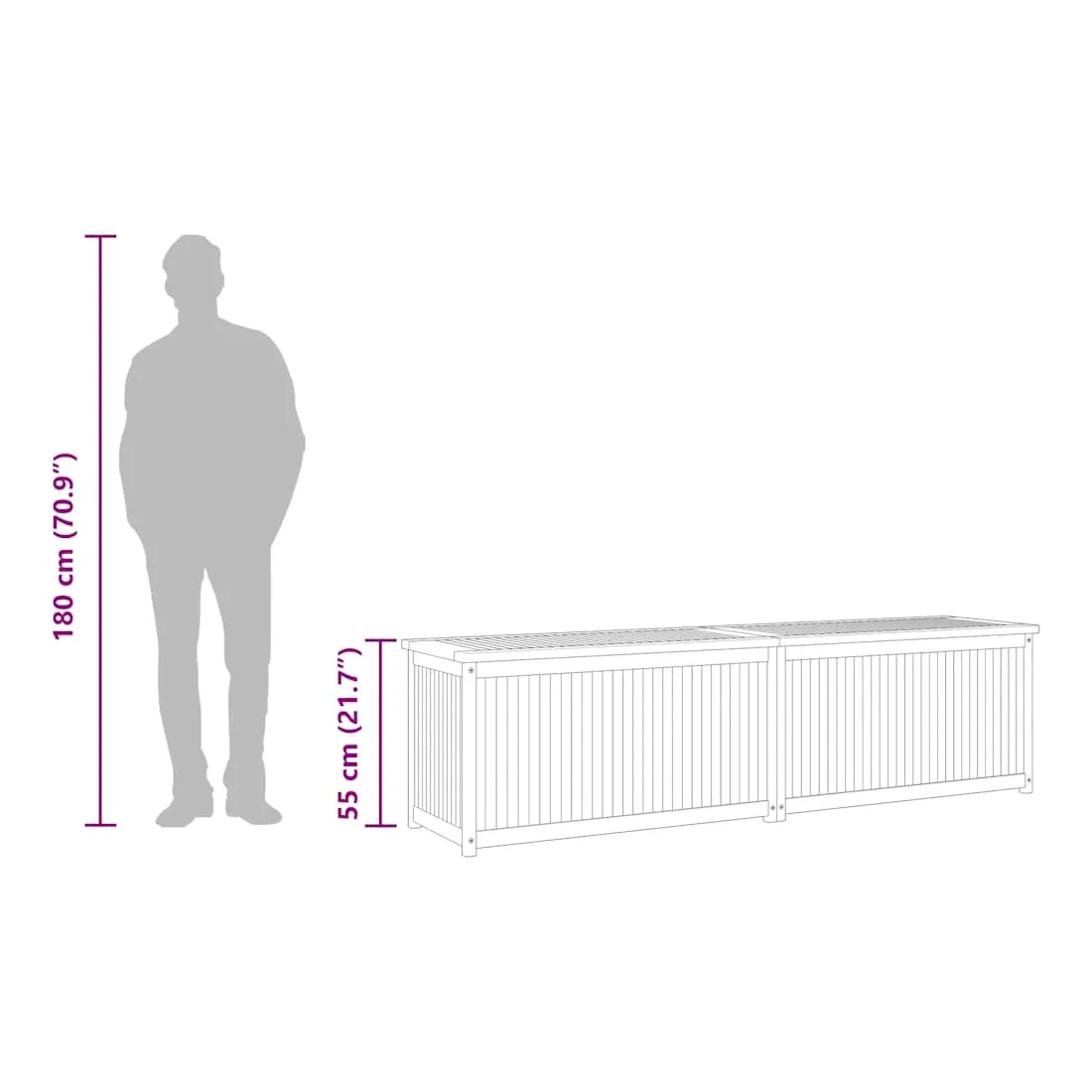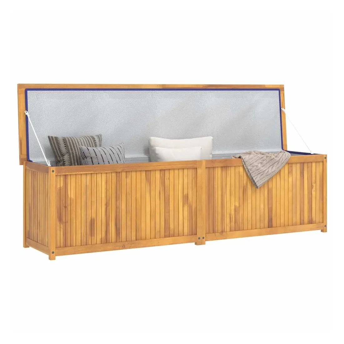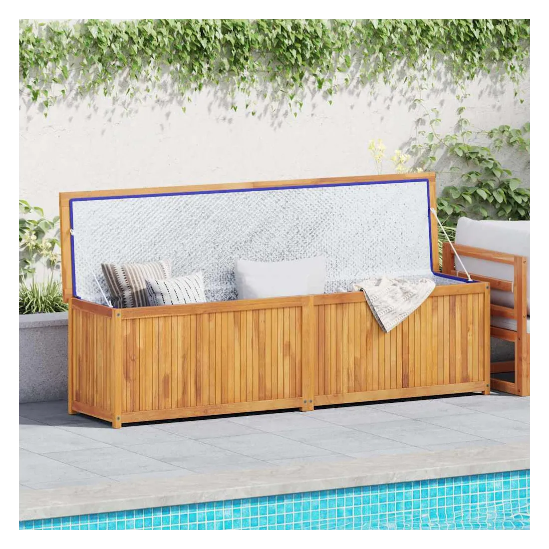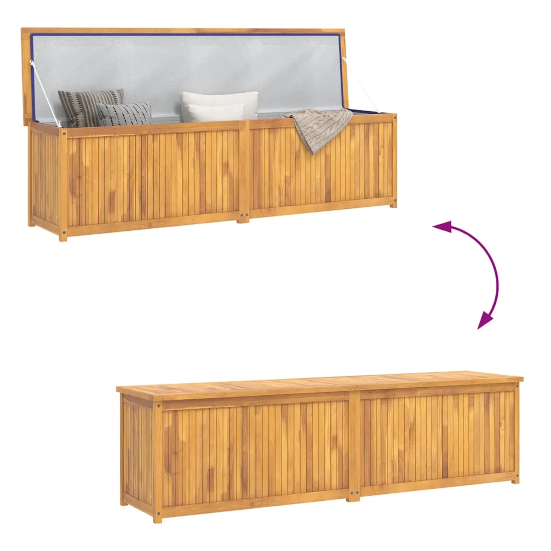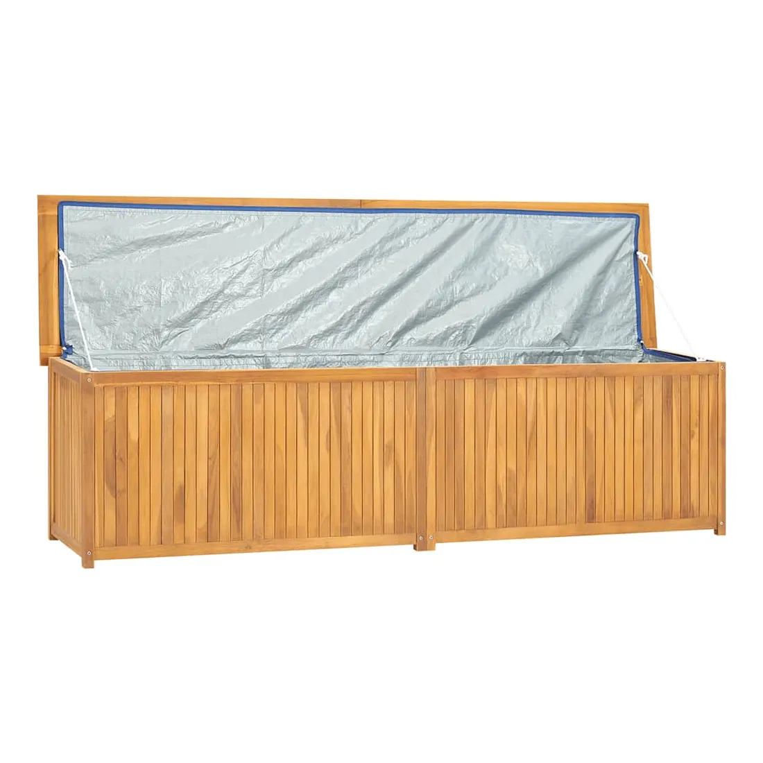 Avec un couvercle facile à ouvrir, cette boîte de jardin vous donne beaucoup d'espace pour ranger vos outils et autres articles utiles. Matériau de première qualité : le bois de teck massif est un matériau naturel magnifique. Il a été chevronné, séché au four, puis poncé finement pour lui donner un aspect très lisse. Le bois de teck est très solide et résiste aux intempéries.Beaucoup d'espace : le coffre spacieux de cette boîte de jardin peut être utilisé pour ranger des coussins, des outils de jardinage et d'autres accessoires, tout en gardant le contenu organisé.Accessoires utiles : il y a un sac en PE à l'intérieur. Il est très utile de mettre les choses dans ce sac pour les garder au sec.Occasions applicables : cette boîte de jardin est idéale pour le jardin, l'abri et le garage. Remarque :Afin de prolonger la durée de vie de votre mobilier d'extérieur, nous vous recommandons de le protéger avec une housse imperméable.