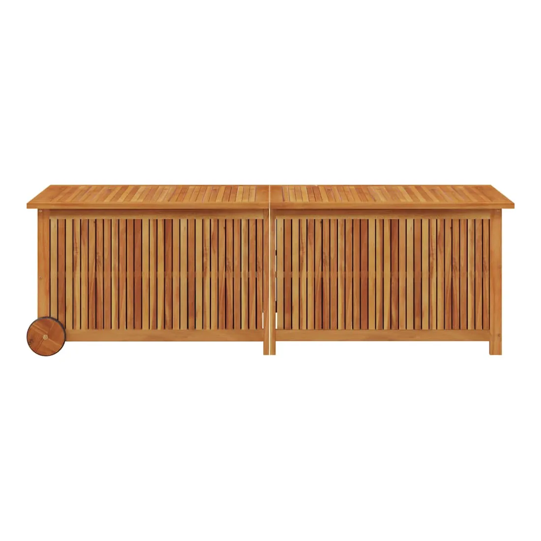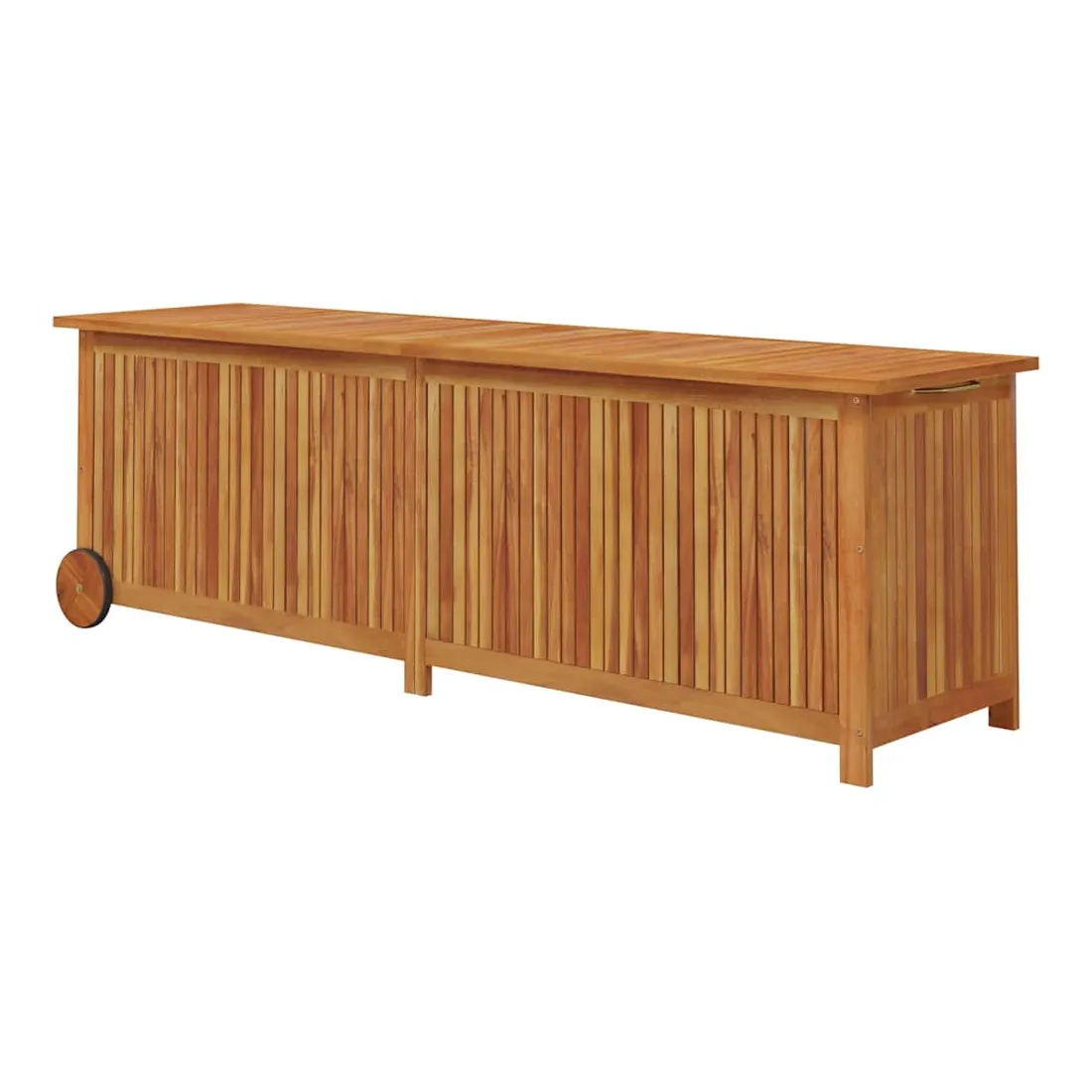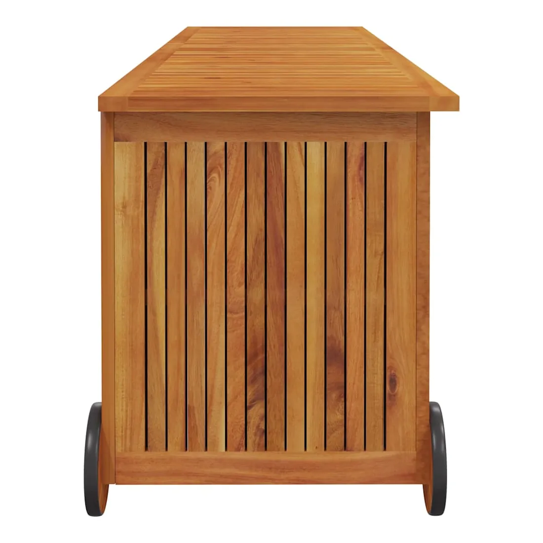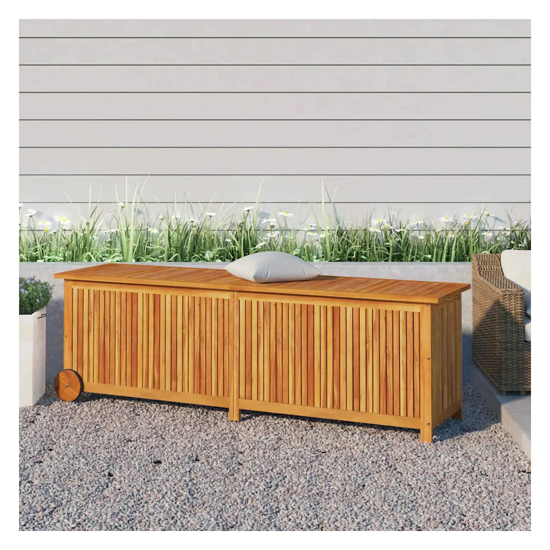 Cette boîte de rangement de jardin en bois offre un grand espace de rangement pour les coussins de meubles de jardin, les jouets, les outils de jardinage et tout ce que vous aimez garder à portée de main dans l'espace de vie extérieur. Elle peut également être utilisée à l'intérieur. Matériau durable : la boîte de rangement extérieure est fabriquée en bois d'acacia massif. Le bois d'acacia massif est un matériau naturel magnifique, dense, robuste et durable.Grand espace de rangement : l'espace de rangement facilite l'organisation des articles. Il convient au rangement de vos coussins, oreillers, couvertures, jouets et autres objets.Design pratique : le sac intérieur résistant à l'eau avec fermeture éclair protège vos articles de l'humidité et de la poussière. La boîte à coussins de jardin est également facile à déplacer grâce aux roues et à la poignée. Bon à savoir :Pour faciliter au maximum le montage, chaque produit est livré avec des instructions. Remarque :Pour que vos meubles d'extérieur restent beaux, nous vous recommandons de les protéger avec une housse imperméable.