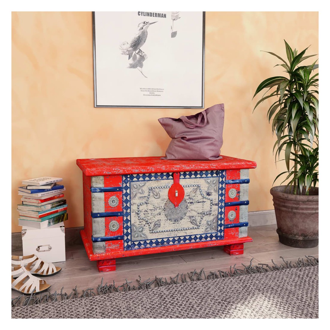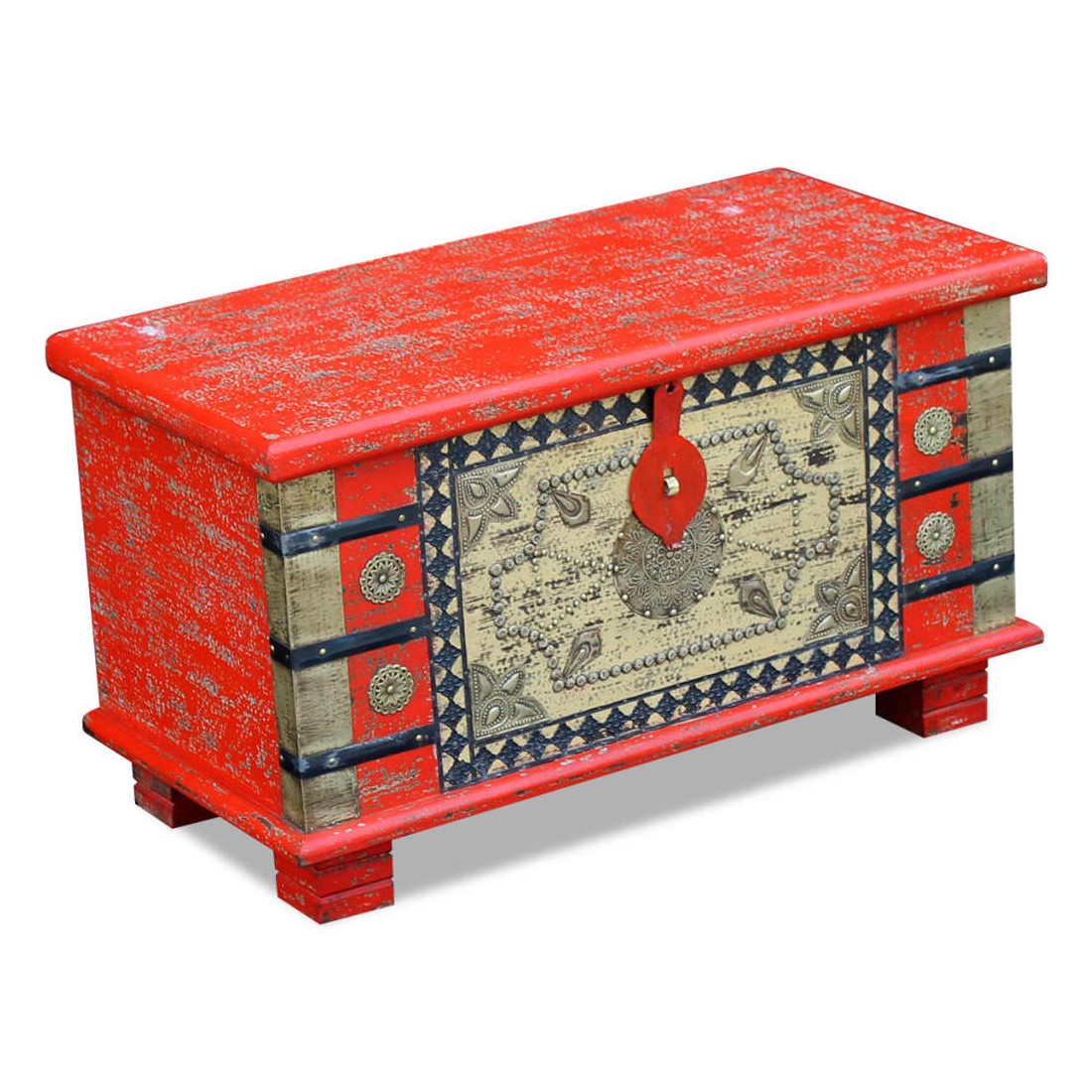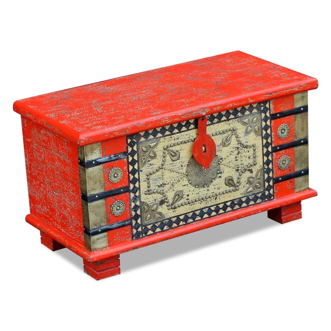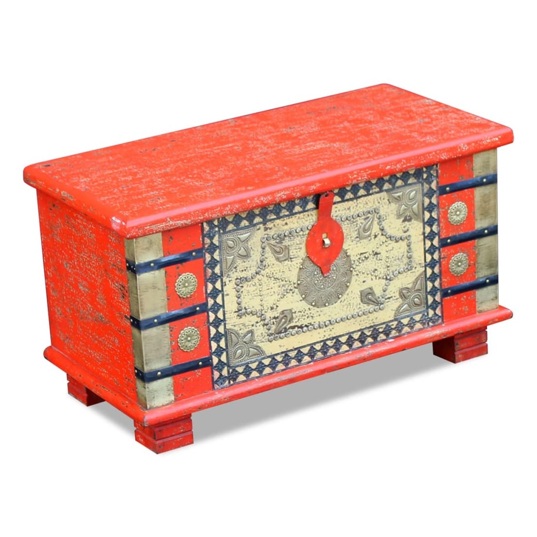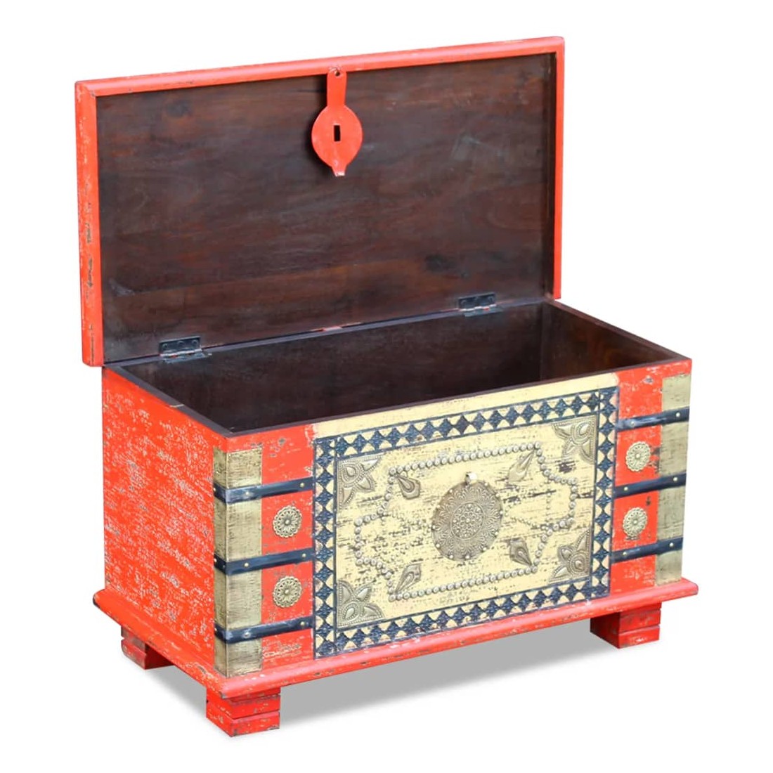 Ce coffre de rangement au style antique sera un ajout unique à votre pièce. Sa construction en bois massif le rend stable et adapté pour y poser des verres, des paniers de fruits ou des objets décoratifs. En déverrouillant le coffre (cadenas non inclut dans la livraison), vous pouvez facilement y ranger un grand nombre de choses. Il peut également être utilisé comme coffre décoratif ou comme table basse. Fait en bois de manguier, ce coffre est solide, durable et magnifique. La finition antique et les motifs décoratifs donnent à chaque mobilier sa propre histoire et un aspect unique. Ce coffre indien est entièrement fait à la main. Chaque étape du processus est effectuée avec le plus grand soin, qu'il s'agisse du polissage, de la peinture ou du cirage.