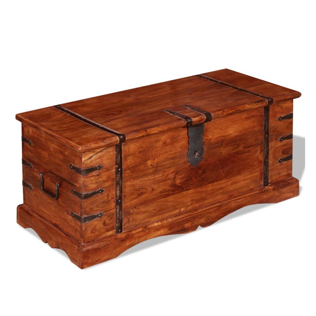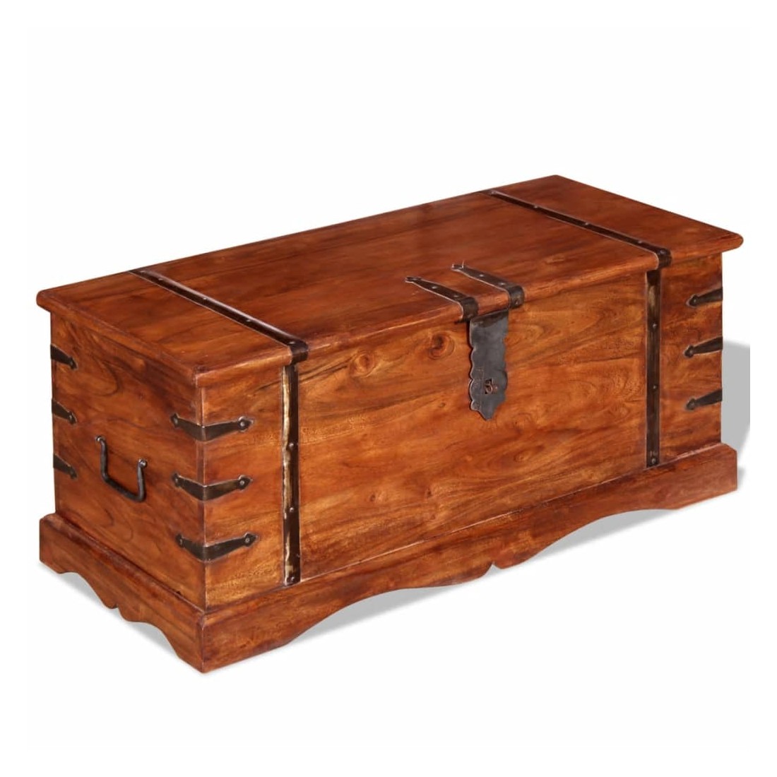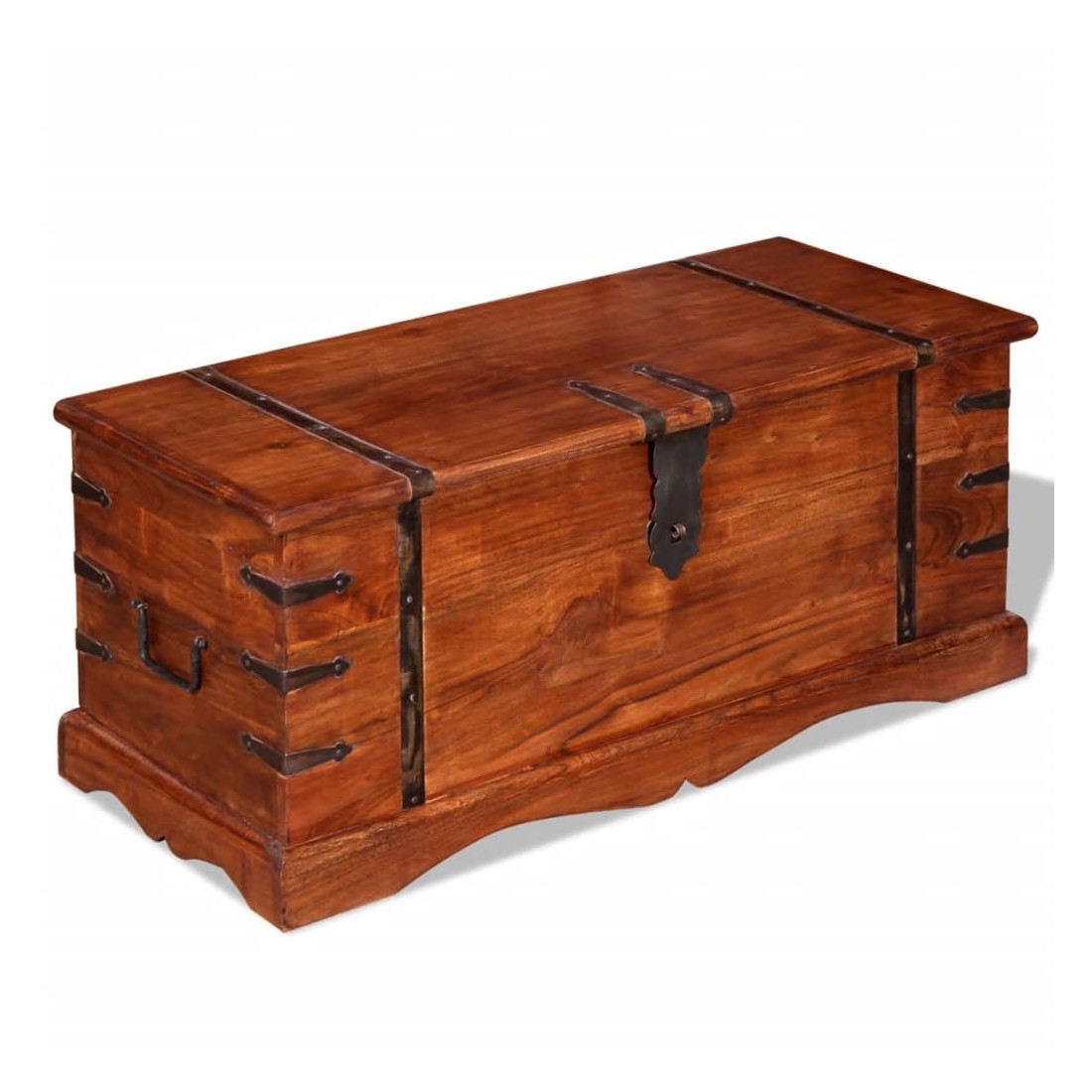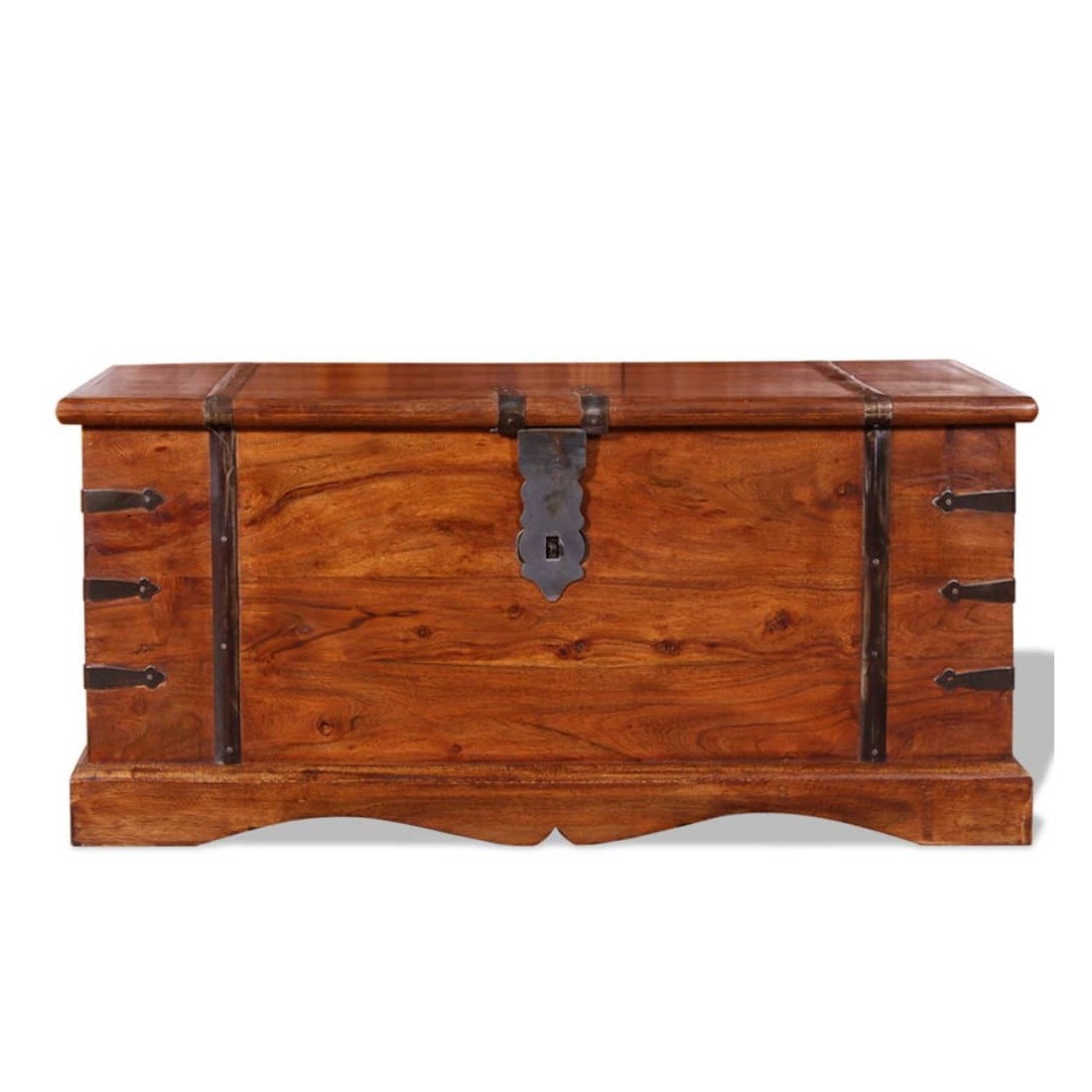 Ce coffre de rangement unique, fait en bois massif avec une finition en couleur miel, sera un excellent ajout à votre pièce. Le coffre de rangement offre suffisamment d'espace pour ranger des vêtements, des magazines, des livres, des outils et d'autres accessoires. Elle dispose d'un loquet situé à l'avant et de deux poignées sur les côtés. Grâce à la stabilité du dessus plat, cette boîte en bois peut également être utilisée comme une table basse, une table auxiliaire, une table de salon, une table d'appoint, etc. Le coffre de rangement a été fabriqué à la main à partir de bois d'acacia massif et présente les caractéristiques de palissandre et de rose. Le superbe artisanat et les magnifiques grains de bois rendent chaque meuble unique et légèrement différent du suivant. Remarque importa