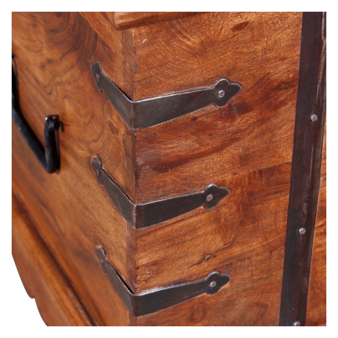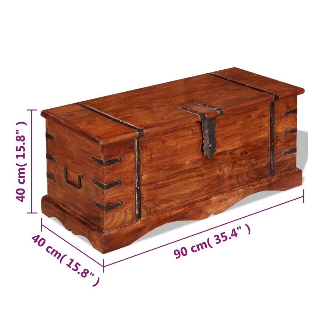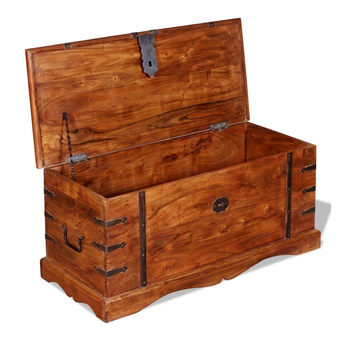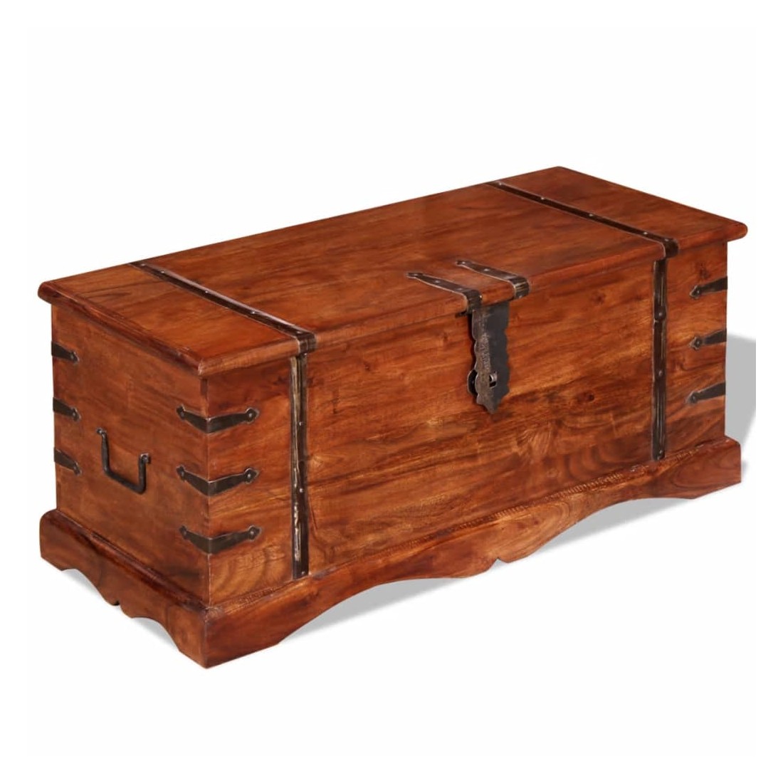 Ce coffre de rangement unique, fait en bois massif avec une finition en couleur miel, sera un excellent ajout à votre pièce. Le coffre de rangement offre suffisamment d'espace pour ranger des vêtements, des magazines, des livres, des outils et d'autres accessoires. Elle dispose d'un loquet situé à l'avant et de deux poignées sur les côtés. Grâce à la stabilité du dessus plat, cette boîte en bois peut également être utilisée comme une table basse, une table auxiliaire, une table de salon, une table d'appoint, etc. Le coffre de rangement a été fabriqué à la main à partir de bois d'acacia massif et présente les caractéristiques de palissandre et de rose. Le superbe artisanat et les magnifiques grains de bois rendent chaque meuble unique et légèrement différent du suivant. Remarque importa