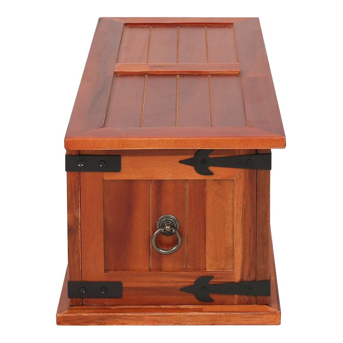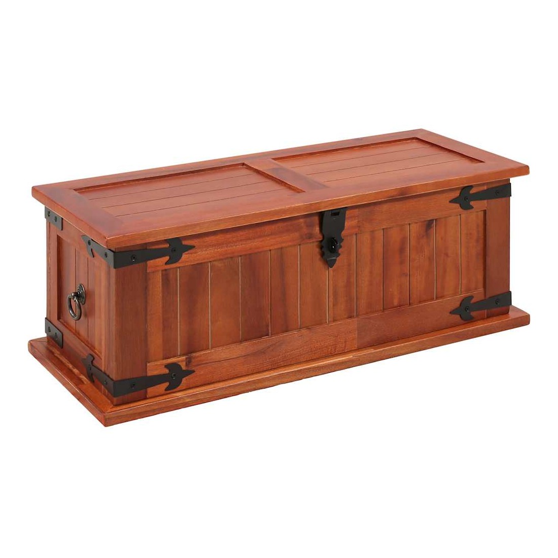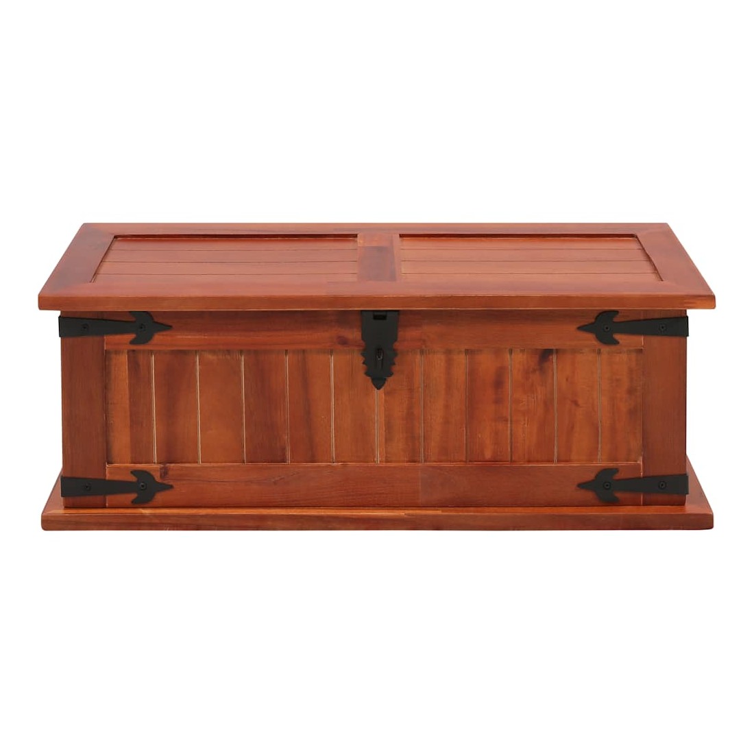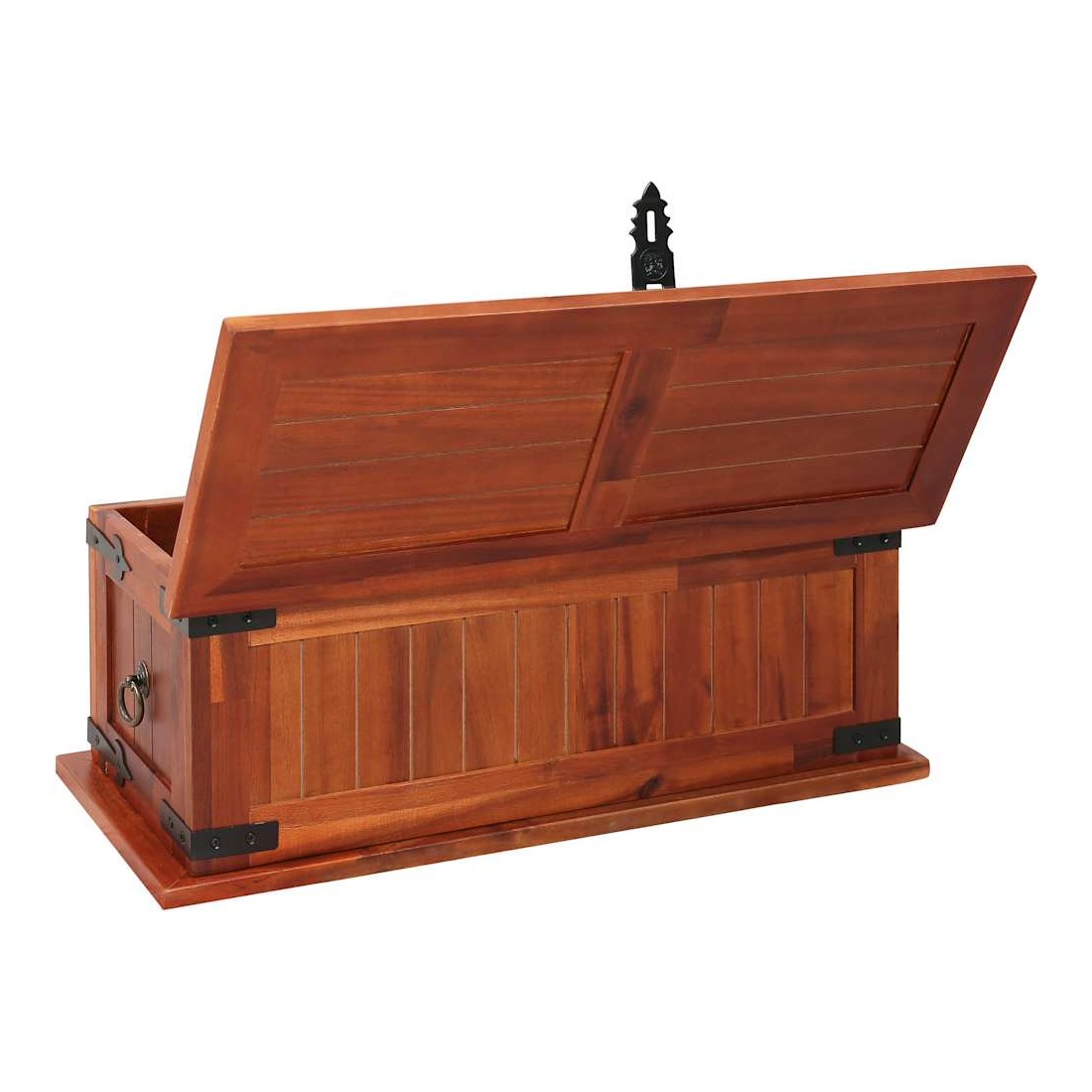 Ce coffre de rangement unique, en bois d'acacia solide et en MDF, sera un excellent supplément à votre pièce. Le coffre de rangement offre suffisamment d'espace pour ranger des vêtements, des magazines, des livres, des outils et d'autres accessoires. Il dispose d'un loquet situé à l'avant et de deux poignées sur les côtés. Grâce à la stabilité du dessus plat, cette boîte en bois peut également être utilisée comme une table basse, une table auxiliaire, une table de salon, une table d'appoint, etc. Le coffre de rangement a été fabriqué à la main en bois d'acacia solide. Le superbe artisanat et les magnifiques grains de bois rendent chaque meuble unique et légèrement différent l'un de l'autre.
