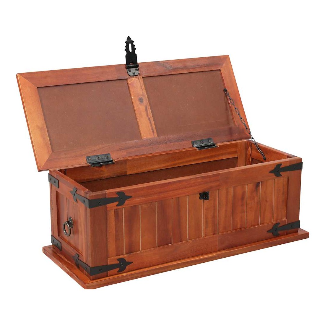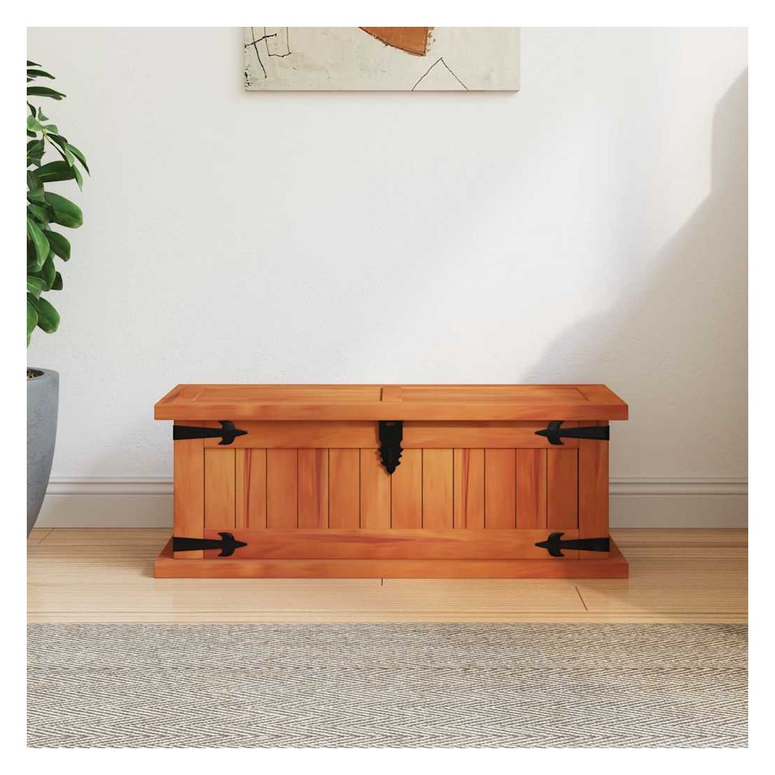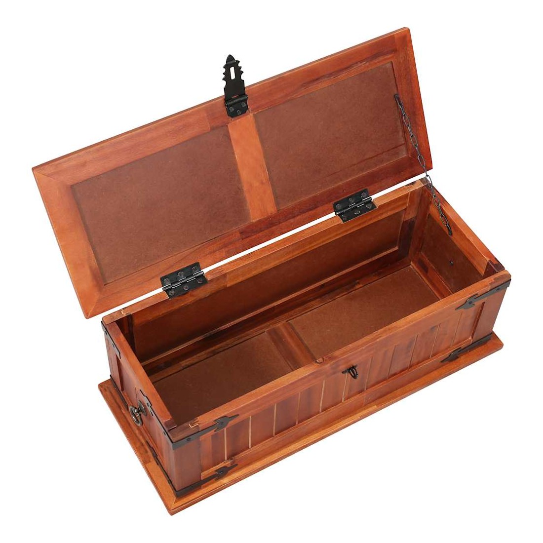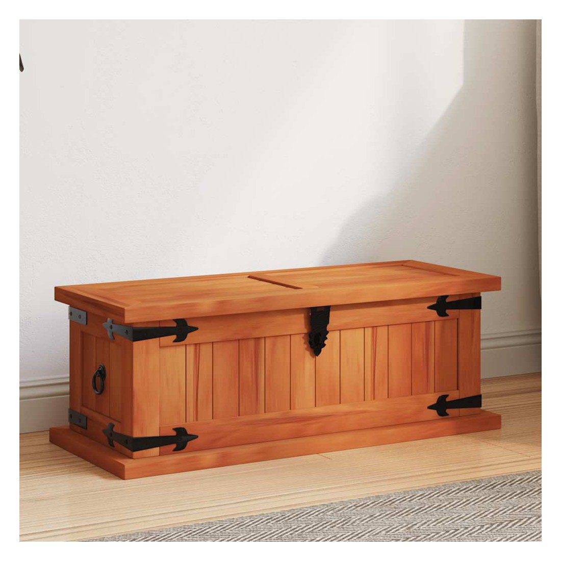 Ce coffre de rangement unique, en bois d'acacia solide et en MDF, sera un excellent supplément à votre pièce. Le coffre de rangement offre suffisamment d'espace pour ranger des vêtements, des magazines, des livres, des outils et d'autres accessoires. Il dispose d'un loquet situé à l'avant et de deux poignées sur les côtés. Grâce à la stabilité du dessus plat, cette boîte en bois peut également être utilisée comme une table basse, une table auxiliaire, une table de salon, une table d'appoint, etc. Le coffre de rangement a été fabriqué à la main en bois d'acacia solide. Le superbe artisanat et les magnifiques grains de bois rendent chaque meuble unique et légèrement différent l'un de l'autre.