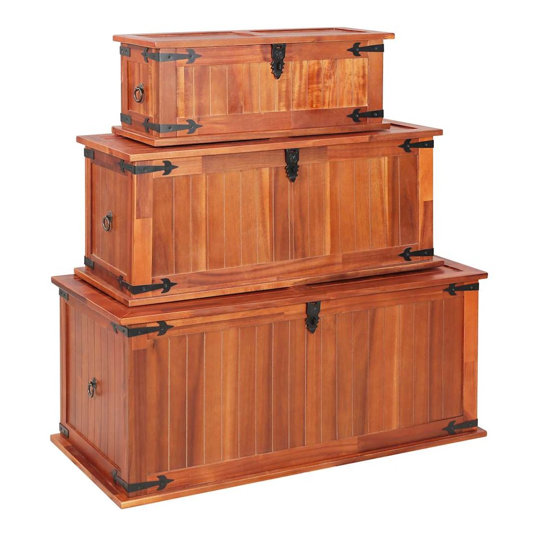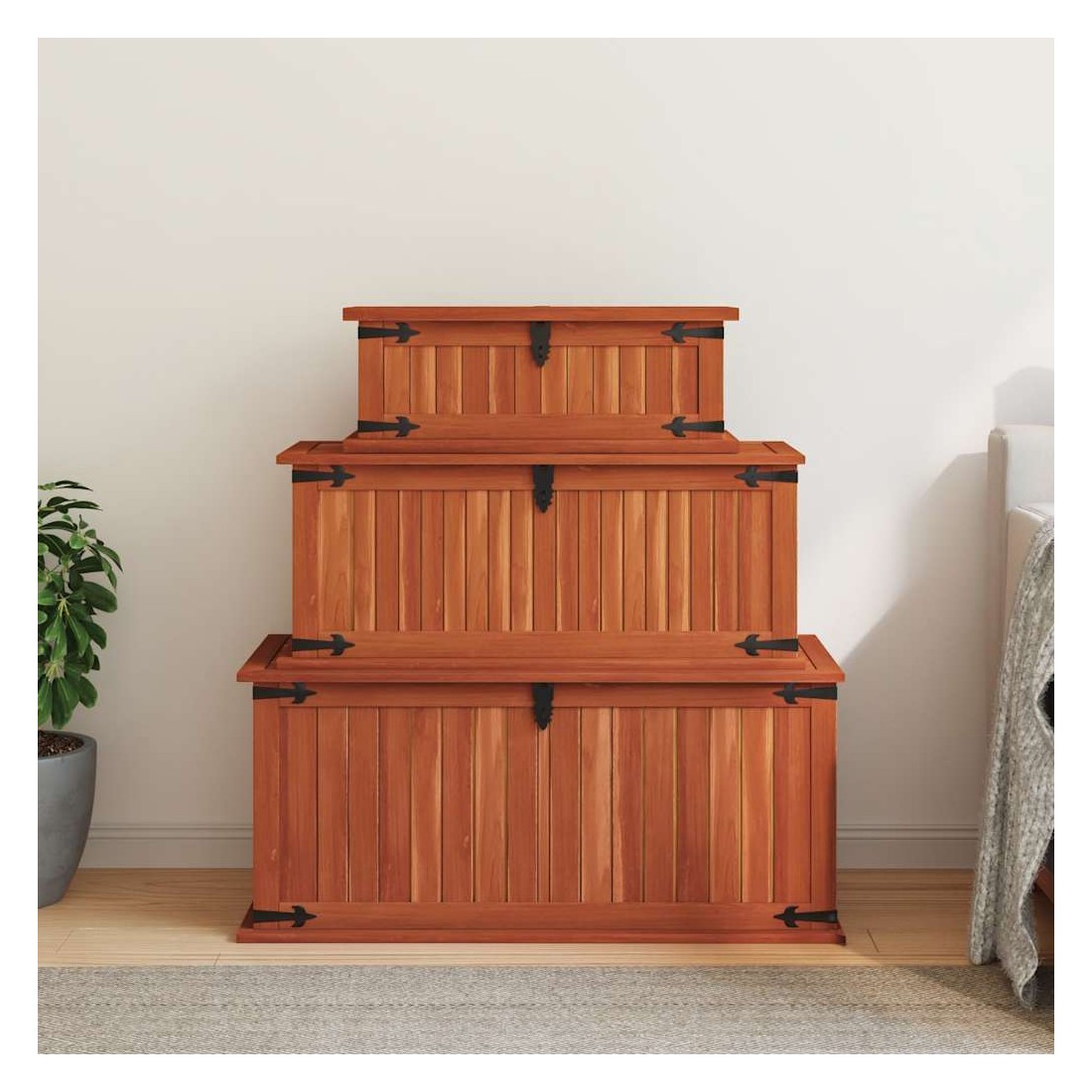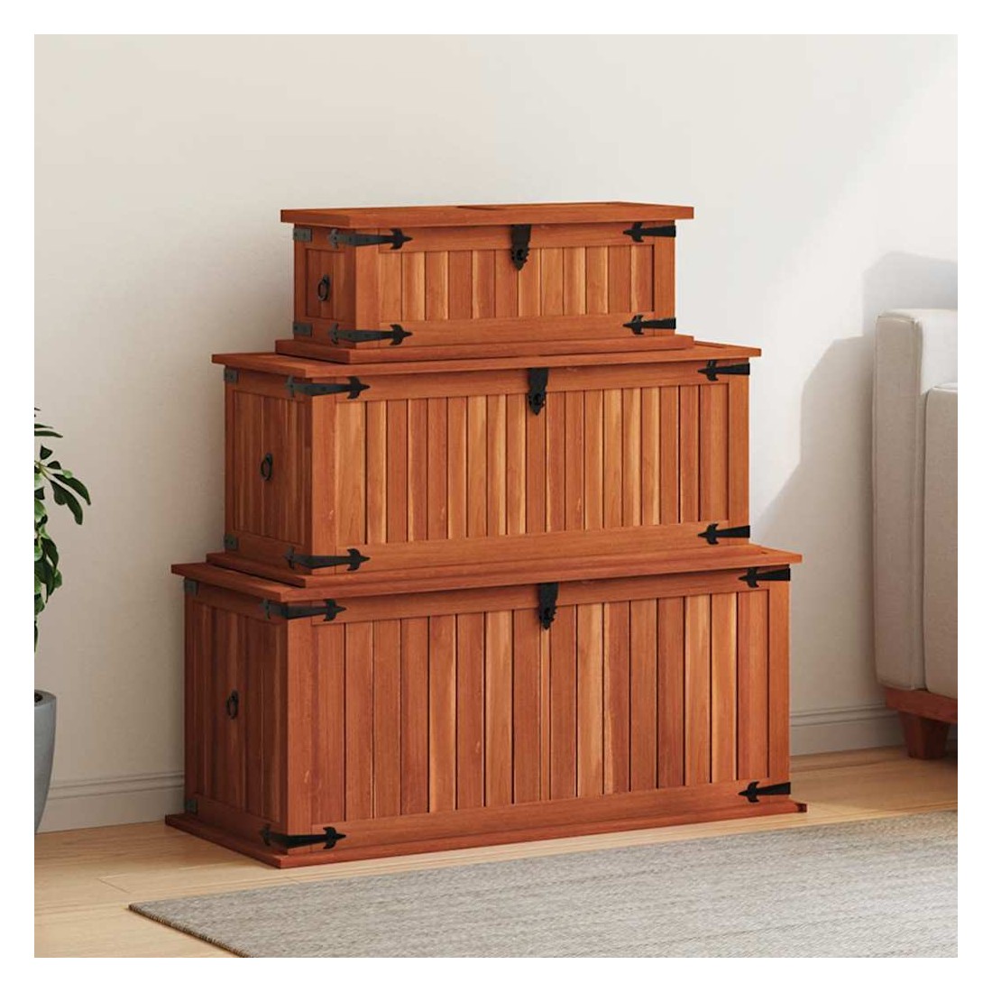 Ce coffre de rangement unique, en bois d'acacia solide et en MDF, sera un excellent supplément à votre pièce. Le coffre de rangement offre suffisamment d'espace pour ranger des vêtements, des magazines, des livres, des outils et d'autres accessoires. Il dispose d'un loquet situé à l'avant et de deux poignées sur les côtés. Grâce à la stabilité du dessus plat, cette boîte en bois peut également être utilisée comme une table basse, une table auxiliaire, une table de salon, une table d'appoint, etc. Le coffre de rangement a été fabriqué à la main en bois d'acacia solide. Le superbe artisanat et les magnifiques grains de bois rendent chaque meuble unique et légèrement différent l'un de l'autre. La livraison comprend 3 coffres de rangement.