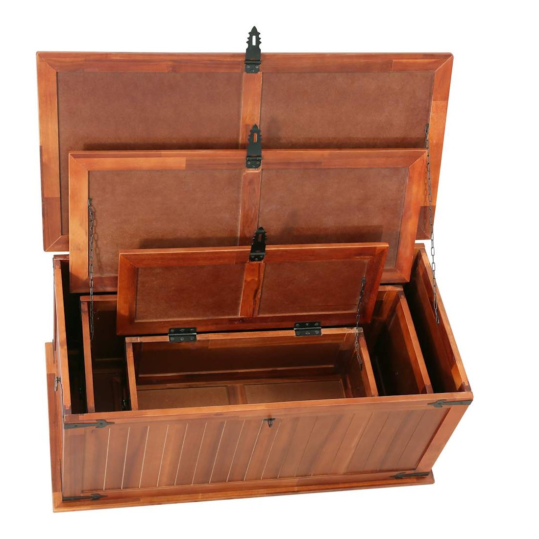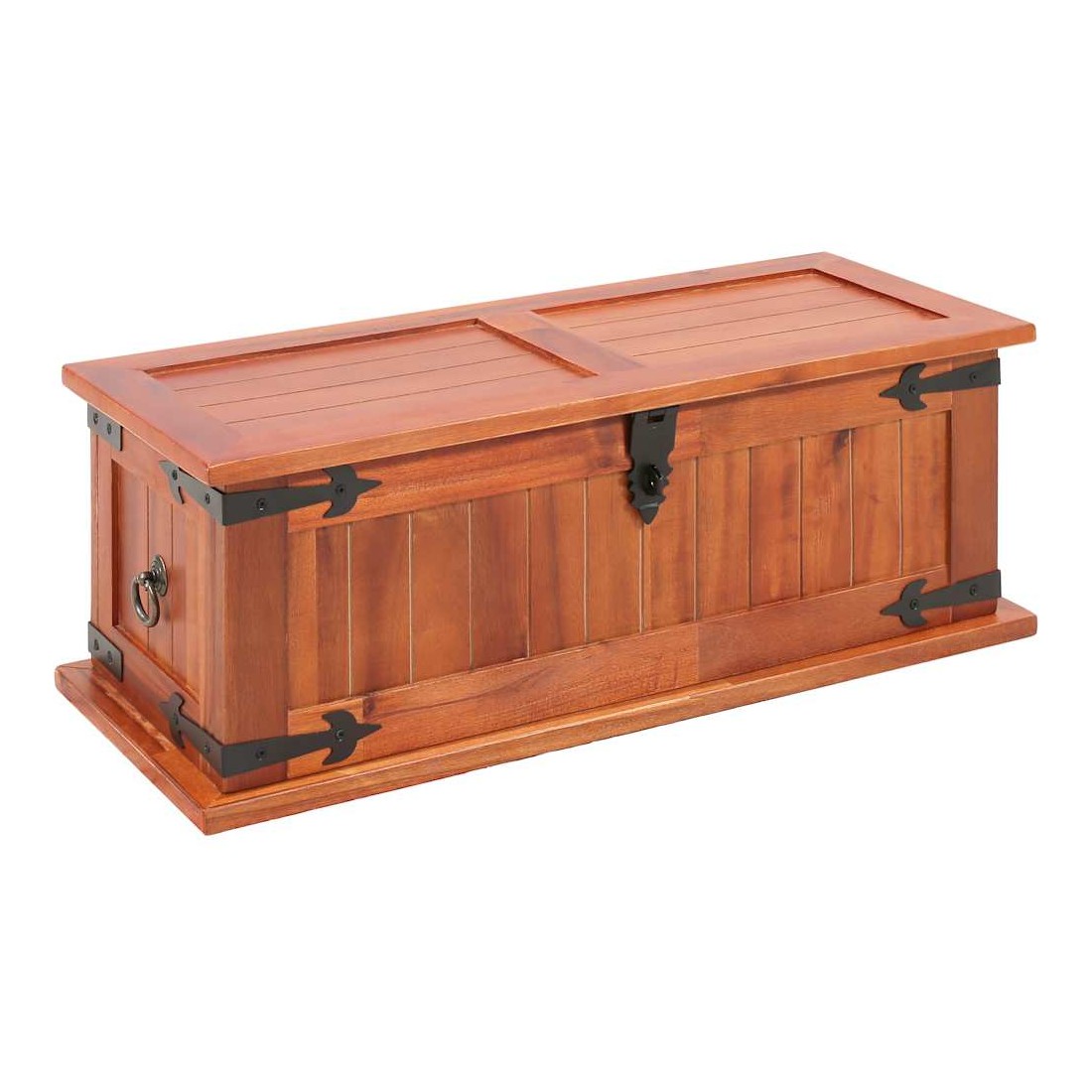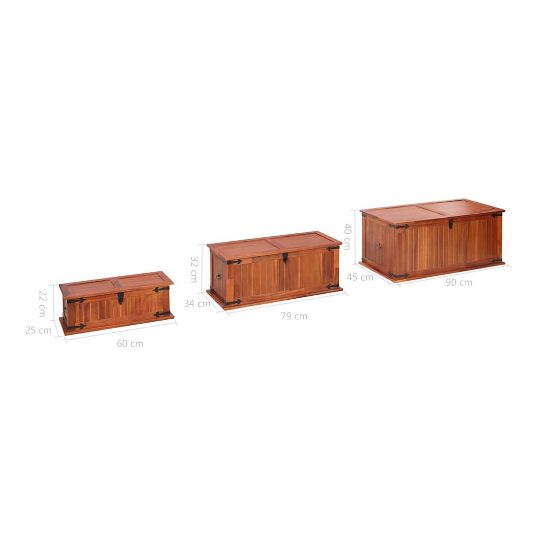 Ce coffre de rangement unique, en bois d'acacia solide et en MDF, sera un excellent supplément à votre pièce. Le coffre de rangement offre suffisamment d'espace pour ranger des vêtements, des magazines, des livres, des outils et d'autres accessoires. Il dispose d'un loquet situé à l'avant et de deux poignées sur les côtés. Grâce à la stabilité du dessus plat, cette boîte en bois peut également être utilisée comme une table basse, une table auxiliaire, une table de salon, une table d'appoint, etc. Le coffre de rangement a été fabriqué à la main en bois d'acacia solide. Le superbe artisanat et les magnifiques grains de bois rendent chaque meuble unique et légèrement différent l'un de l'autre. La livraison comprend 3 coffres de rangement.