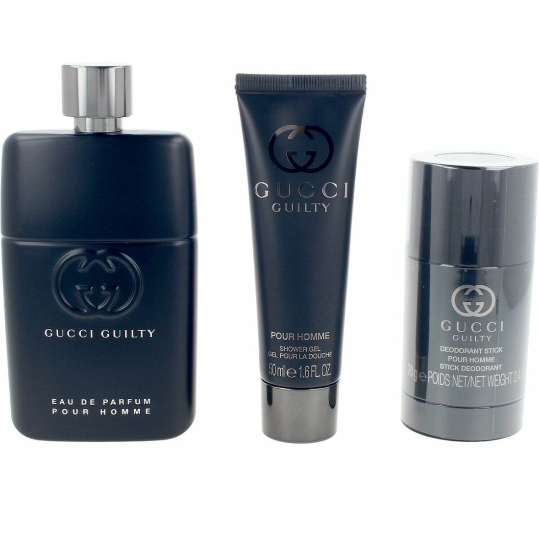 Le set de parfum Gucci Guilty Pour Homme propose une combinaison exclusive conçue pour le soin et la fragrance masculine, comprenant un Eau de Parfum spray de 90 ml, un déodorant stick de 75 ml et un gel douche de 50 ml, tous fabriqués en France, soulignant ainsi leur qualité et prestige. Ce coffret multifonction offre une expérience complète de fraîcheur et de parfum longue durée, incarnant l’essence de Gucci Guilty comme une option polyvalente et sophistiquée pour le soin personnel. Bien qu’initialement destiné aux hommes, le produit présente un profil unisexe, s’adaptant à divers goûts grâce à sa composition équilibrée et élégante. L’inclusion du gel douche permet un nettoyage doux et respectueux de la peau, tandis que le déodorant stick assure une protection efficace et un confort tout au long de la journée, complétant l’intensité et le caractère profond du parfum. Cet ensemble est idéal pour ceux qui recherchent praticité sans renoncer au style ni à la personnalité propre à Gucci, offrant tous les éléments essentiels pour le rituel quotidien d’hygiène et de parfumerie masculine avec un haut standard. En résumé, le set Gucci Guilty Pour Homme représente une solution complète pour le soin de la peau et la fragrance personnelle, alliant fonctionnalité et exclusivité en un seul coffret.