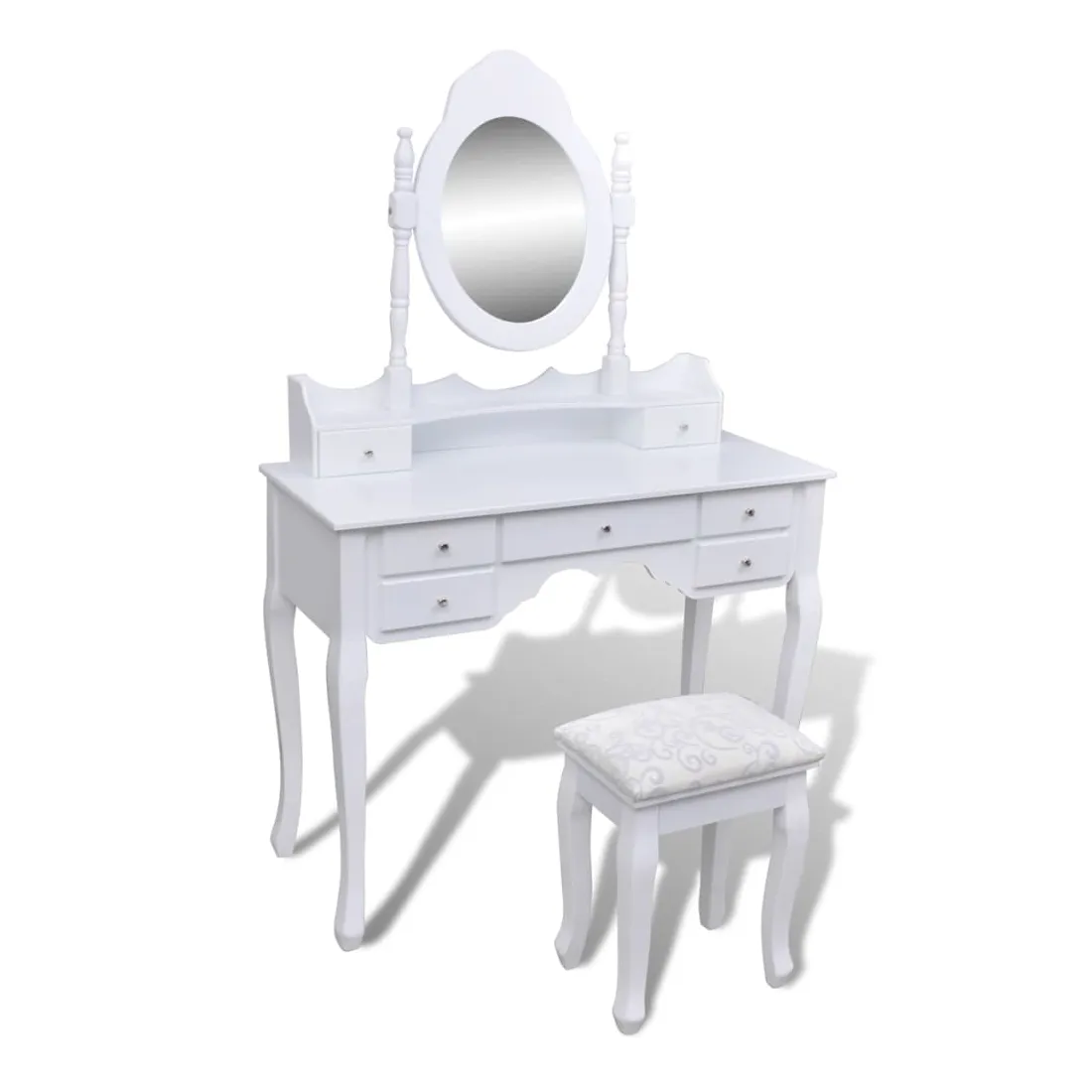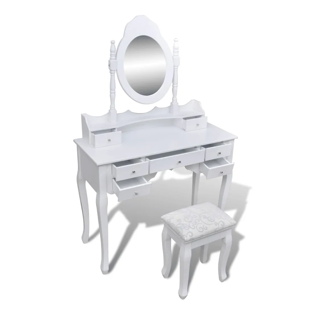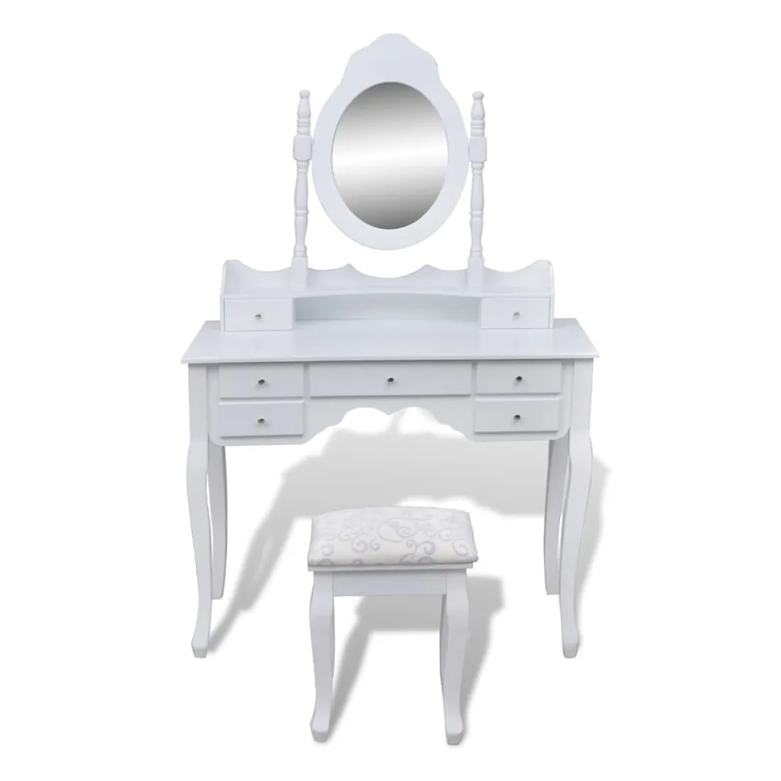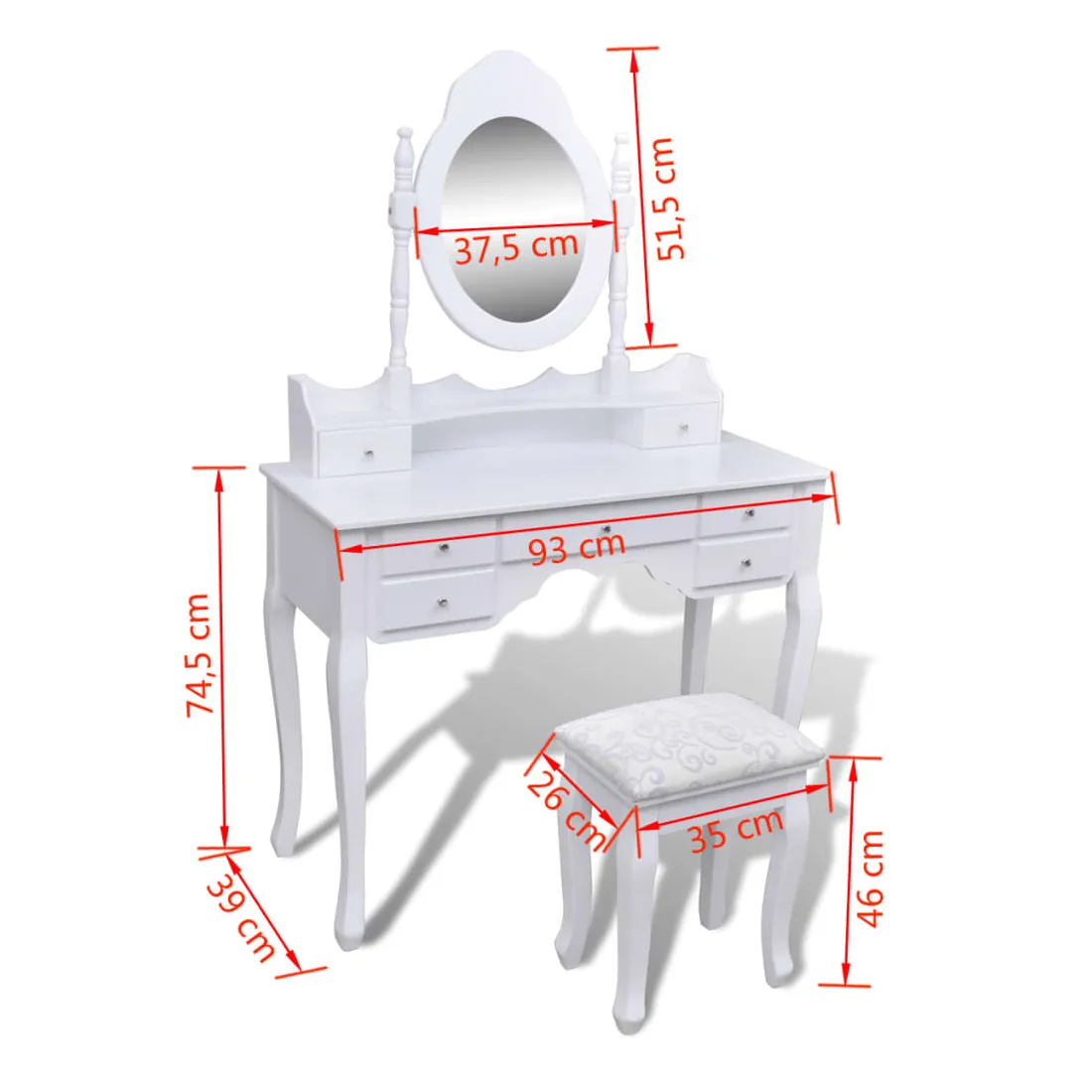 Cet ensemble XXL charmant de coiffeuse et de tabouret est fait de bois de pin de haute qualité. Son style victorien et sa finition blanche et propre apporteront élégance et beauté à votre boudoir ou vestiaire. L'artisanat exquis est une autre caractéristique remarquable de cet ensemble de table et de tabouret. Le miroir de table a un cadre libre, donc vous pouvez le faire pivoter à un angle désiré. Le cadre du miroir et la table peuvent être utilisés séparément. Sept tiroirs chic vous offrent un espace supplémentaire pour vos ornements, cosmétiques et autres effets personnels. Cet ensemble de coiffeuse et de tabouret attirera tous les regards. Il sera assez facile à assembler avec les accessoires de montage inclus dans la livraison.