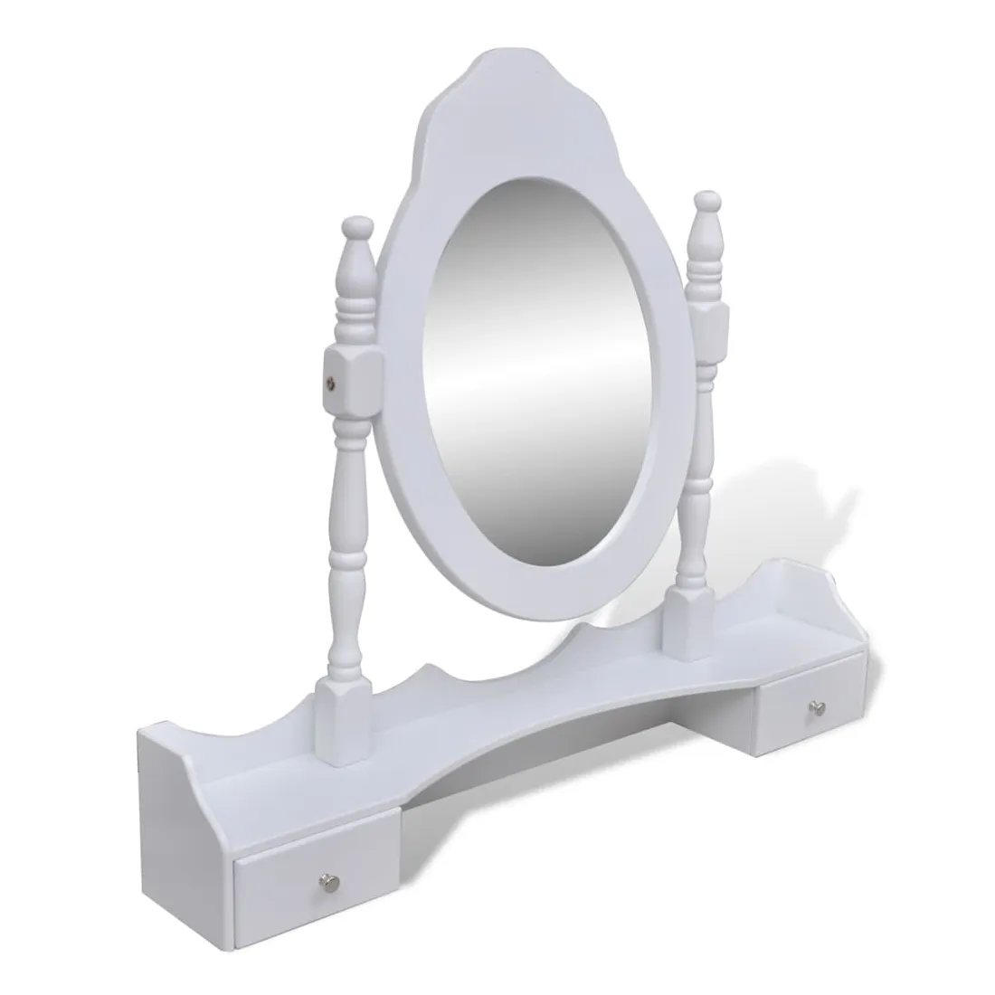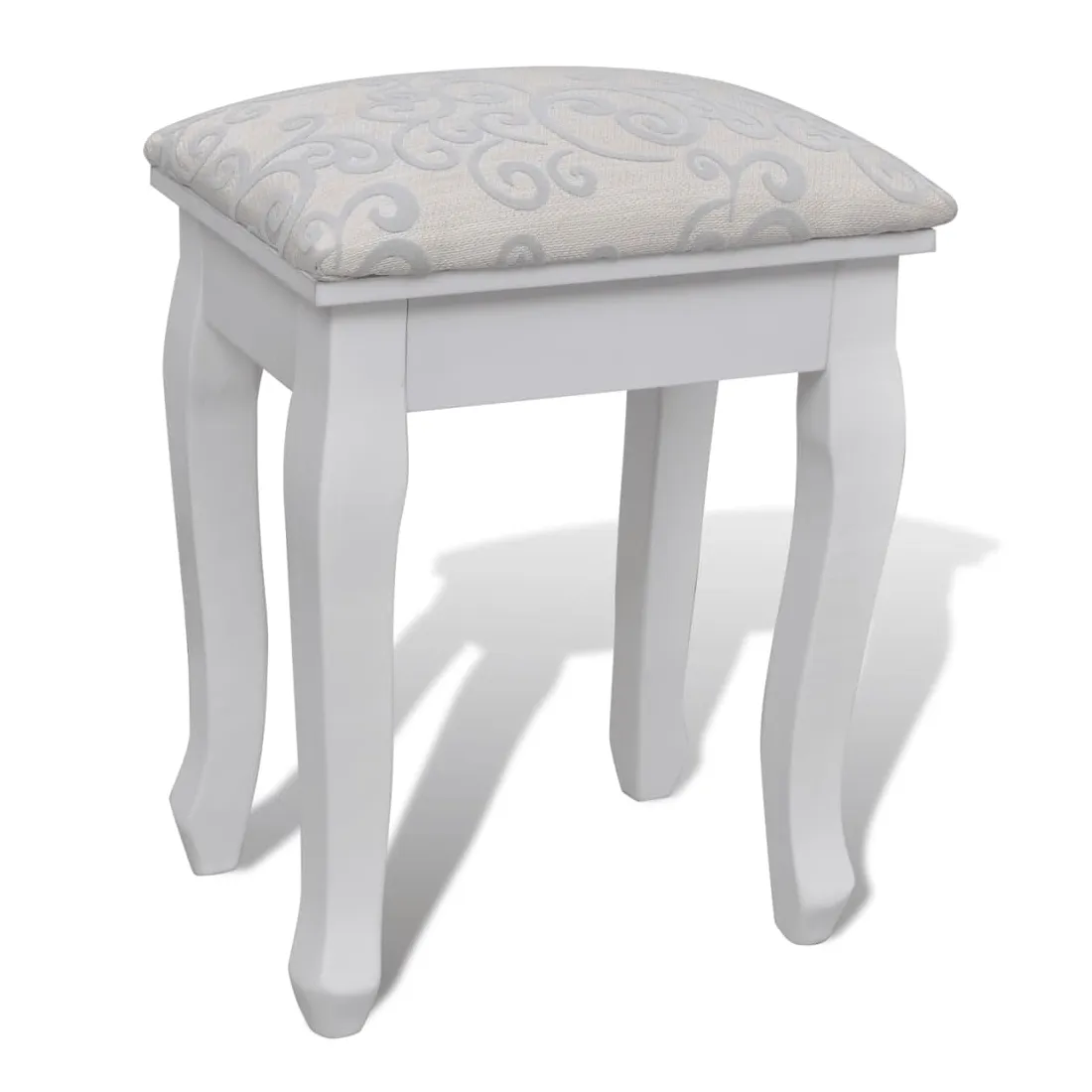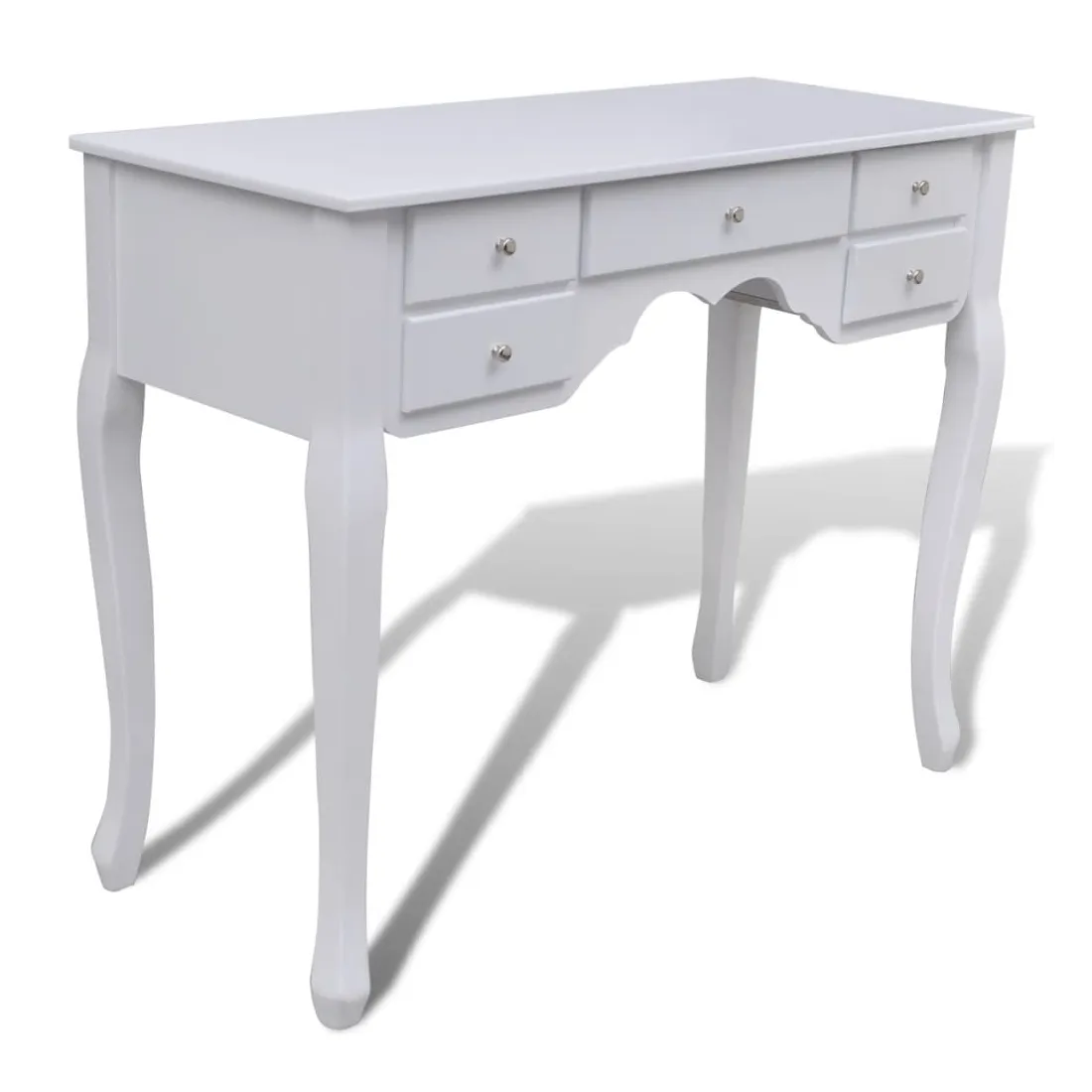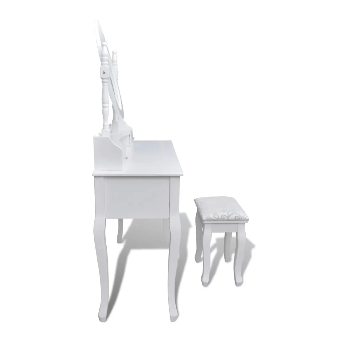 Cet ensemble XXL charmant de coiffeuse et de tabouret est fait de bois de pin de haute qualité. Son style victorien et sa finition blanche et propre apporteront élégance et beauté à votre boudoir ou vestiaire. L'artisanat exquis est une autre caractéristique remarquable de cet ensemble de table et de tabouret. Le miroir de table a un cadre libre, donc vous pouvez le faire pivoter à un angle désiré. Le cadre du miroir et la table peuvent être utilisés séparément. Sept tiroirs chic vous offrent un espace supplémentaire pour vos ornements, cosmétiques et autres effets personnels. Cet ensemble de coiffeuse et de tabouret attirera tous les regards. Il sera assez facile à assembler avec les accessoires de montage inclus dans la livraison.