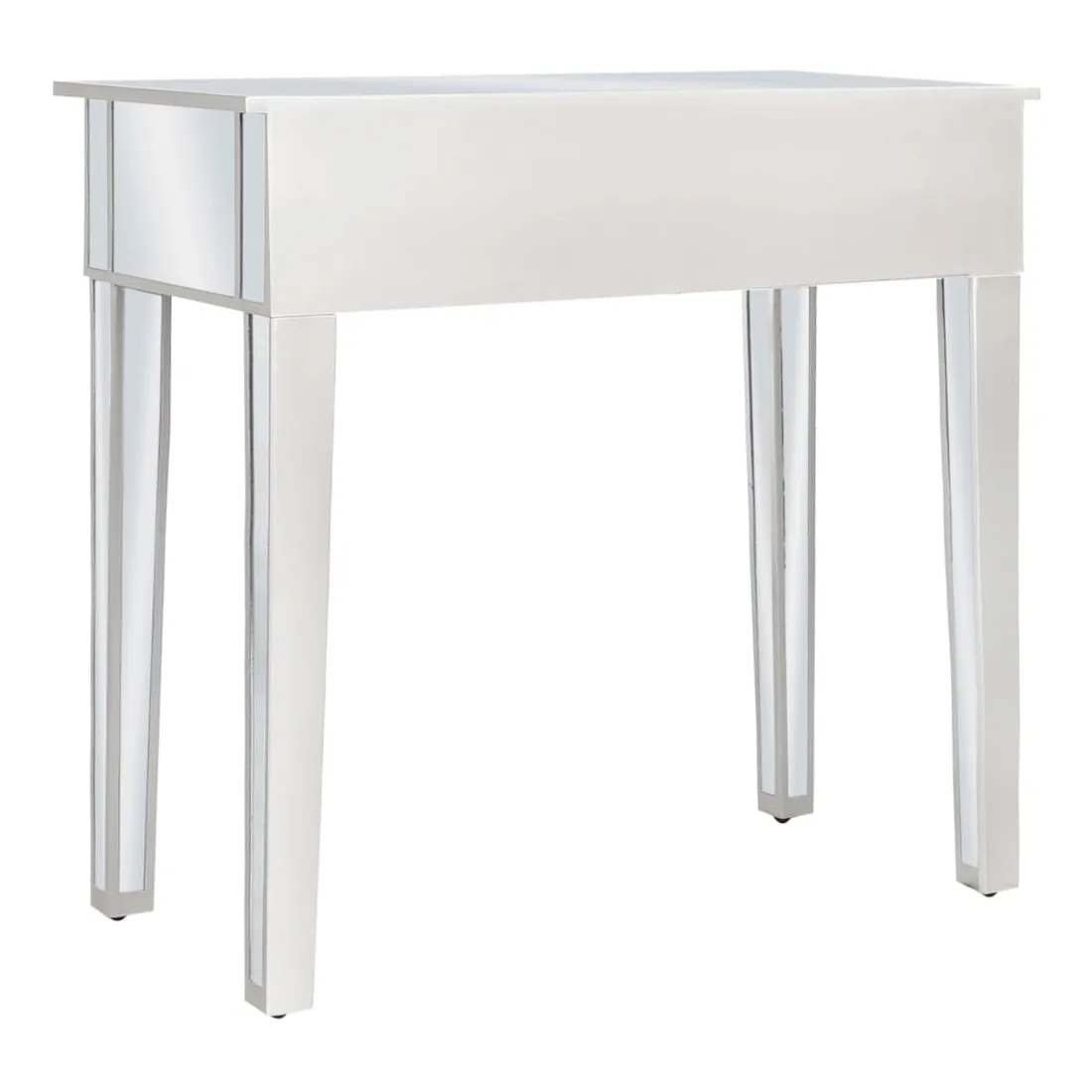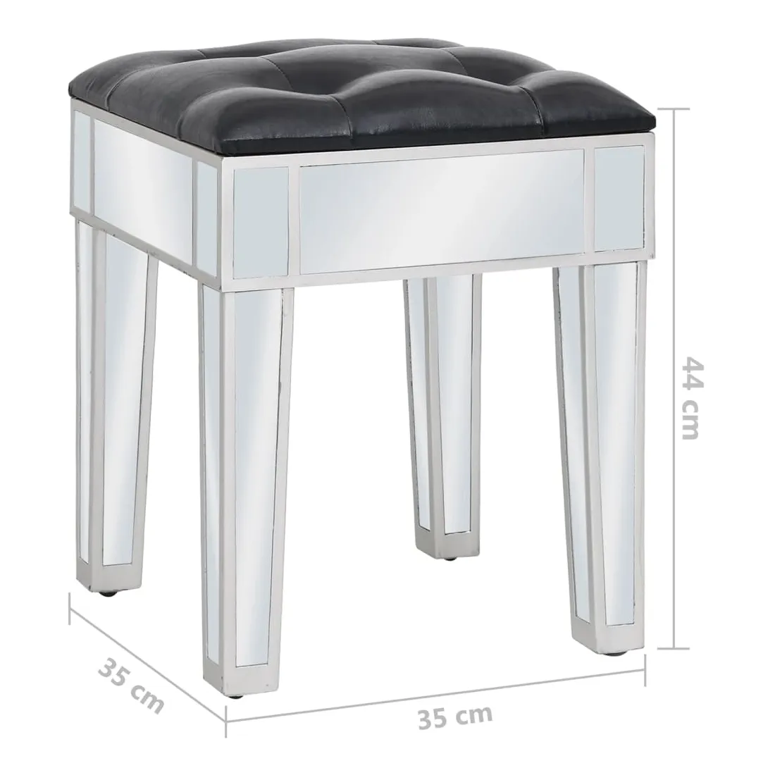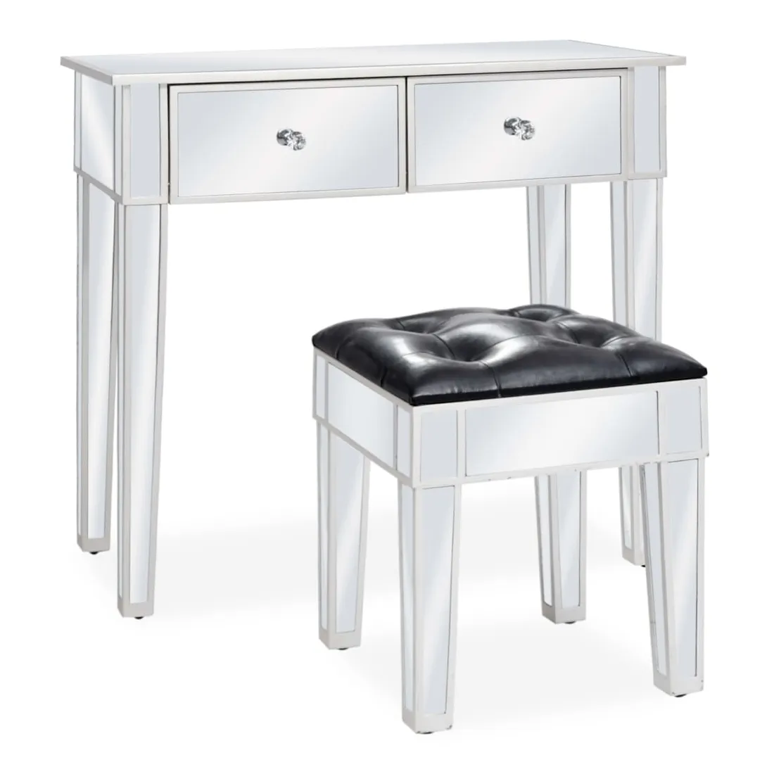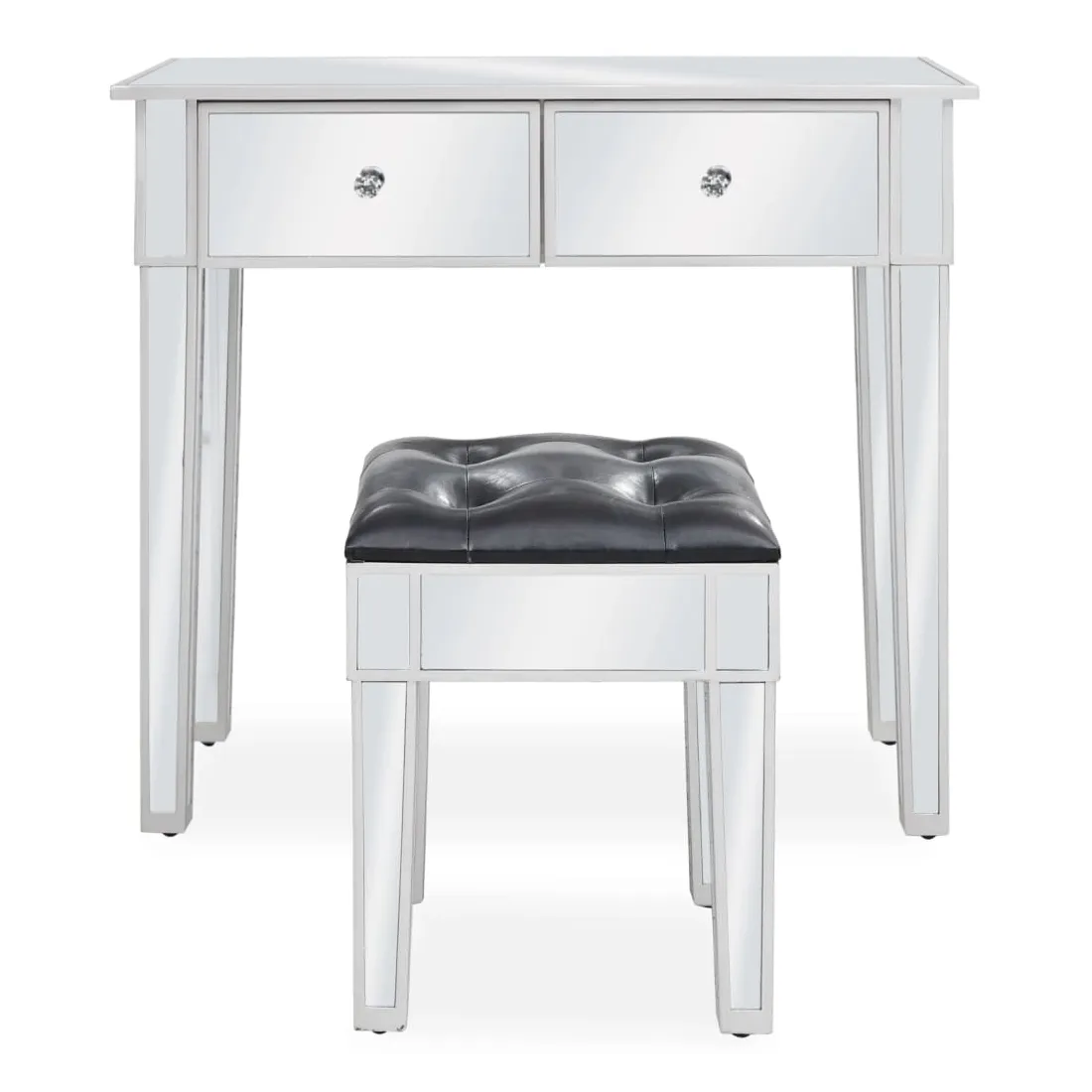 La coiffeuse miroir et le tabouret apporteront une touche d'élégance à votre décoration intérieure. L'ensemble de table de maquillage est orné de verre à effet miroir élégant et possède un aspect raffiné. La table de maquillage et le tabouret ont un cadre en MDF robuste. Les deux tiroirs offrent un espace pour garder toute sorte de petits objets rangés et à portée de main. La coiffeuse peut également être utilisée comme table console, meuble d'entrée, bureau, etc. Grâce à sa surface réfléchissante, l'ensemble de table embellira immédiatement votre intérieur et vous aidera à créer une sensation d'espace. Les poignées en faux cristal contribuent à son charme élégant et facilitent l’ouverture des tiroirs. Le siège est recouvert de cuir artificiel pour offrir un confort ultime et une touche de luxe. La table et le tabouret sont faciles à assembler.