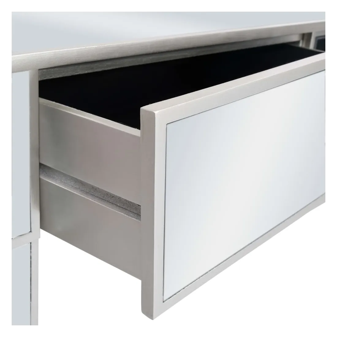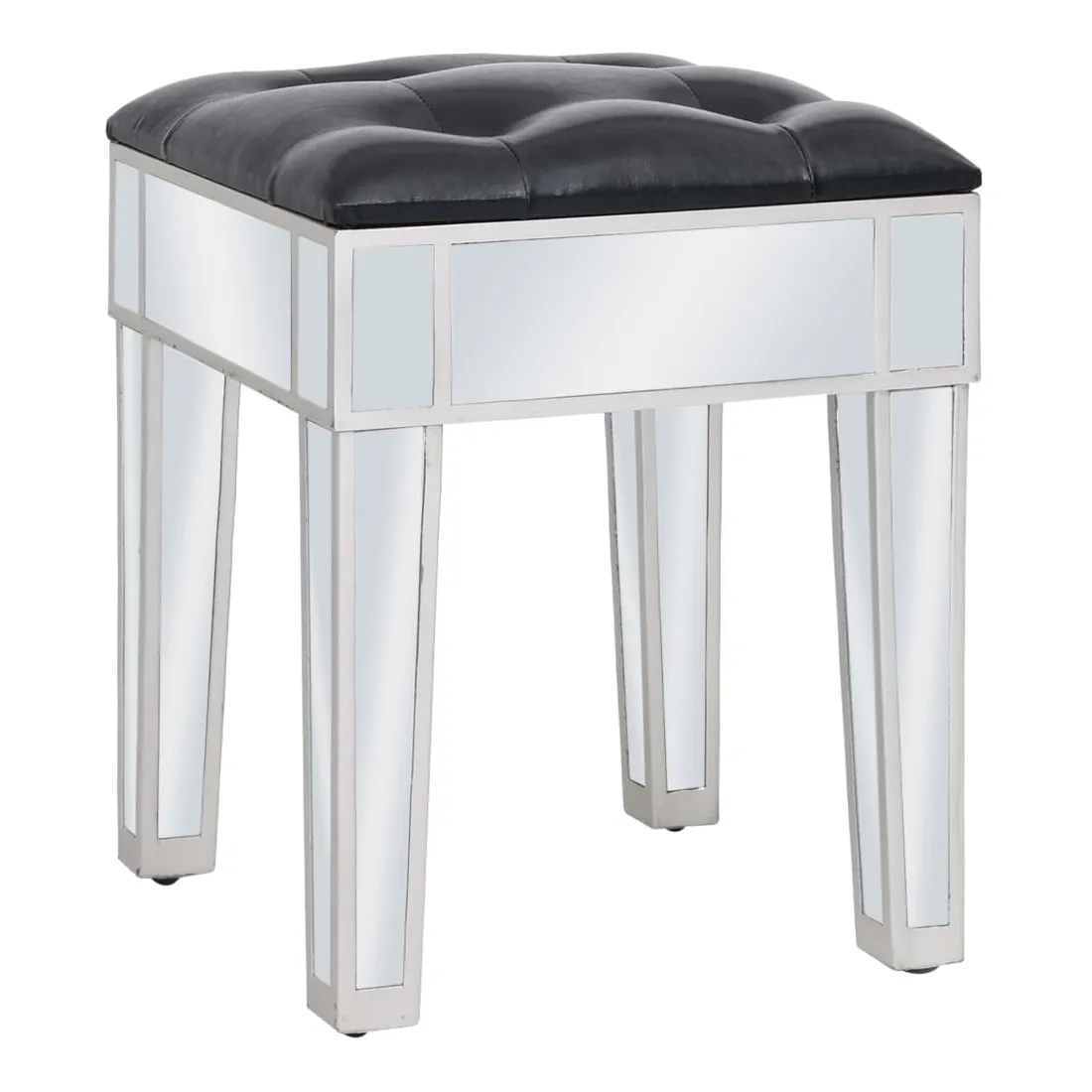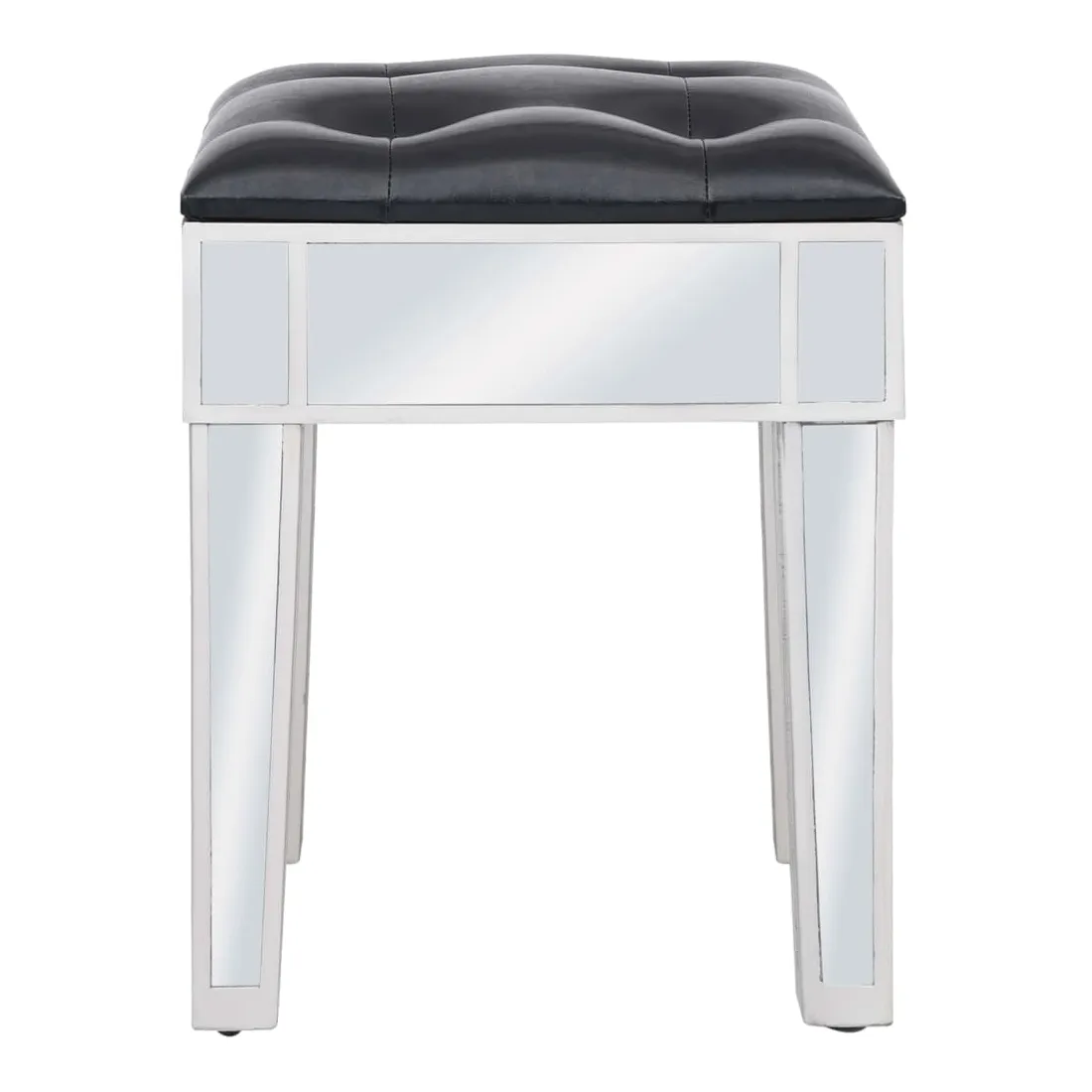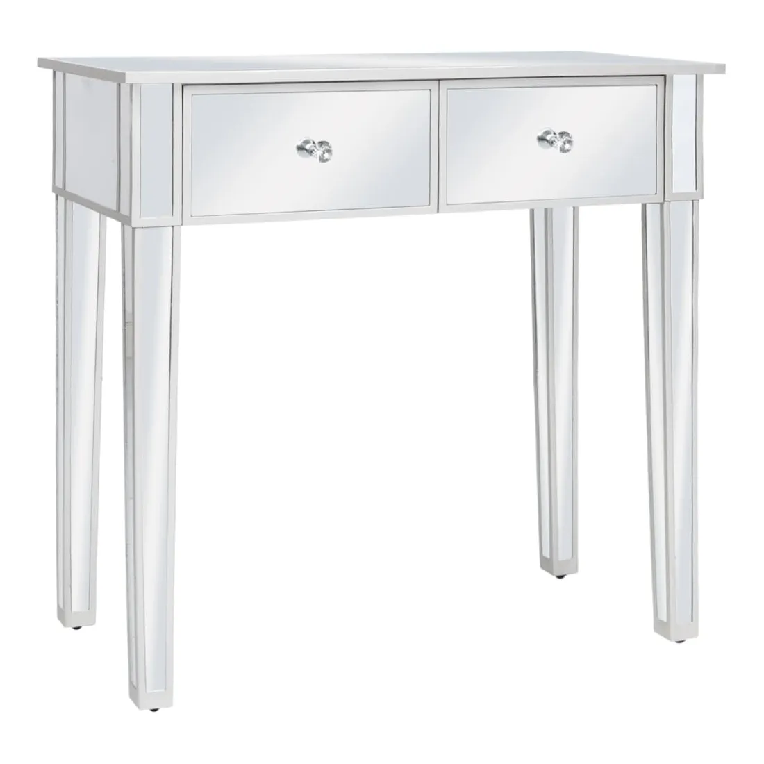 La coiffeuse miroir et le tabouret apporteront une touche d'élégance à votre décoration intérieure. L'ensemble de table de maquillage est orné de verre à effet miroir élégant et possède un aspect raffiné. La table de maquillage et le tabouret ont un cadre en MDF robuste. Les deux tiroirs offrent un espace pour garder toute sorte de petits objets rangés et à portée de main. La coiffeuse peut également être utilisée comme table console, meuble d'entrée, bureau, etc. Grâce à sa surface réfléchissante, l'ensemble de table embellira immédiatement votre intérieur et vous aidera à créer une sensation d'espace. Les poignées en faux cristal contribuent à son charme élégant et facilitent l’ouverture des tiroirs. Le siège est recouvert de cuir artificiel pour offrir un confort ultime et une touche de luxe. La table et le tabouret sont faciles à assembler.