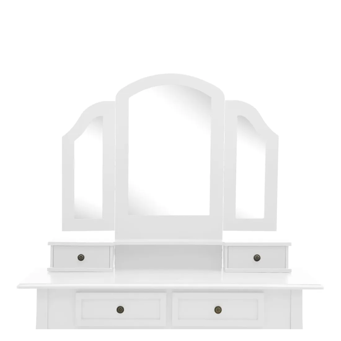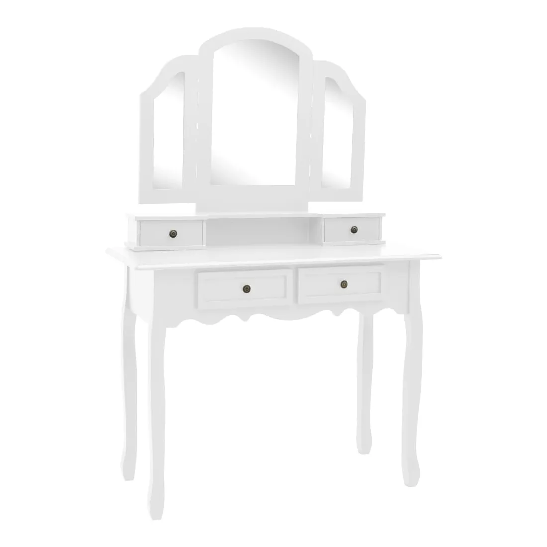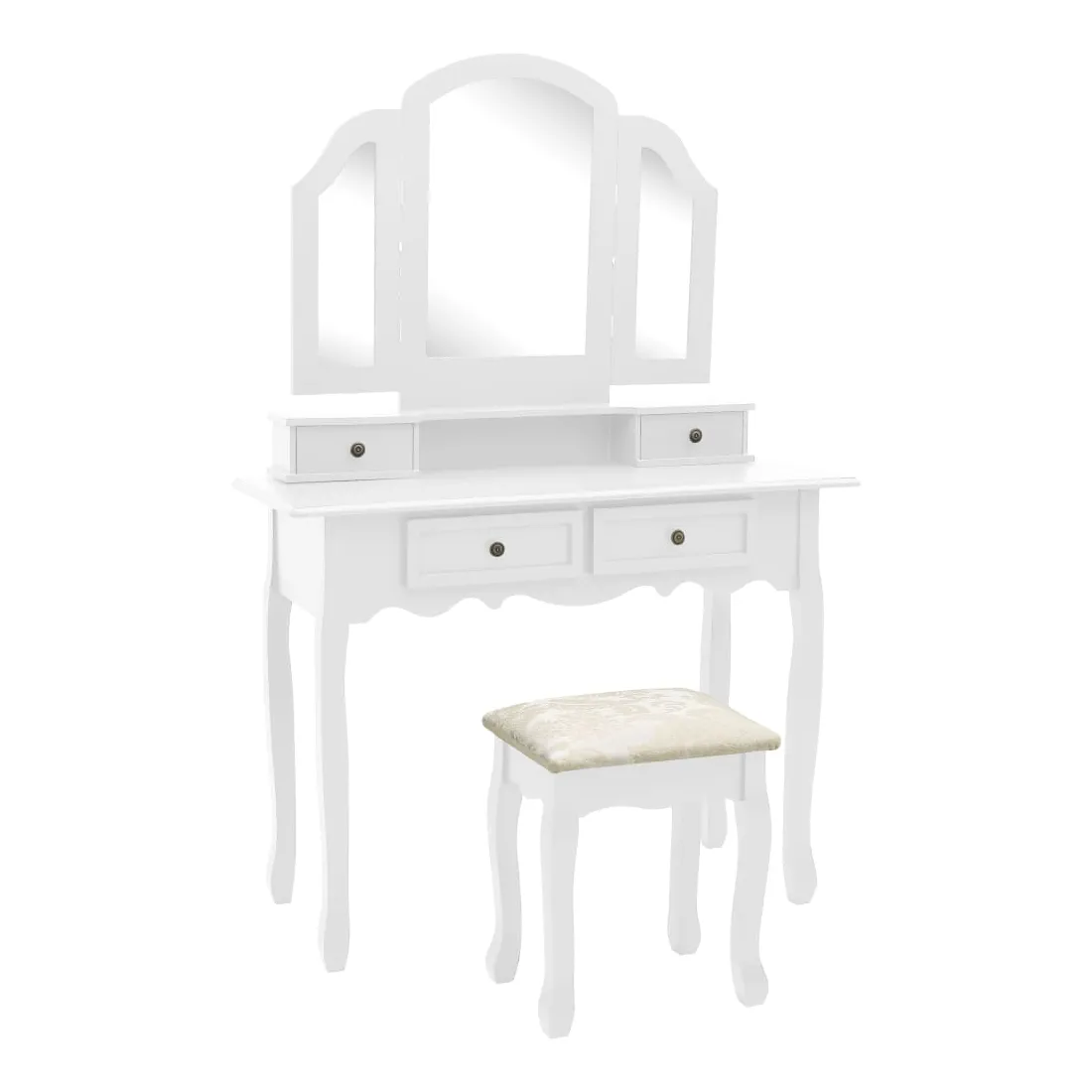 Notre ensemble charmant de coiffeuse et de tabouret est fabriqué en bois de paulownia de haute qualité. Son style victorien et sa finition blanche épurée sont conçus pour apporter de l'élégance et de la beauté à votre boudoir, salon personnel ou vestiaire. La finition exquise est une caractéristique exceptionnelle ajoutée de cet ensemble de table et de tabouret. Cette table de maquillage comprend un miroir de table 3 en 1, dont 2 miroirs latéraux sont pliables avec des charnières durables. Vous pouvez également les tourner à l'angle souhaité. Étonnamment, le cadre du miroir et la table peuvent être utilisés séparément. De plus, les 4 tiroirs chics vous offrent un espace supplémentaire pour vos ornements, cosmétiques et autres articles essentiels. Cet ensemble de table et de tabouret cosmétique attire certainement le regard, dans n'importe pièce.