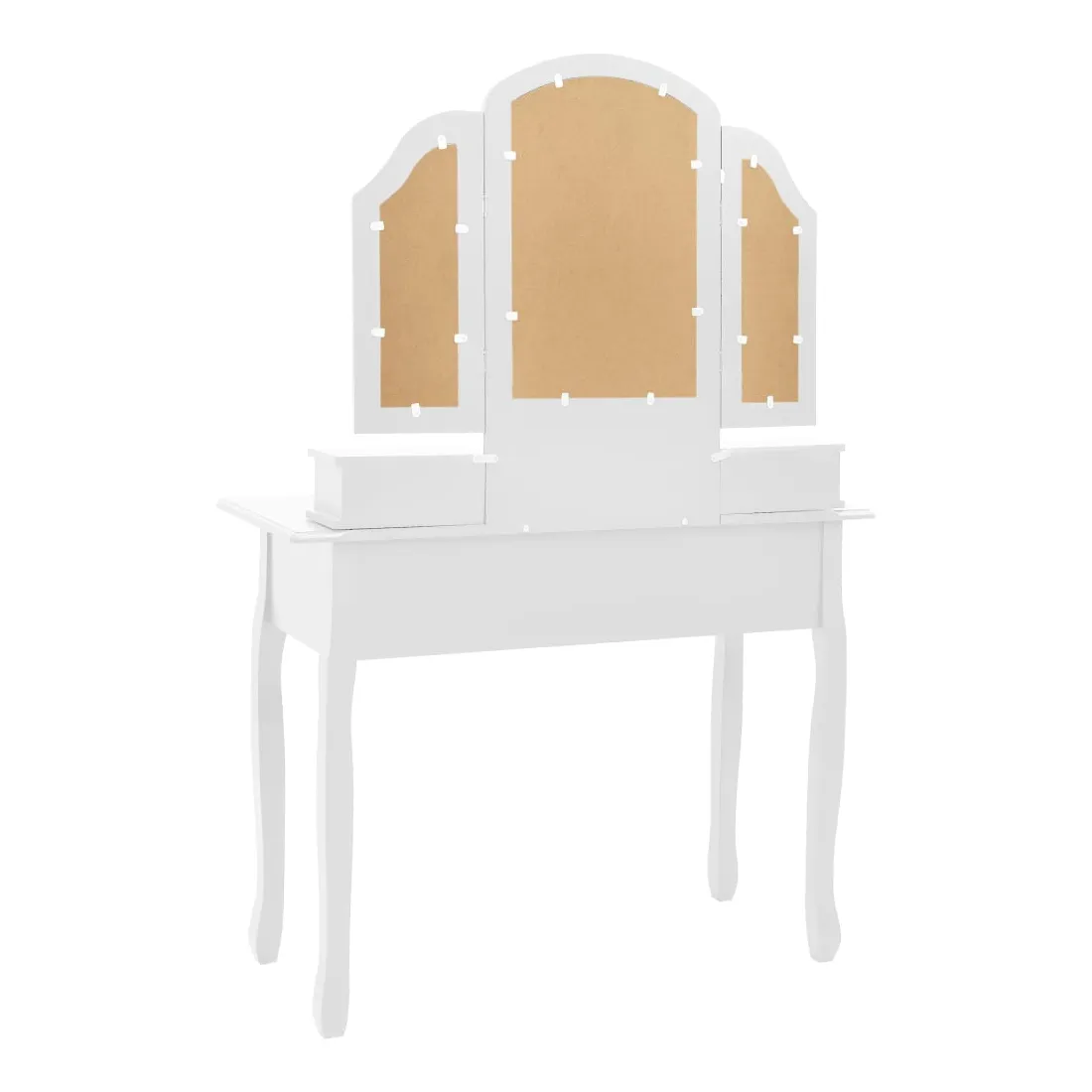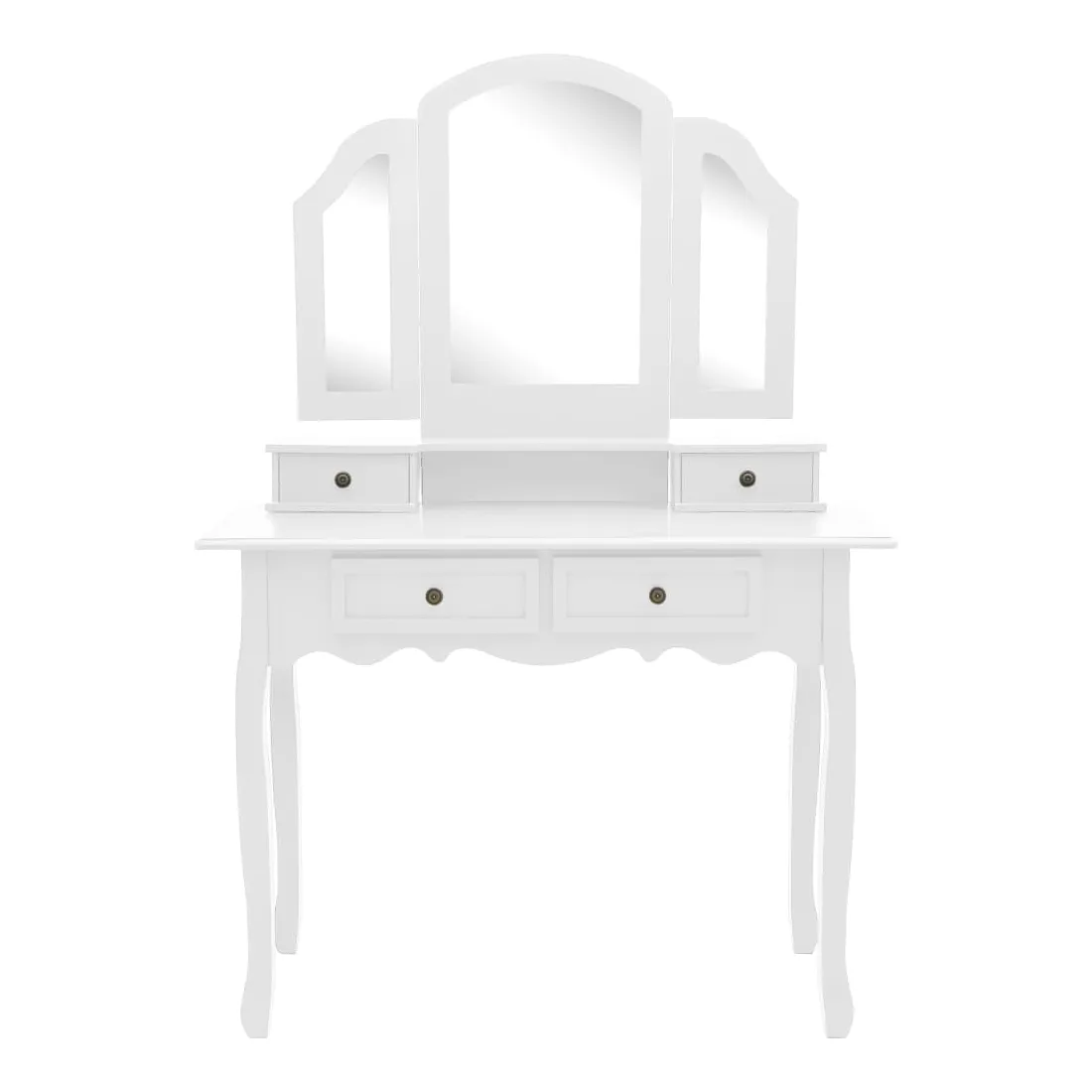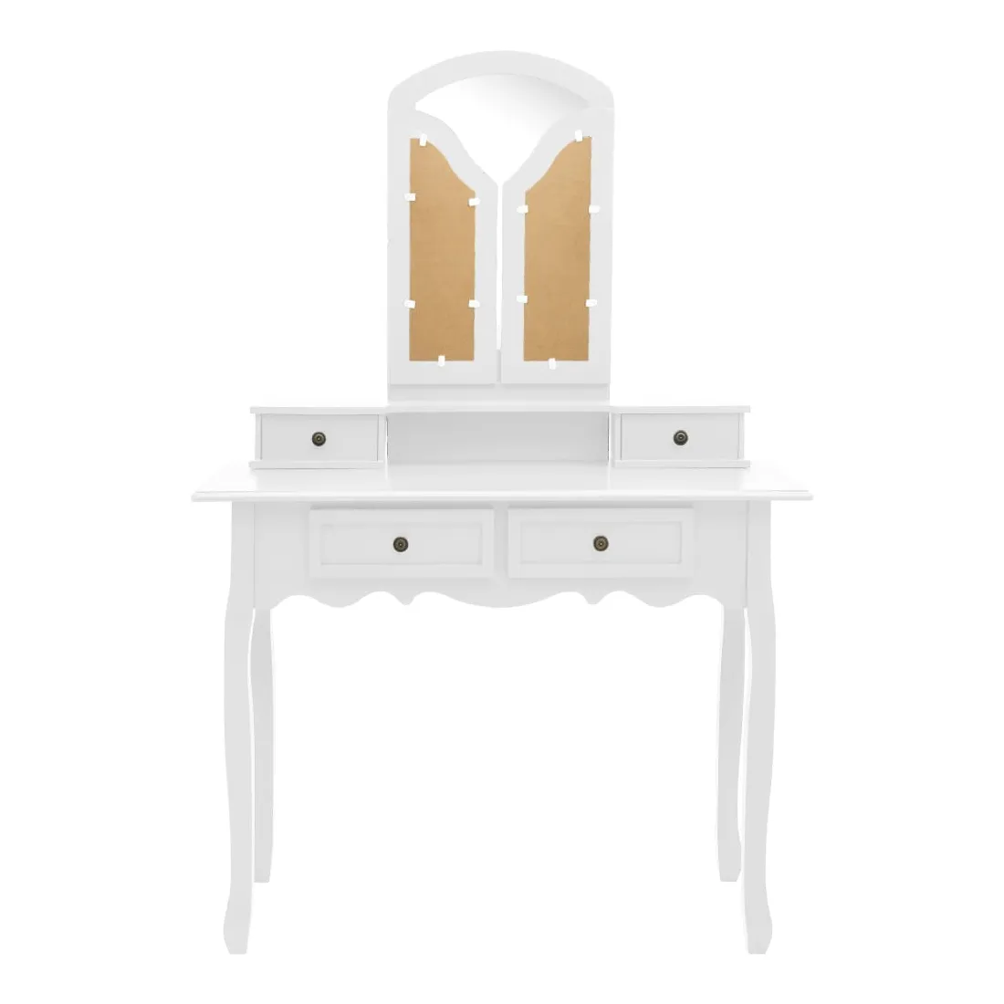 Notre ensemble charmant de coiffeuse et de tabouret est fabriqué en bois de paulownia de haute qualité. Son style victorien et sa finition blanche épurée sont conçus pour apporter de l'élégance et de la beauté à votre boudoir, salon personnel ou vestiaire. La finition exquise est une caractéristique exceptionnelle ajoutée de cet ensemble de table et de tabouret. Cette table de maquillage comprend un miroir de table 3 en 1, dont 2 miroirs latéraux sont pliables avec des charnières durables. Vous pouvez également les tourner à l'angle souhaité. Étonnamment, le cadre du miroir et la table peuvent être utilisés séparément. De plus, les 4 tiroirs chics vous offrent un espace supplémentaire pour vos ornements, cosmétiques et autres articles essentiels. Cet ensemble de table et de tabouret cosmétique attire certainement le regard, dans n'importe pièce.