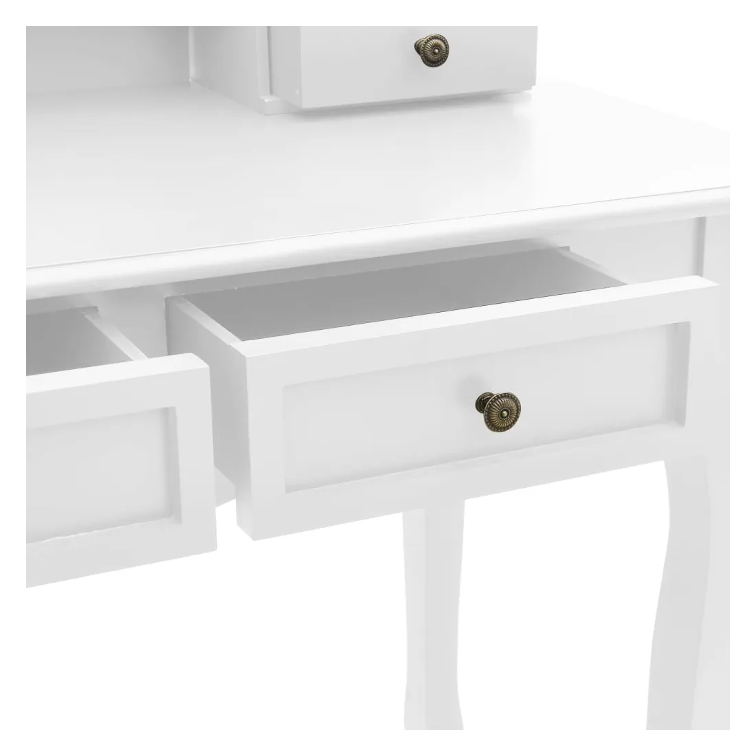 Notre ensemble charmant de coiffeuse et de tabouret est fabriqué en bois de paulownia de haute qualité. Son style victorien et sa finition blanche épurée sont conçus pour apporter de l'élégance et de la beauté à votre boudoir, salon personnel ou vestiaire. La finition exquise est une caractéristique exceptionnelle ajoutée de cet ensemble de table et de tabouret. Cette table de maquillage comprend un miroir de table 3 en 1, dont 2 miroirs latéraux sont pliables avec des charnières durables. Vous pouvez également les tourner à l'angle souhaité. Étonnamment, le cadre du miroir et la table peuvent être utilisés séparément. De plus, les 4 tiroirs chics vous offrent un espace supplémentaire pour vos ornements, cosmétiques et autres articles essentiels. Cet ensemble de table et de tabouret co